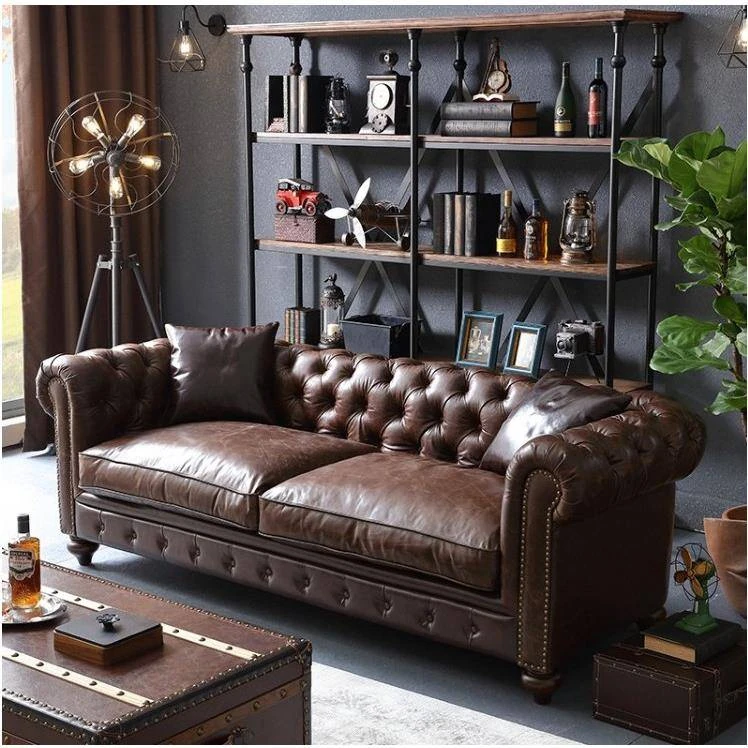 A10L American Country Style Leather Reclining Sofa - Vintage Waxed Leather Three-Seat for Small Apartments and Villas - Perfect for Cozy Living Rooms