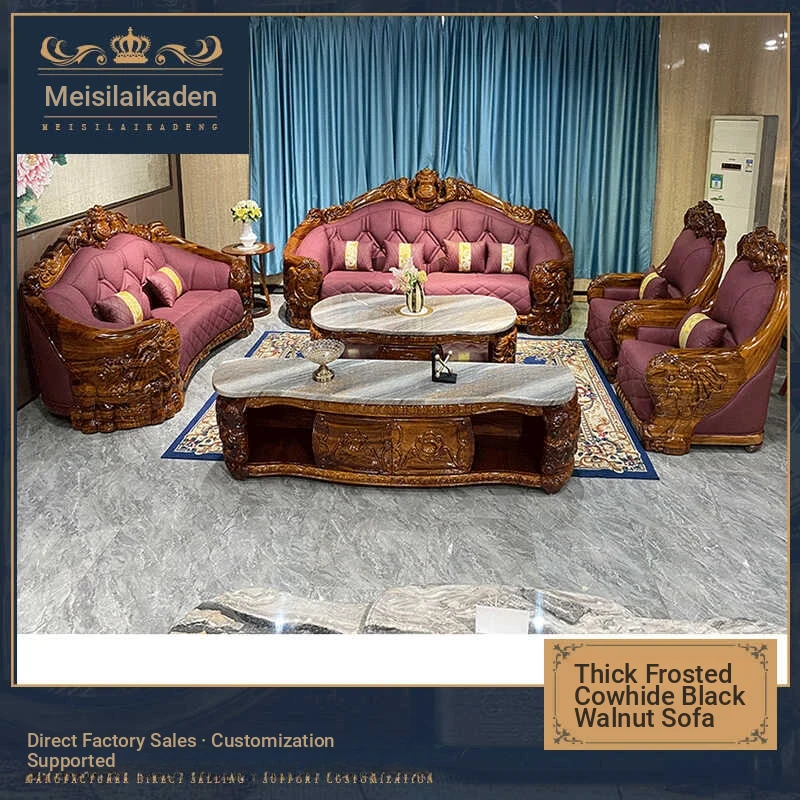 Myslaka European Style Solid Wood Sofa Set - Luxurious Carved Black Gold Wood for Villas - Perfect for Spacious Living Rooms - 1125 Series