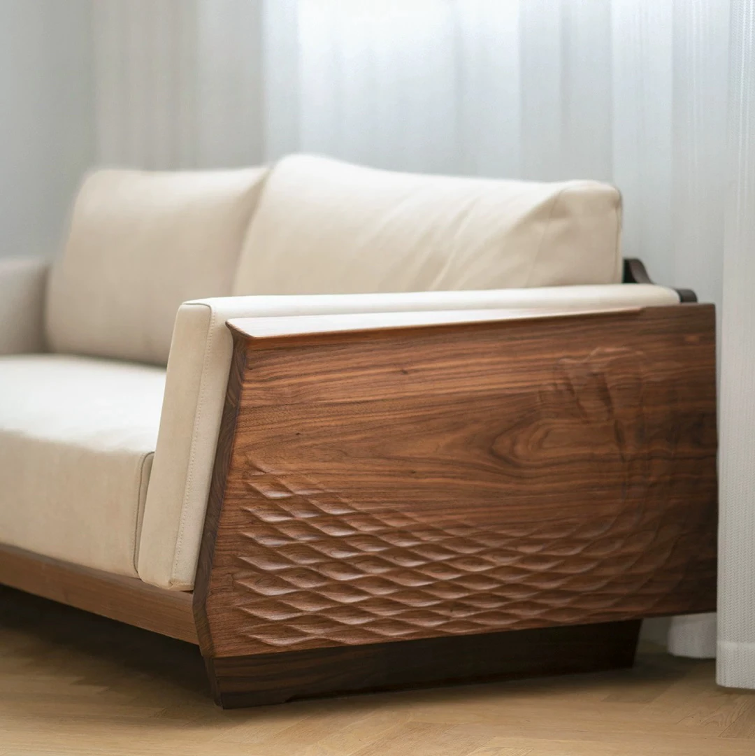 Vintage Black Walnut Solid Wood Carved Sofa - Elegant Minimalist Fabric Sofa for Small Living Rooms in Wabi-Sabi Style