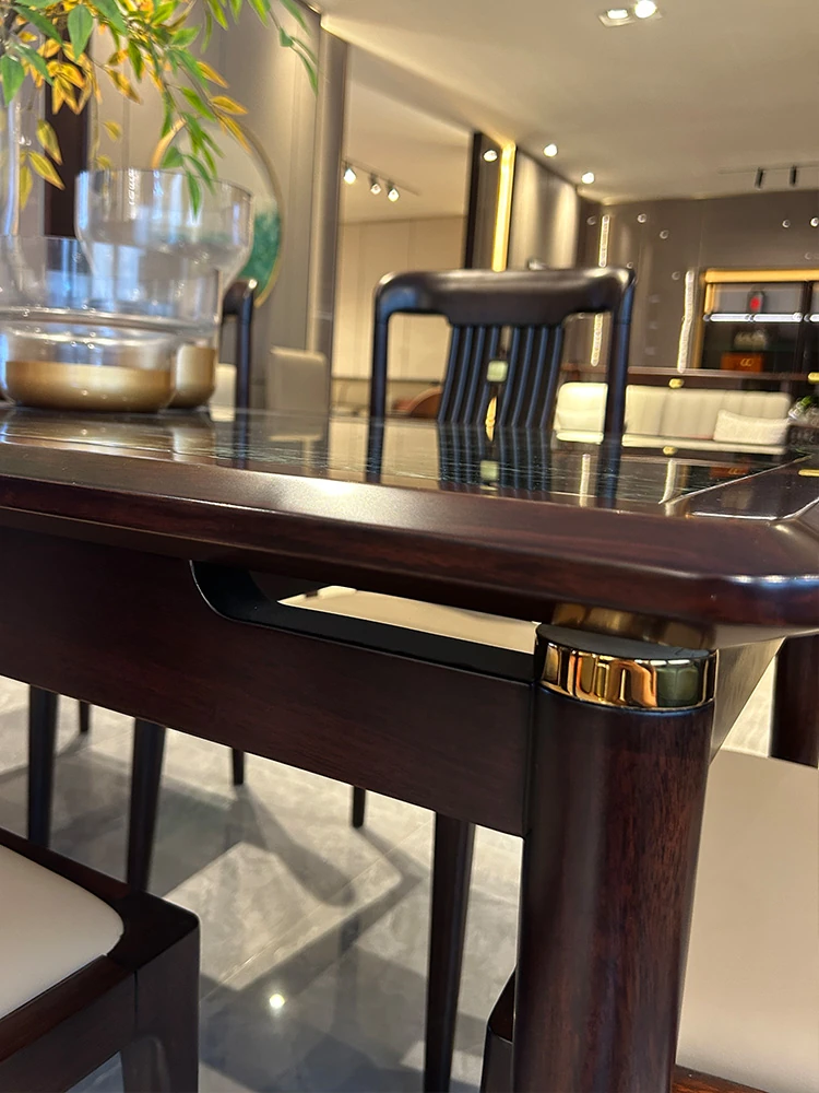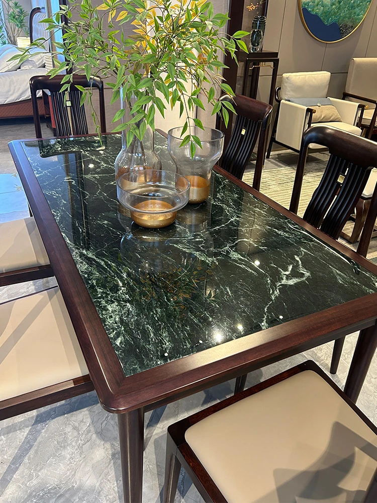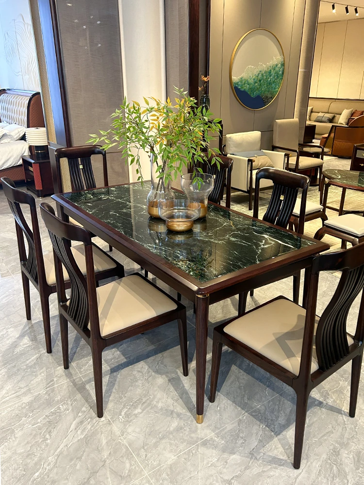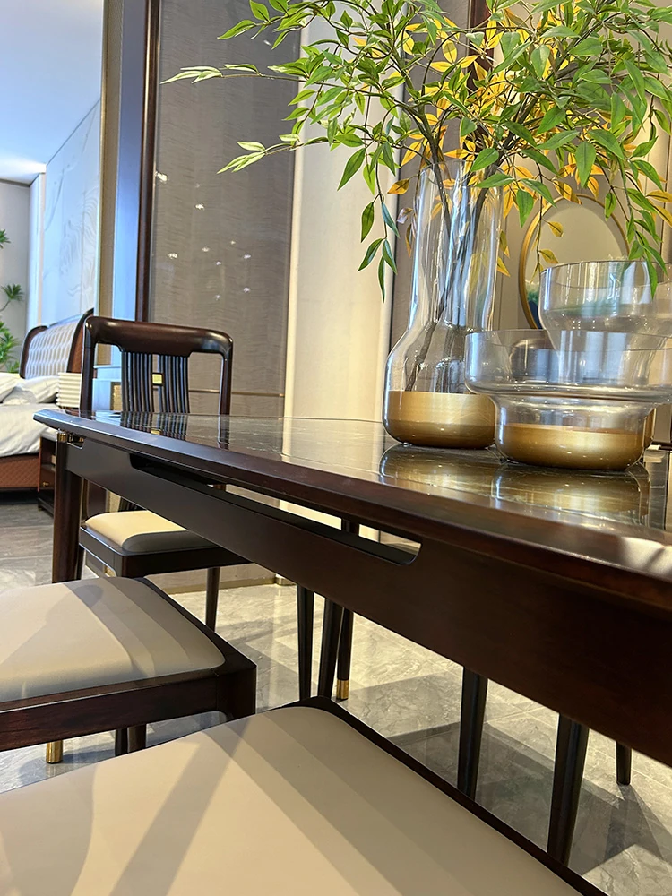 Elegant New Chinese Style Long Dining Table with Solid Wood and Rock Plate - Modern Luxury Home Furniture Set with Chairs, Perfect for Sophisticated Dining Experiences