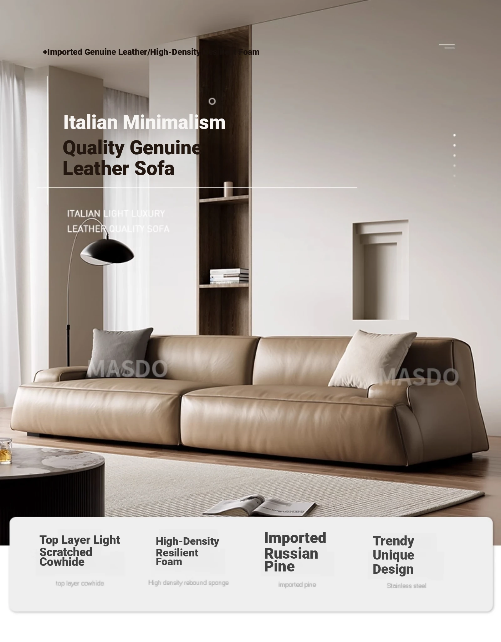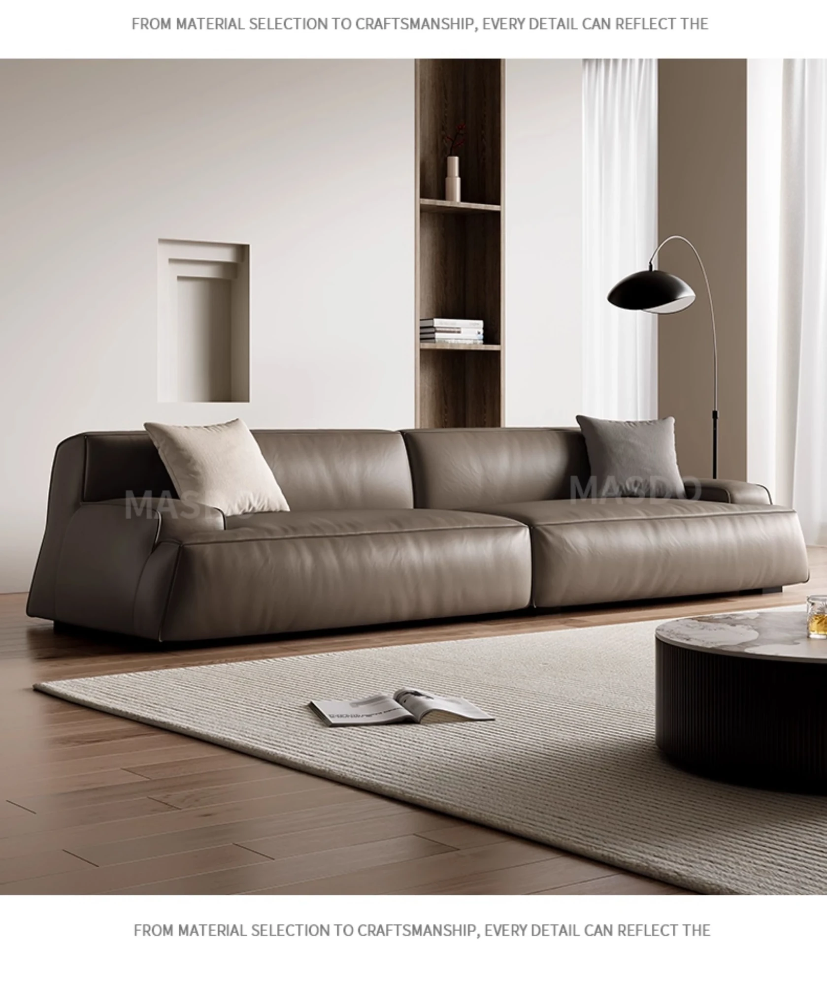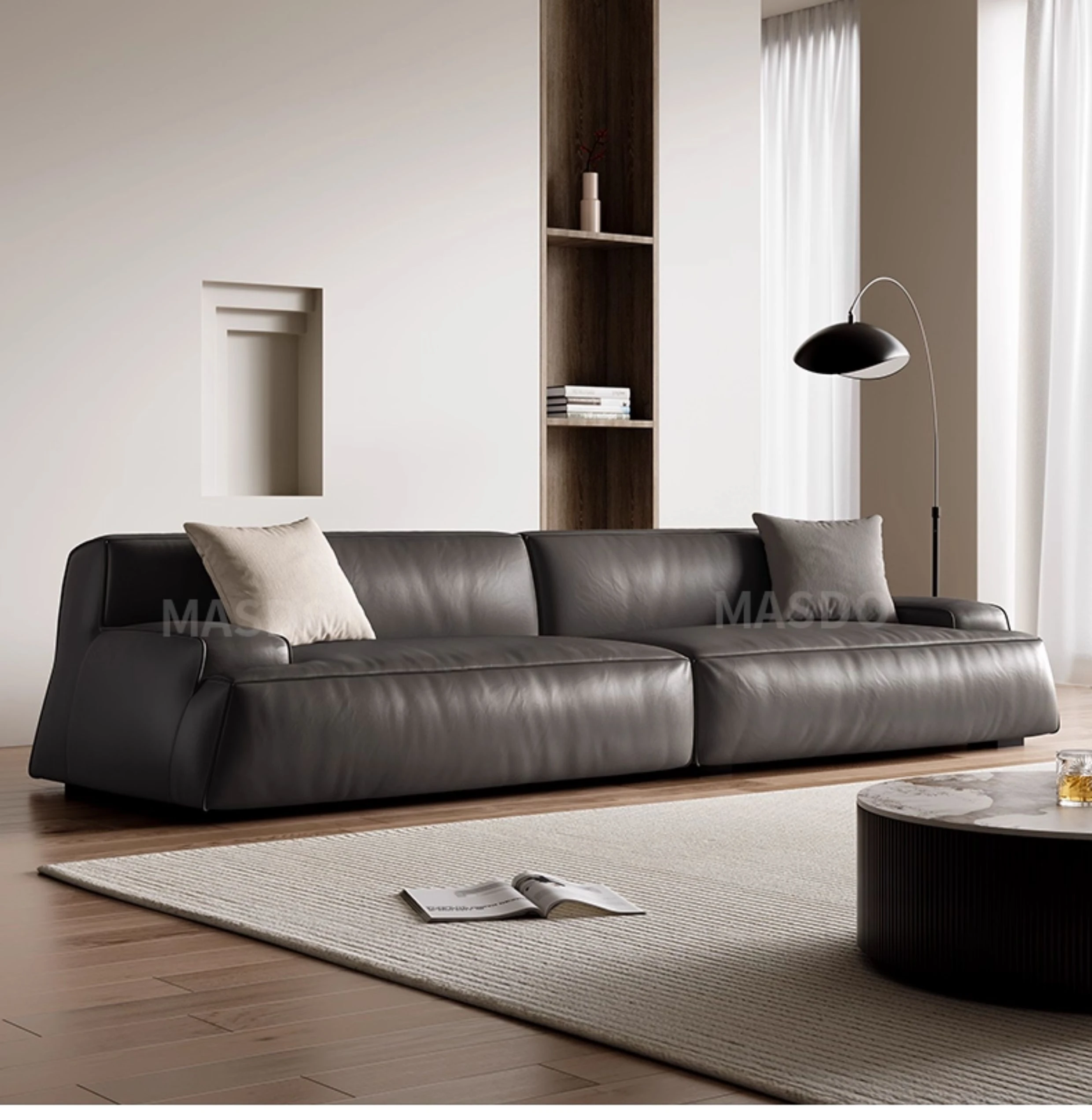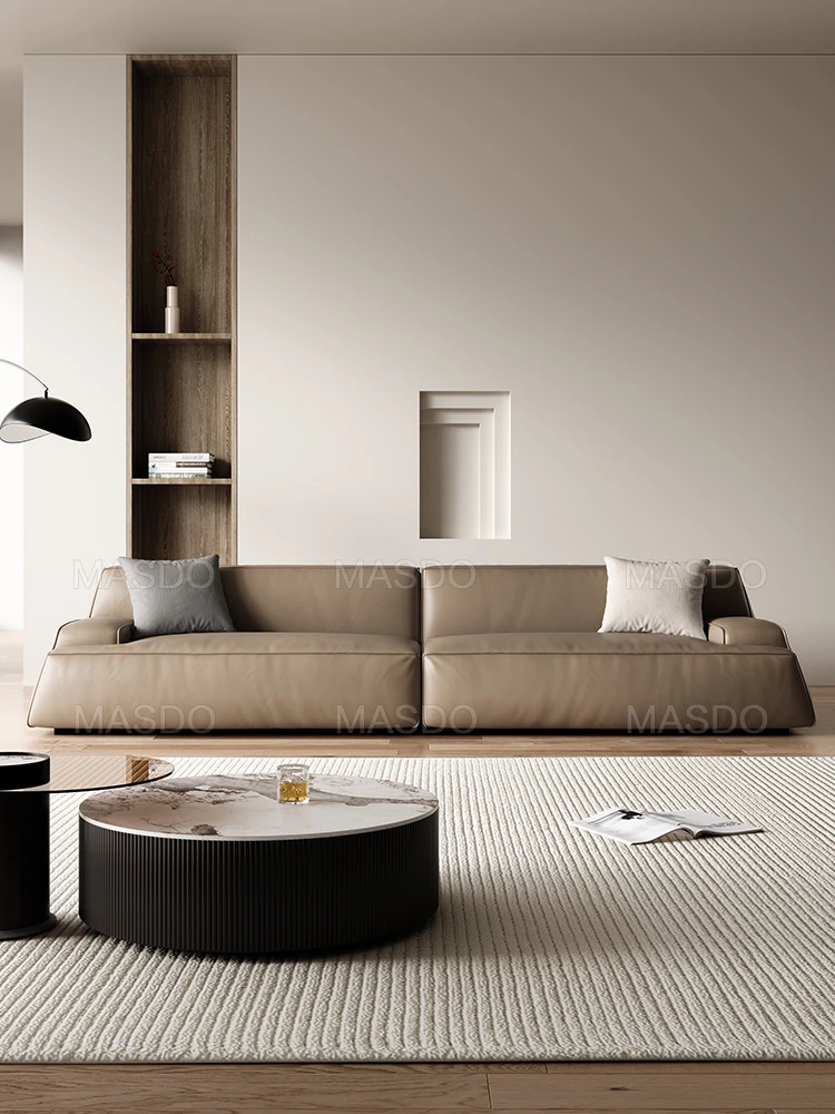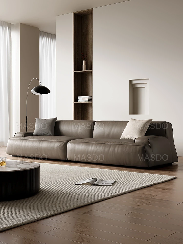 Elegant Scandinavian Style Four-Seat Sofa in Genuine Damascus Leather - Minimalist Italian Design with Down Filling for a Cozy Wabi-Sabi Atmosphere