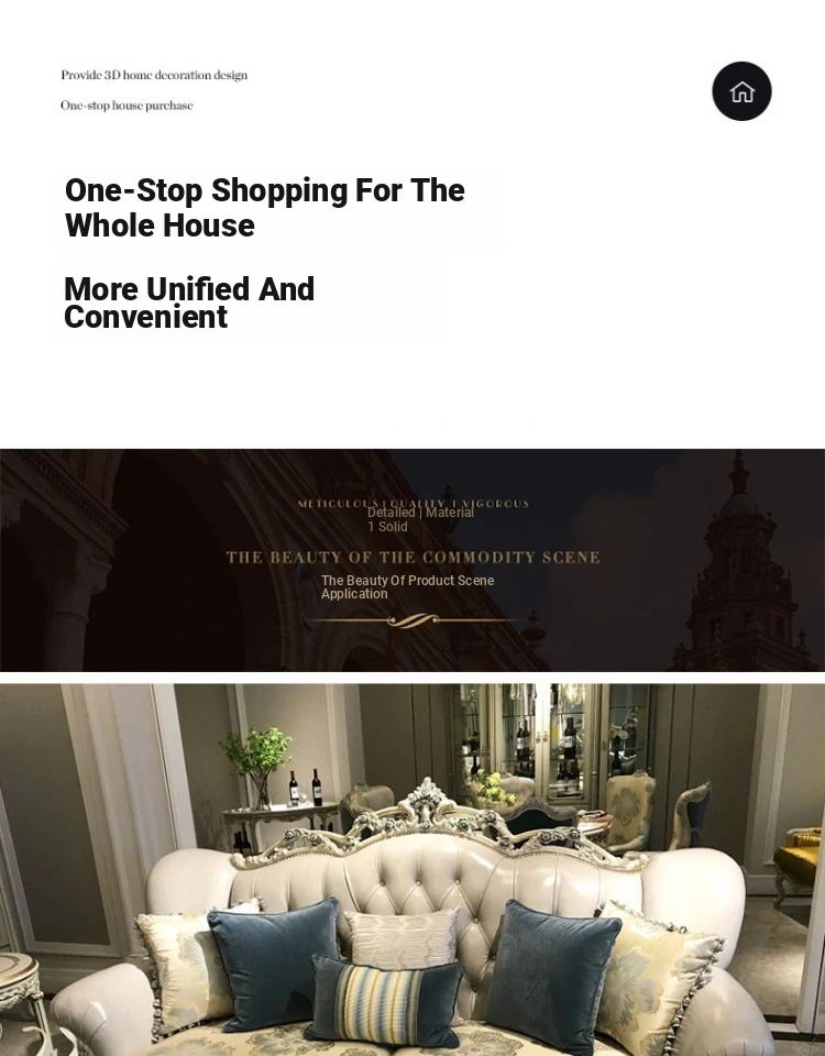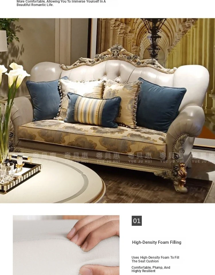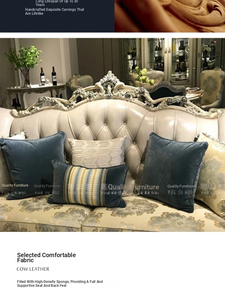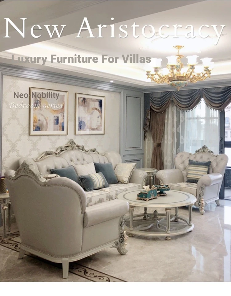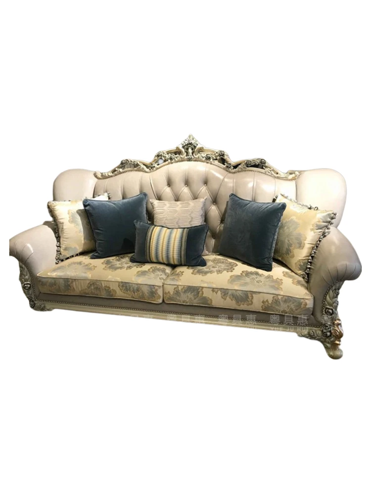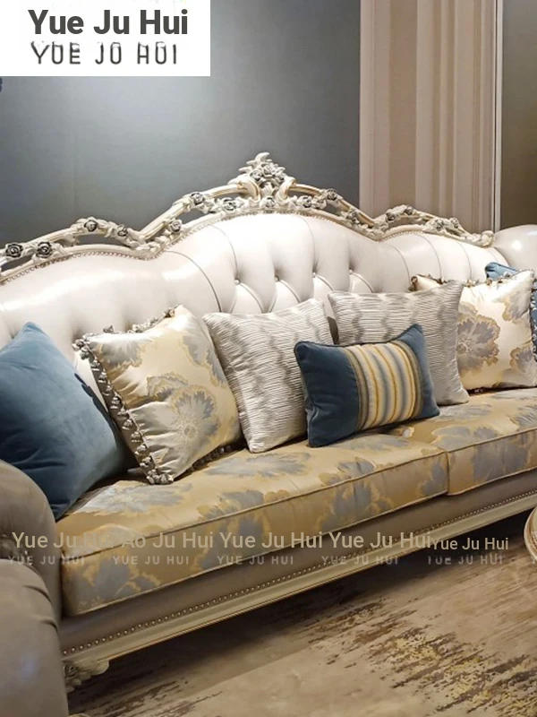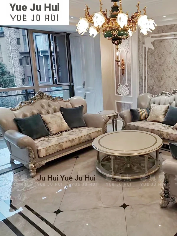 French Luxury Living Room Set - Premium Top Grain Leather, Classic Solid Wood Carved Single, Double, and Triple Sofas for Spacious Homes