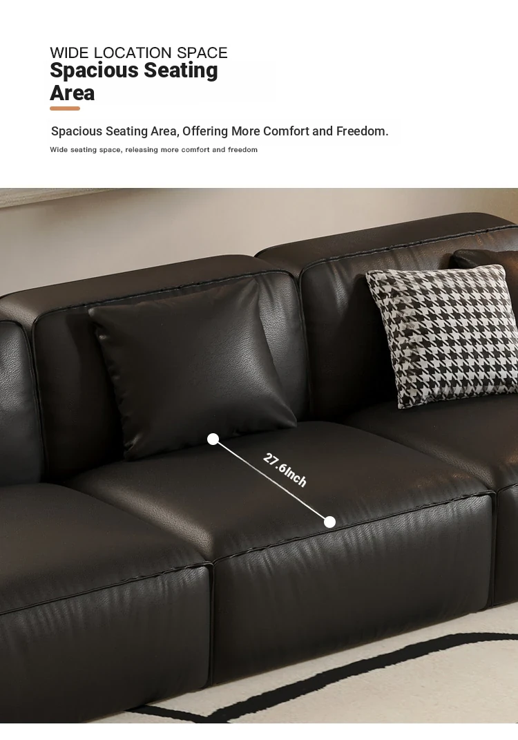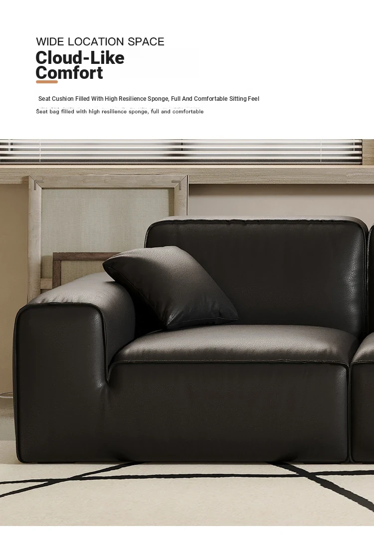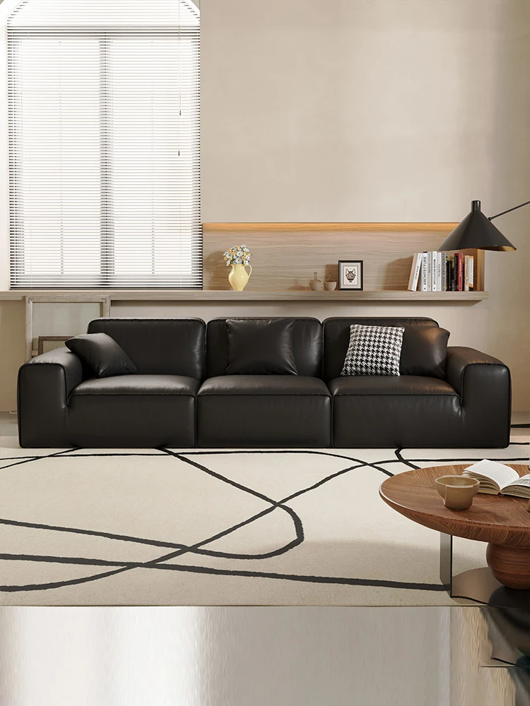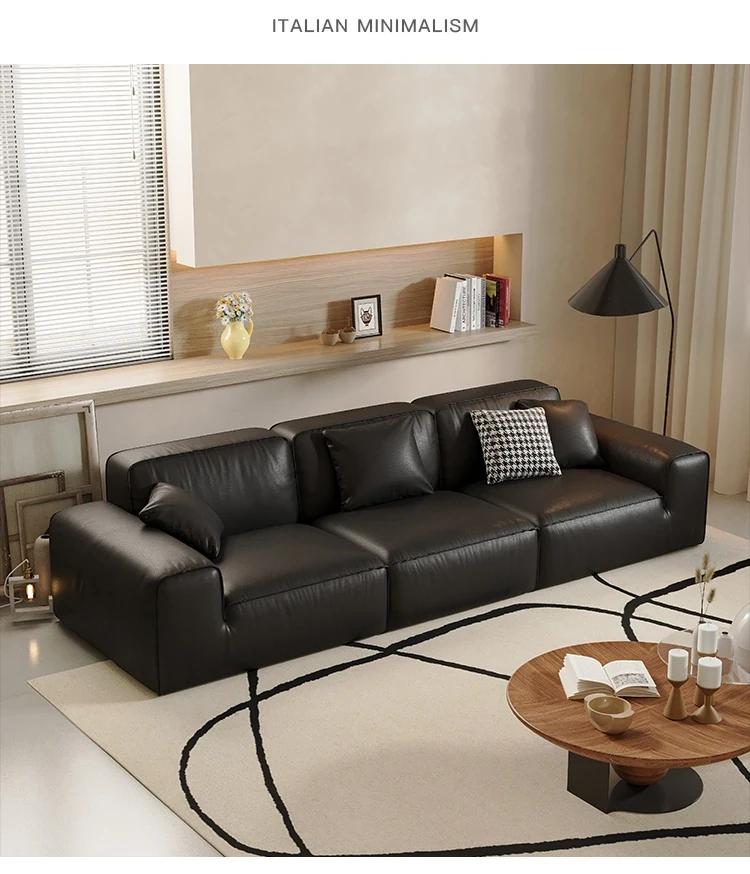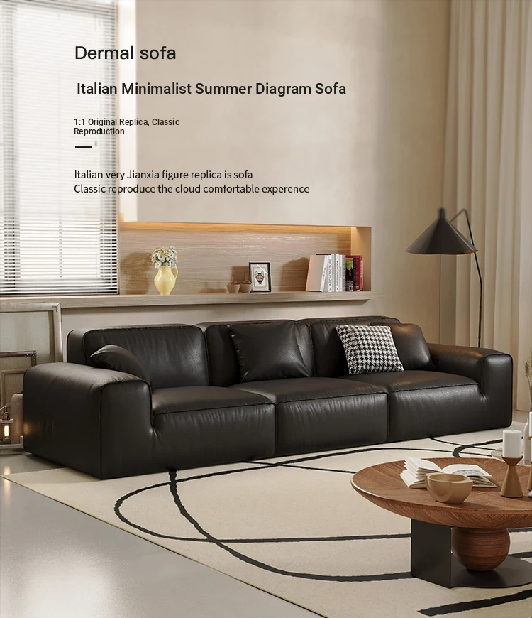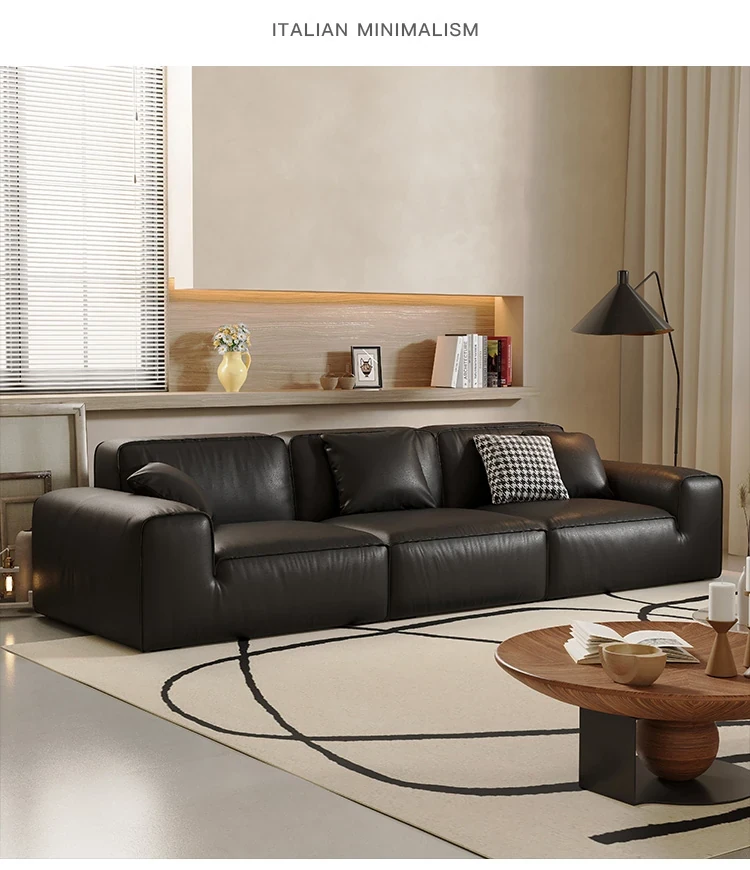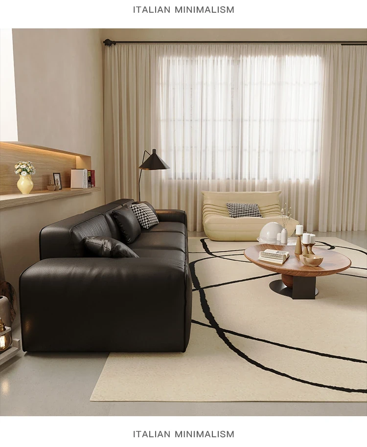 Italian Leather Sofa - Luxurious Black Cowhide Design for Small Living Rooms, Minimalist Cream Aesthetic, Direct Line Style, Perfect for Modern Homes.