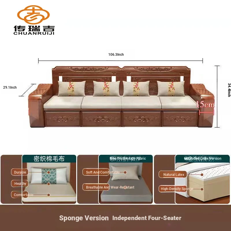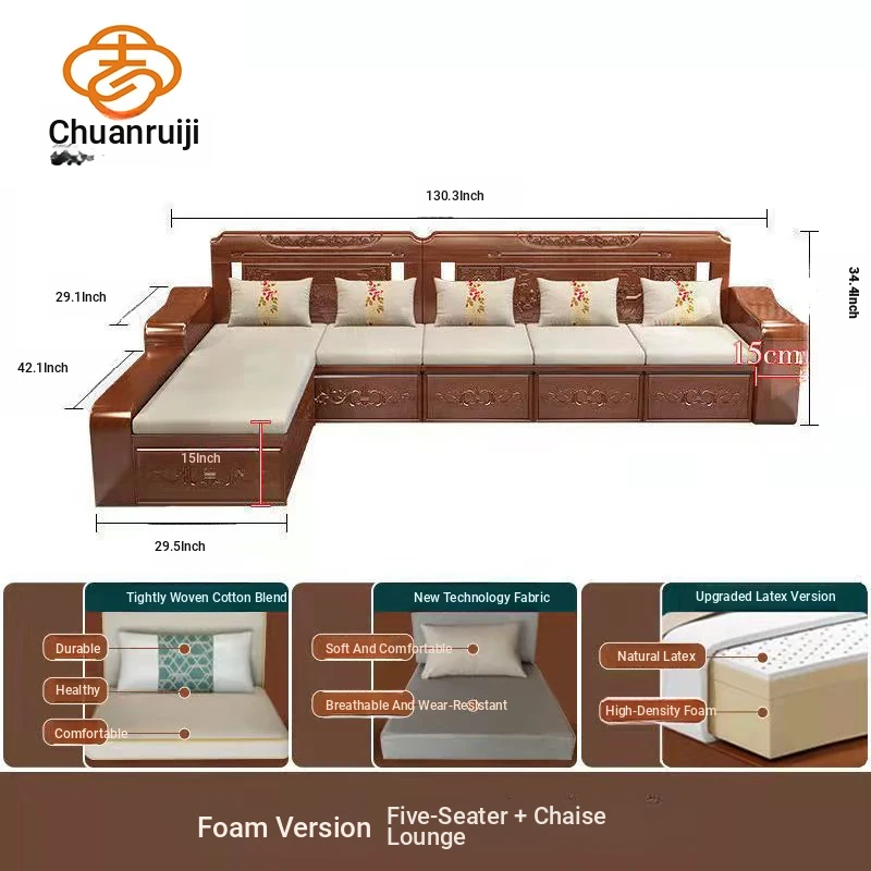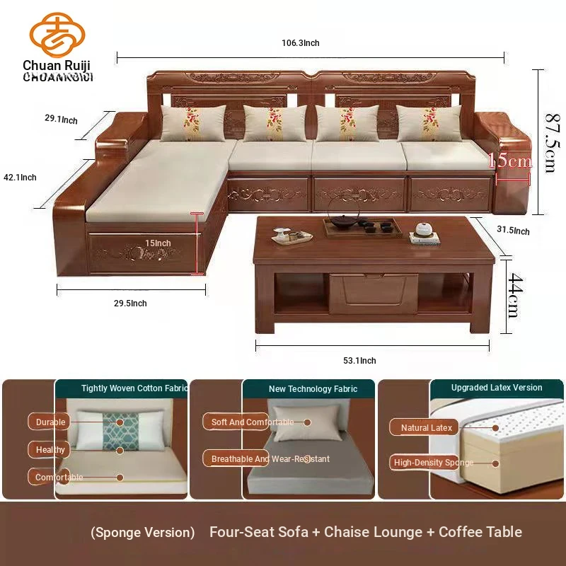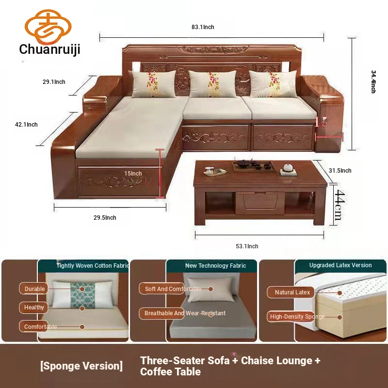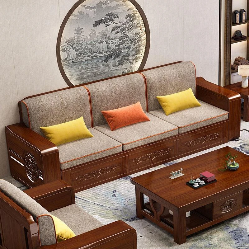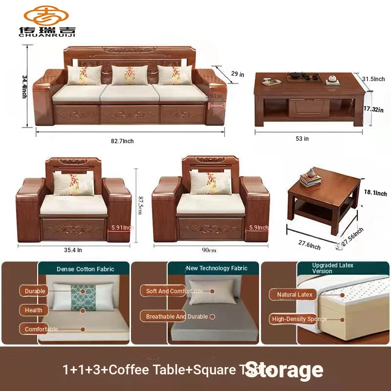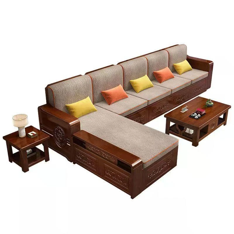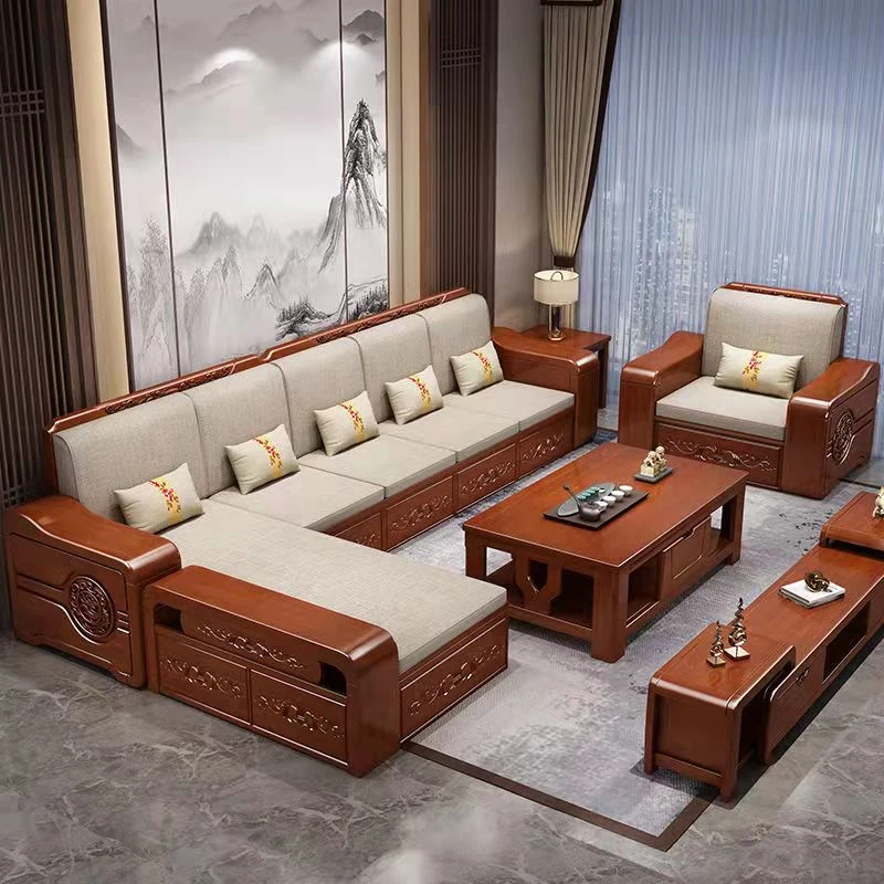 Modern Chinese Solid Wood Sofa Set – Minimalist Design for Spacious Villas, Perfect for Year-Round Use with Storage Chaise Lounge. Ideal for Stylish Living Rooms!