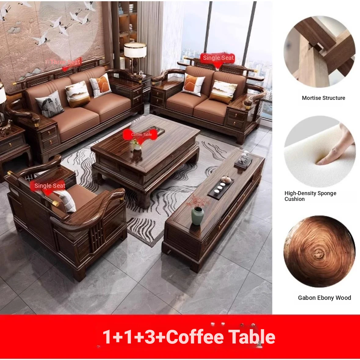[Ebony wood] 1+1+3 + tea table + square * 2