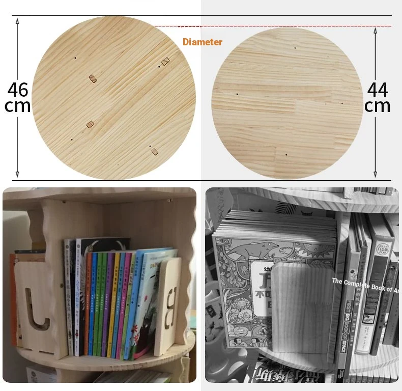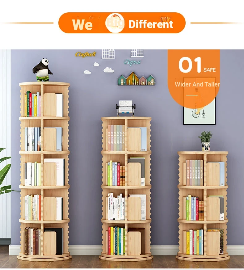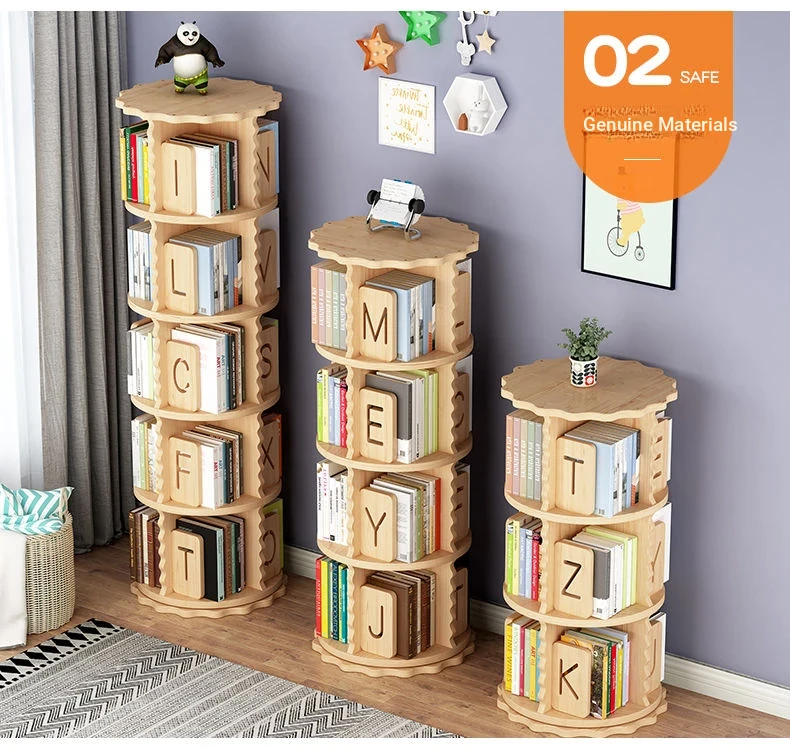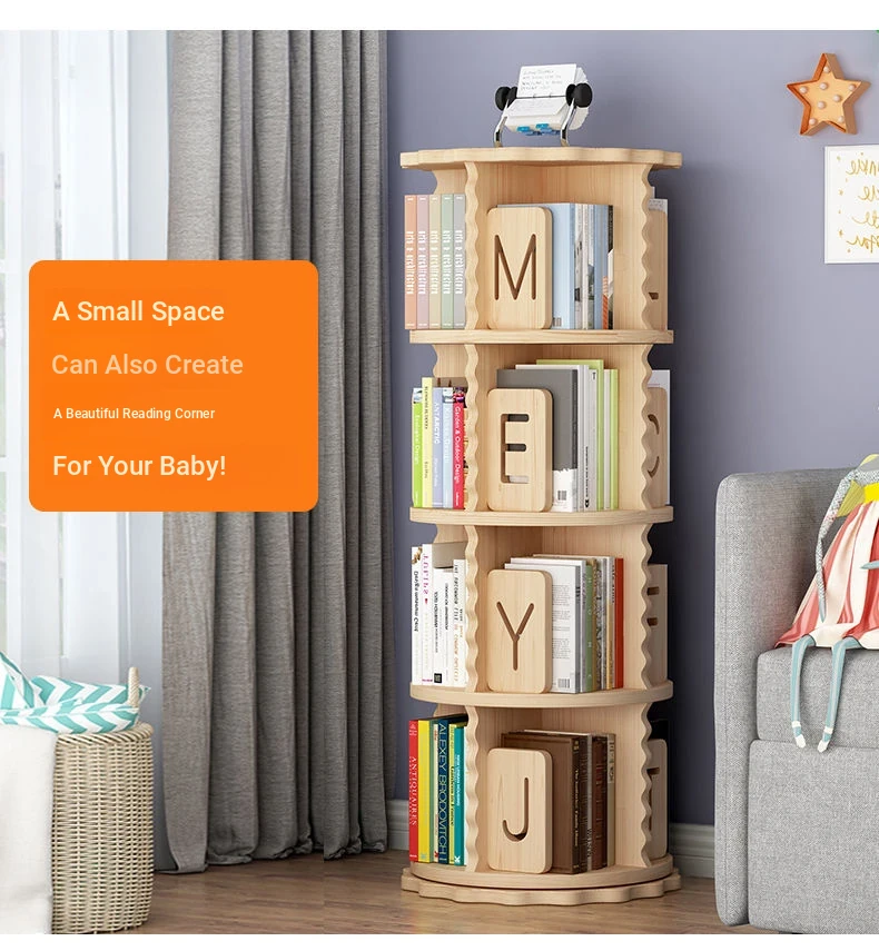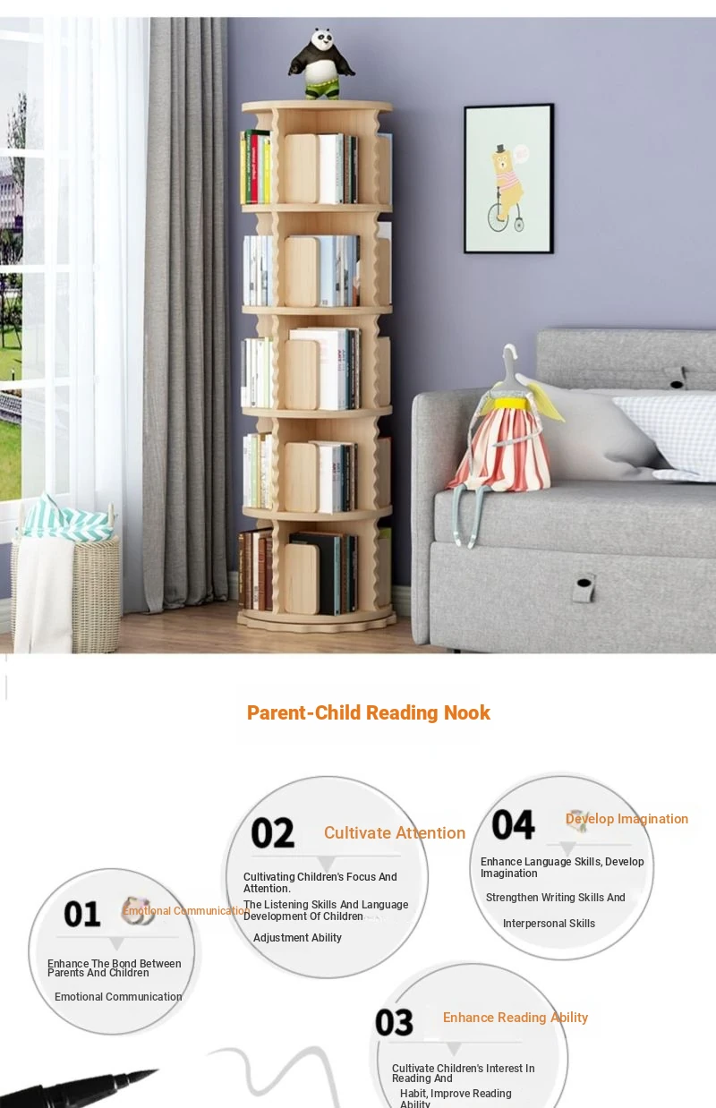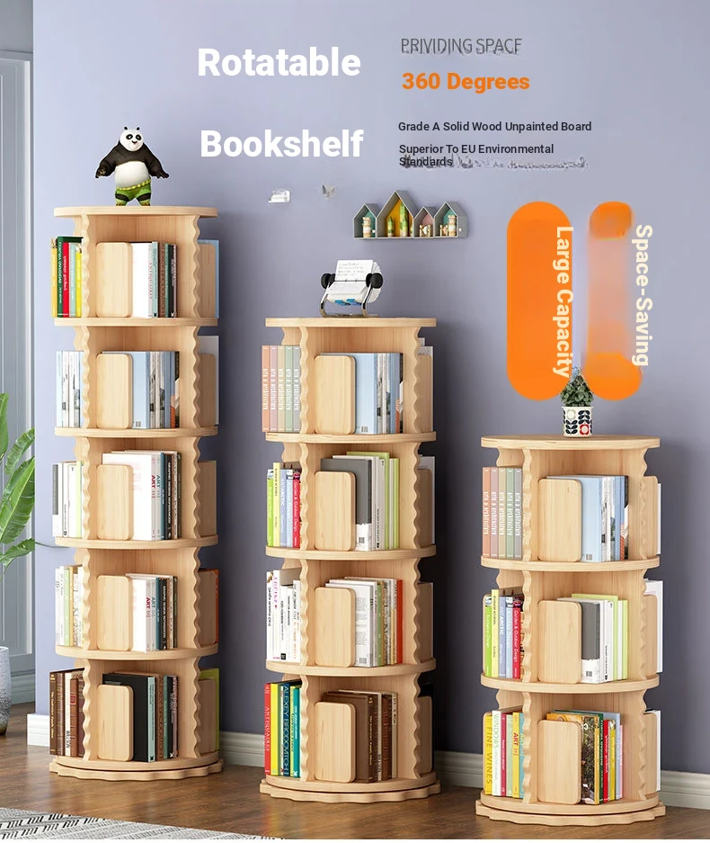 Solid Wood Rotating Bookshelf - Minimalist Floor Standing Design for Home Use, Perfect for Children's Picture Books and Storage, 360-Degree Small Bookcase for Student Bedrooms.