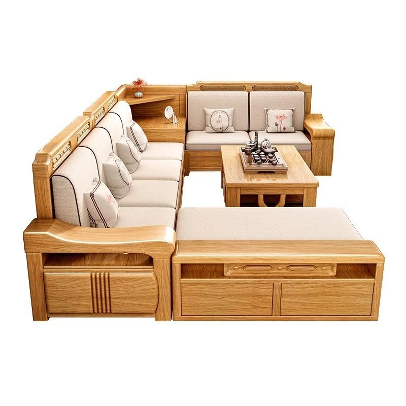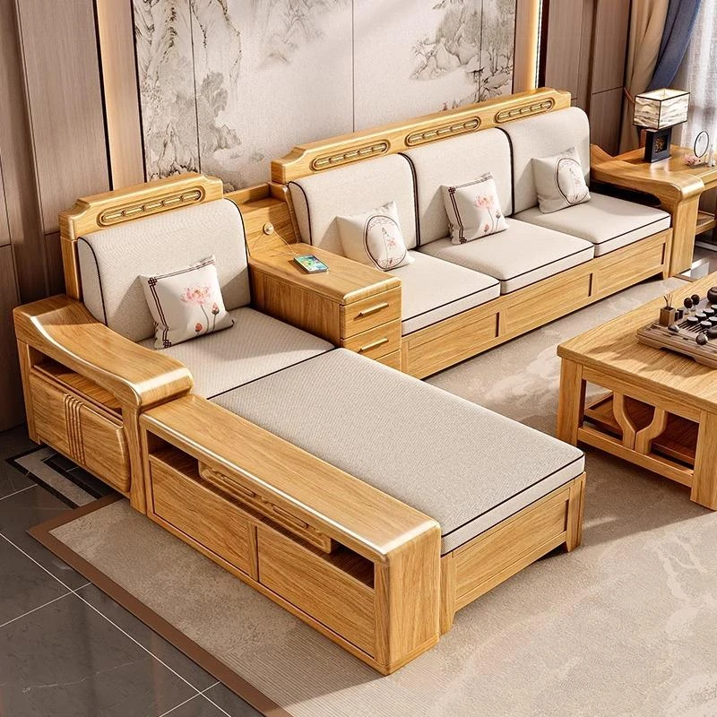 Solid Wood Sofa - Modern Chinese Style Living Room Furniture for Small Spaces, Versatile for Winter and Summer, Corner Design with Storage, Natural Wood Finish