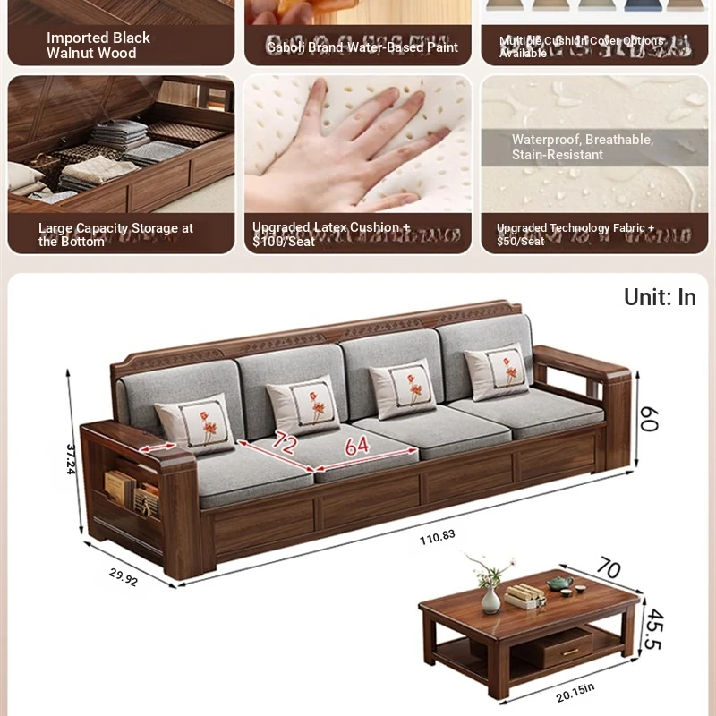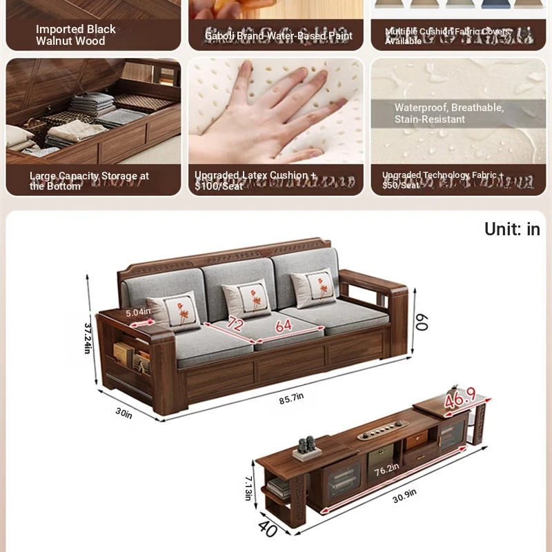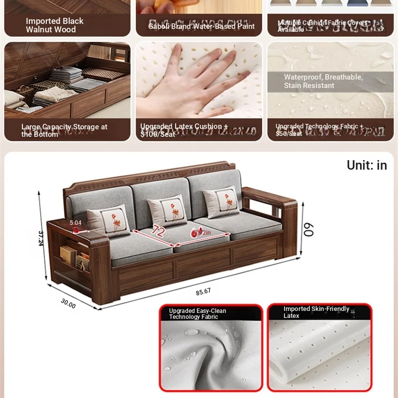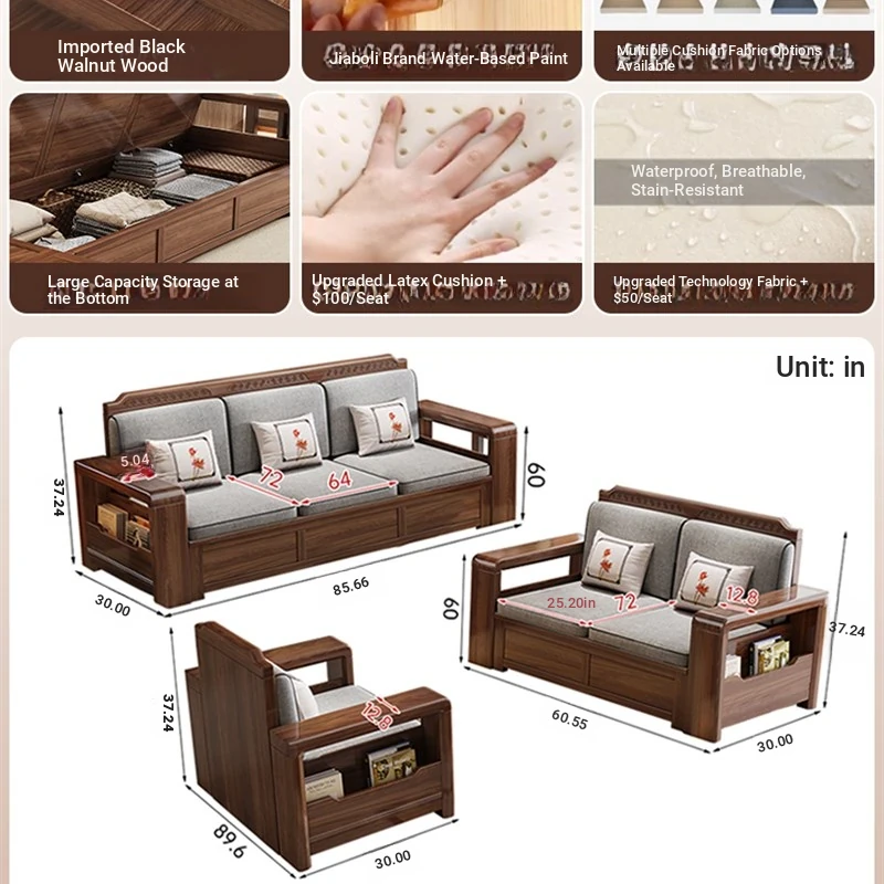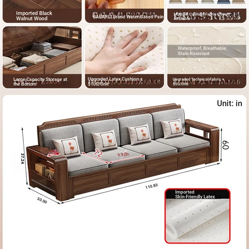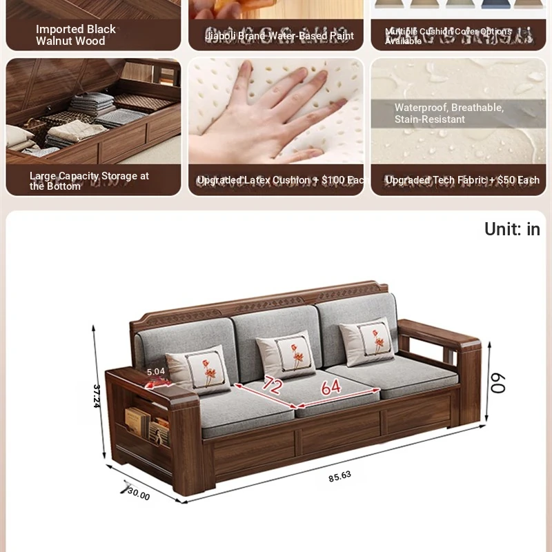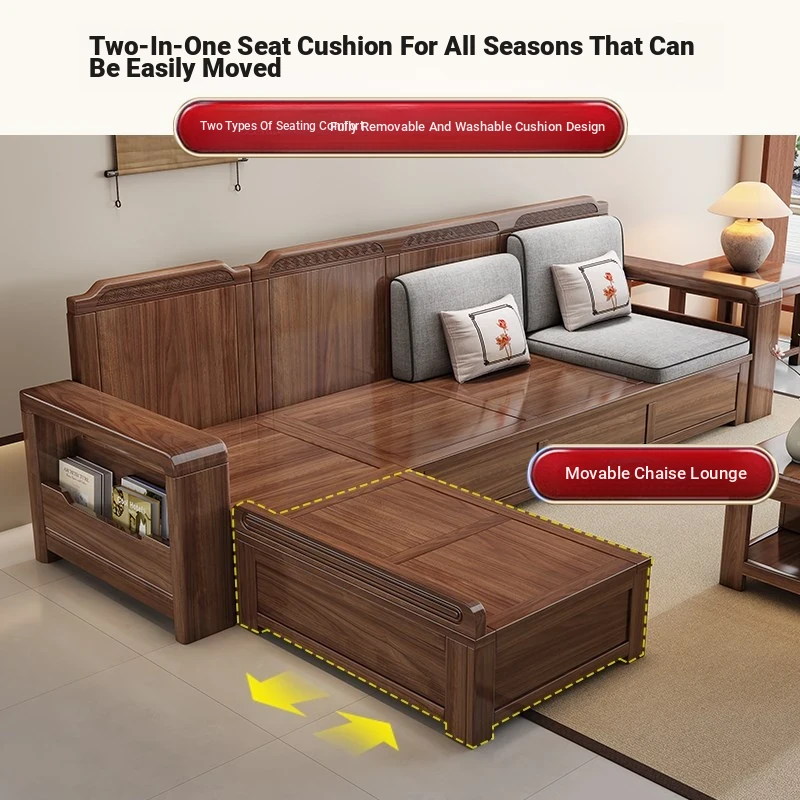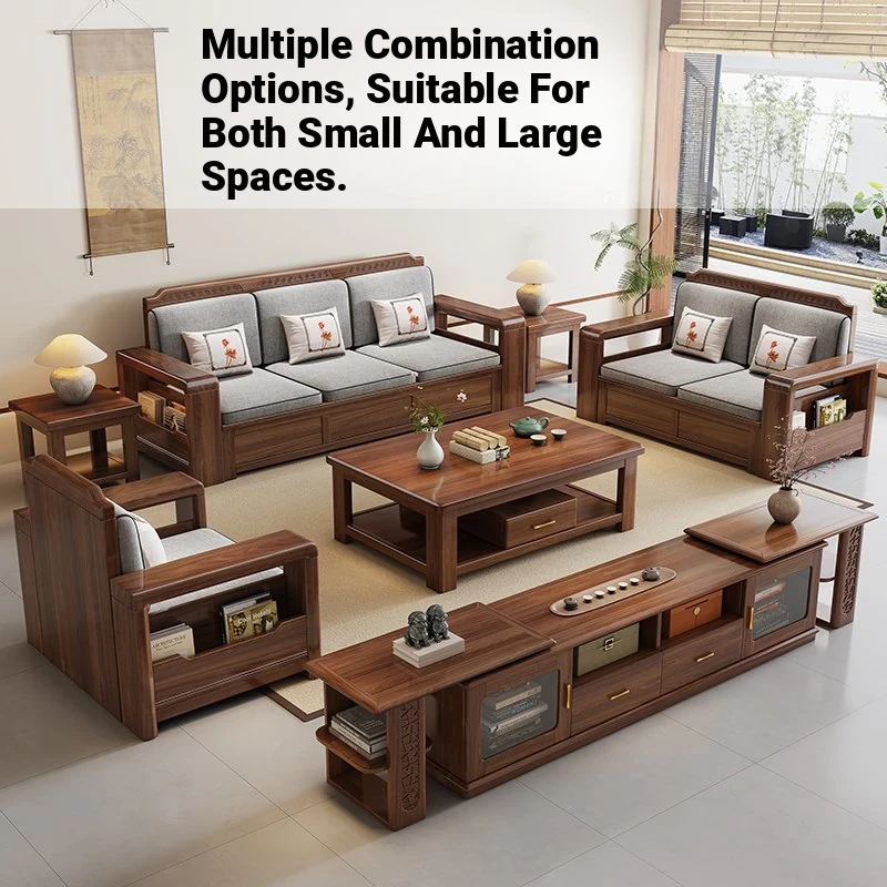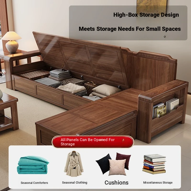Trendy New Chinese Style Black Walnut Solid Wood Sofa - All-Season Multipurpose Storage Sofa for Living Room - Factory Direct Offer