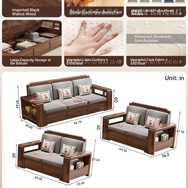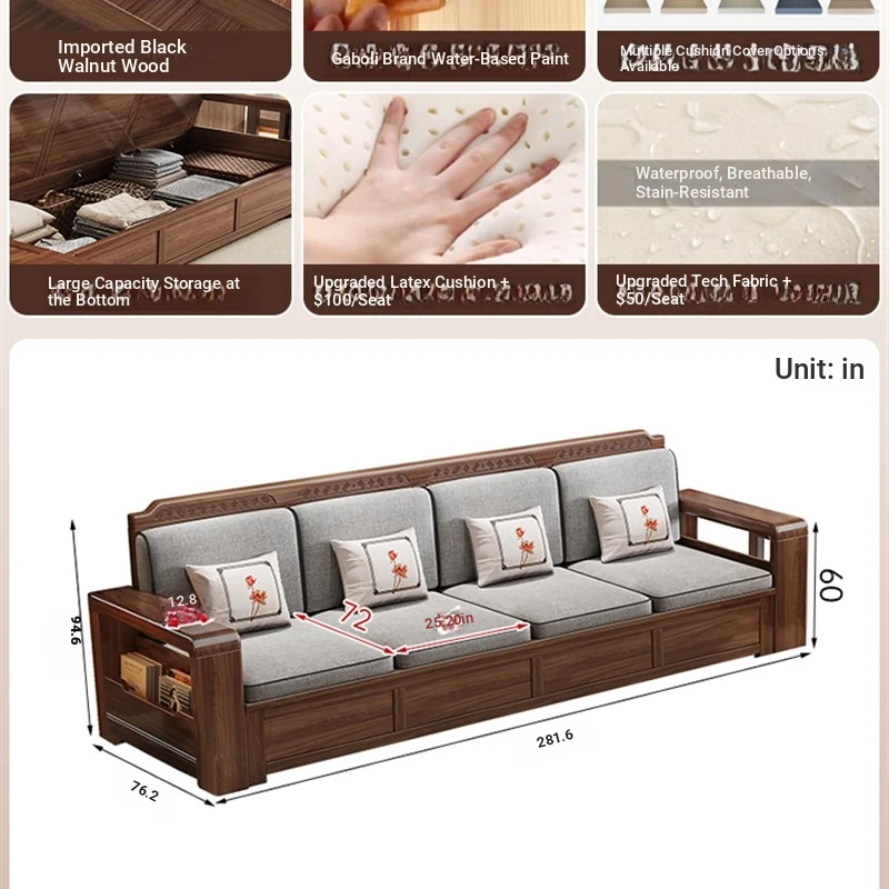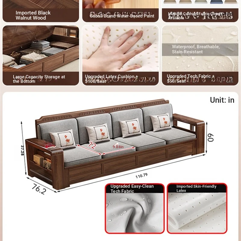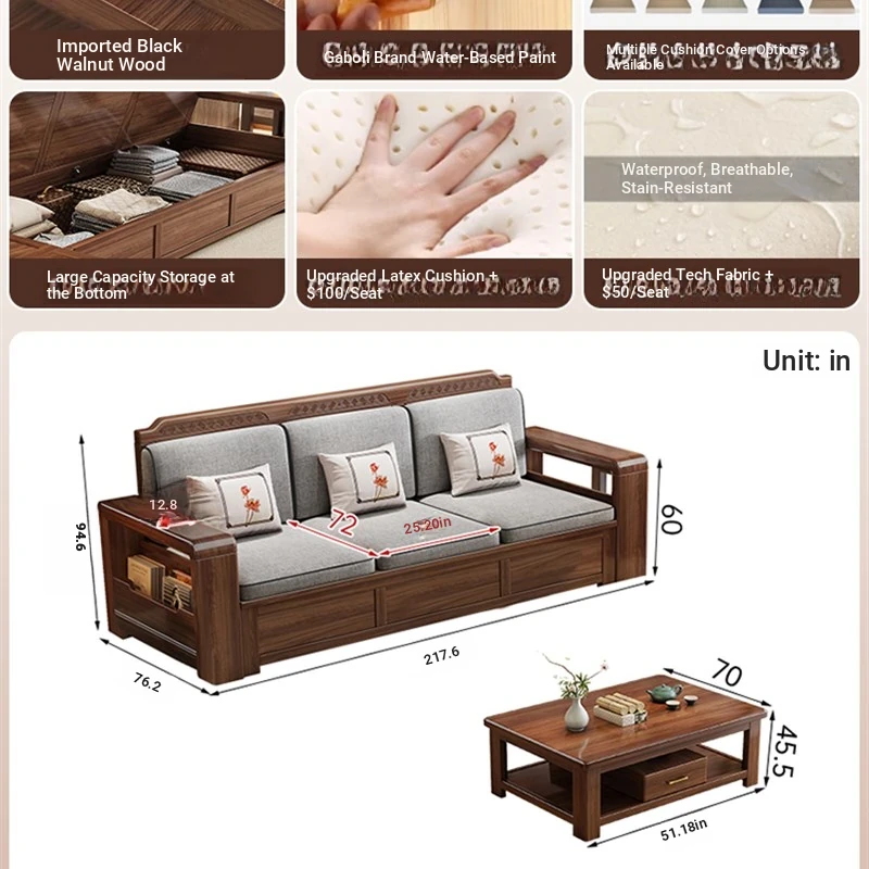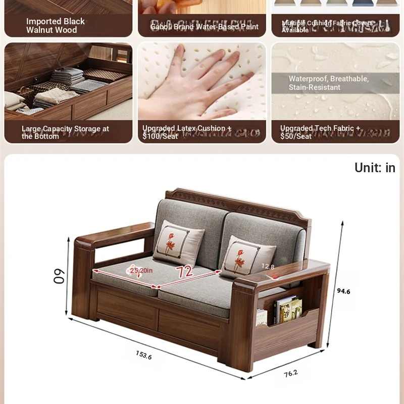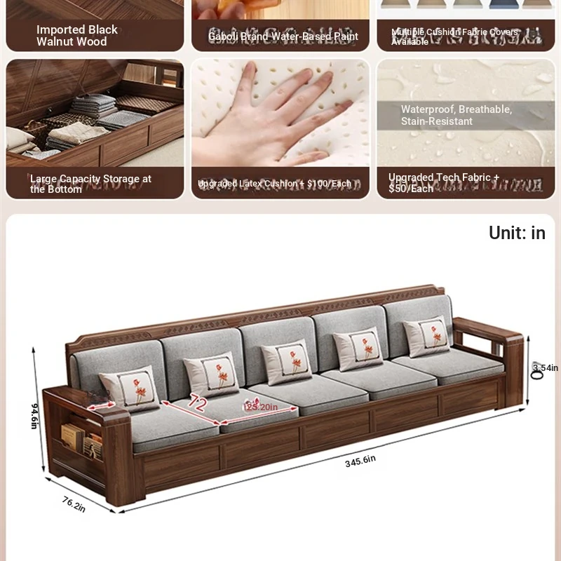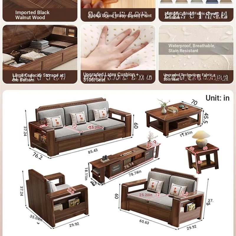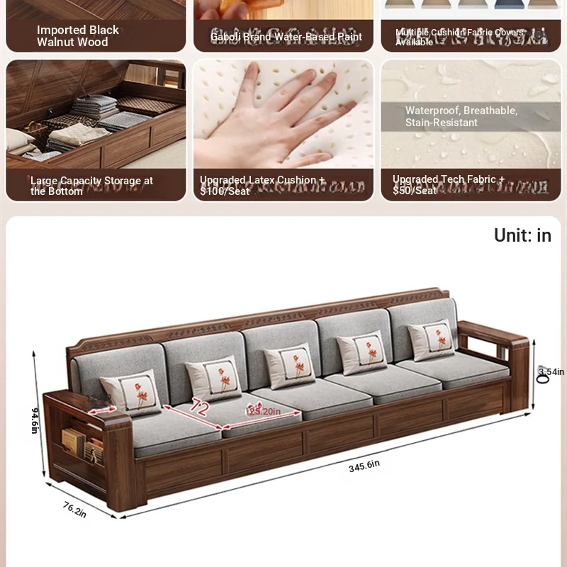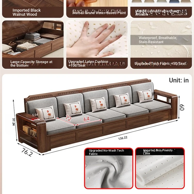 Trendy New Chinese Style Black Walnut Solid Wood Sofa - All-Season Multipurpose Storage Sofa for Living Room - Factory Direct Offer