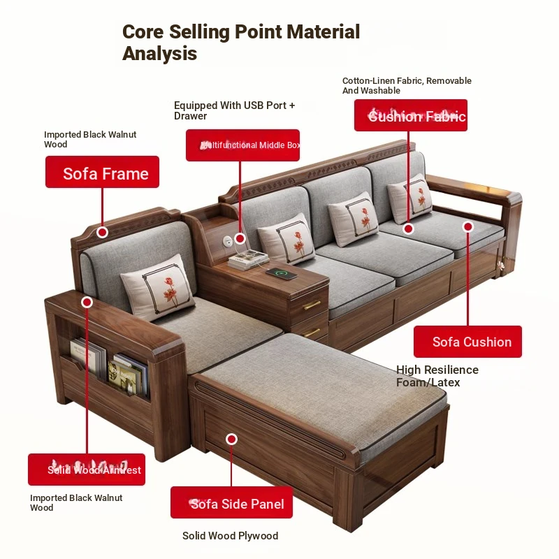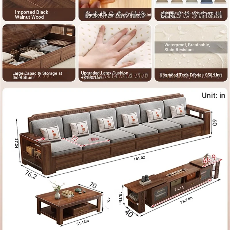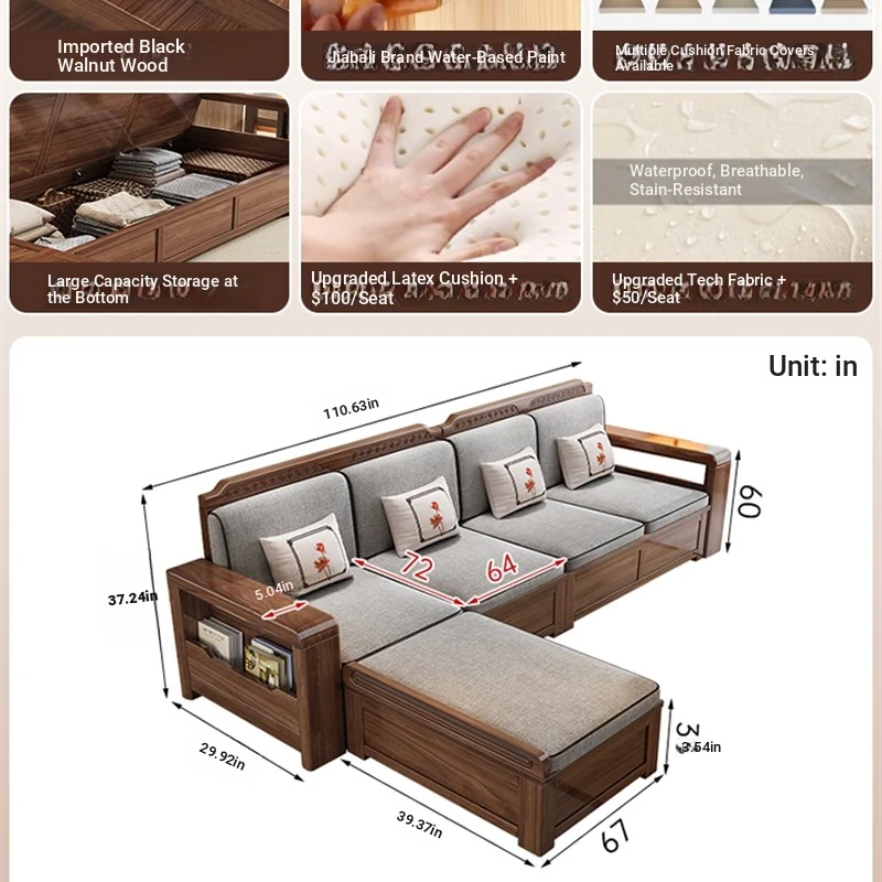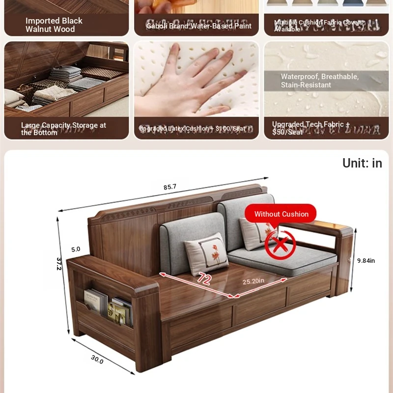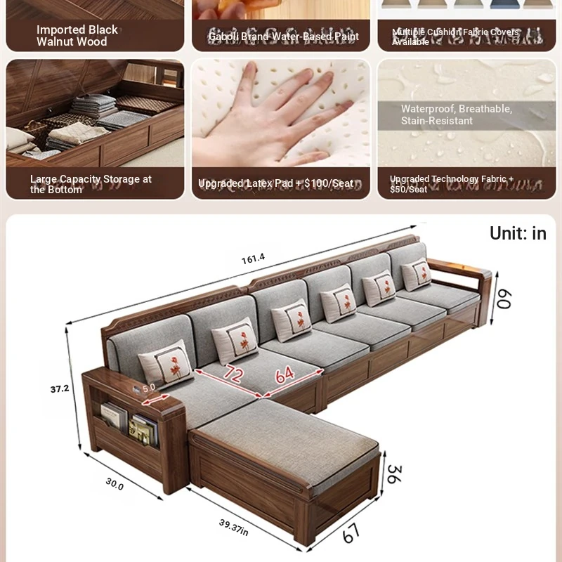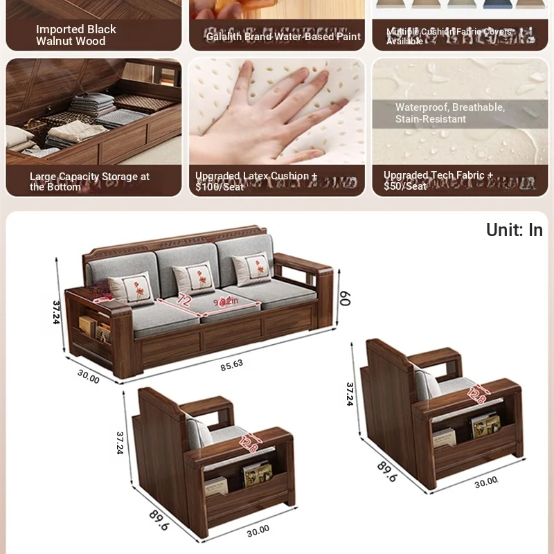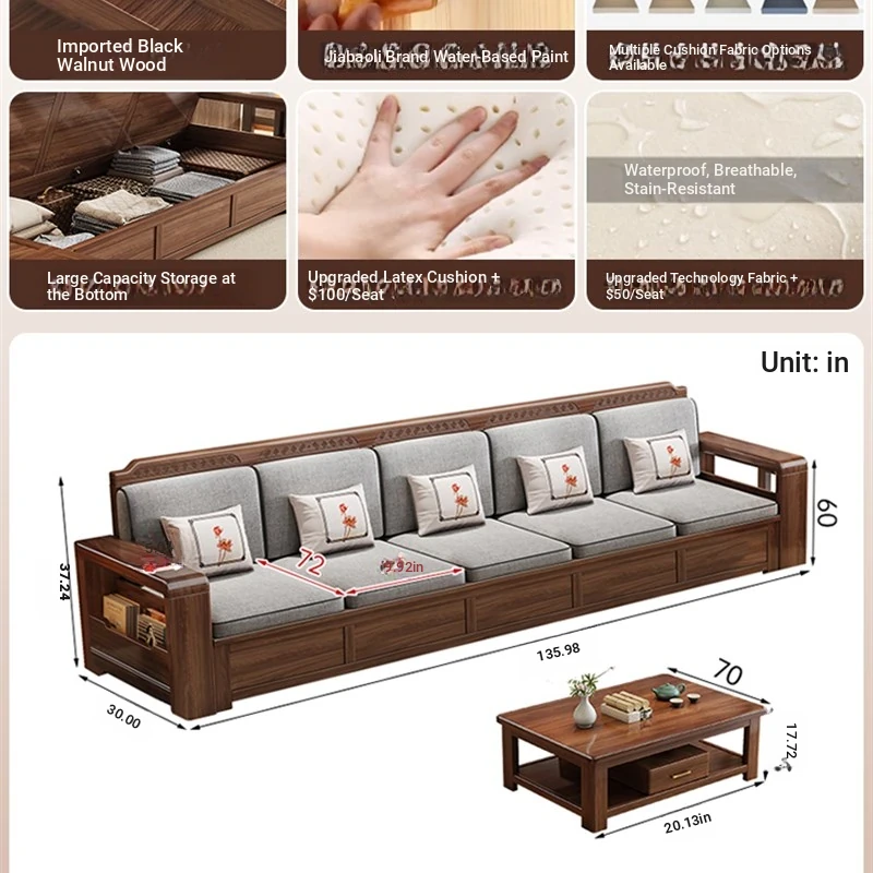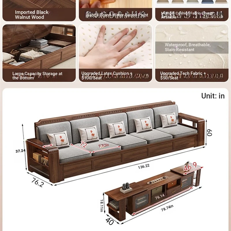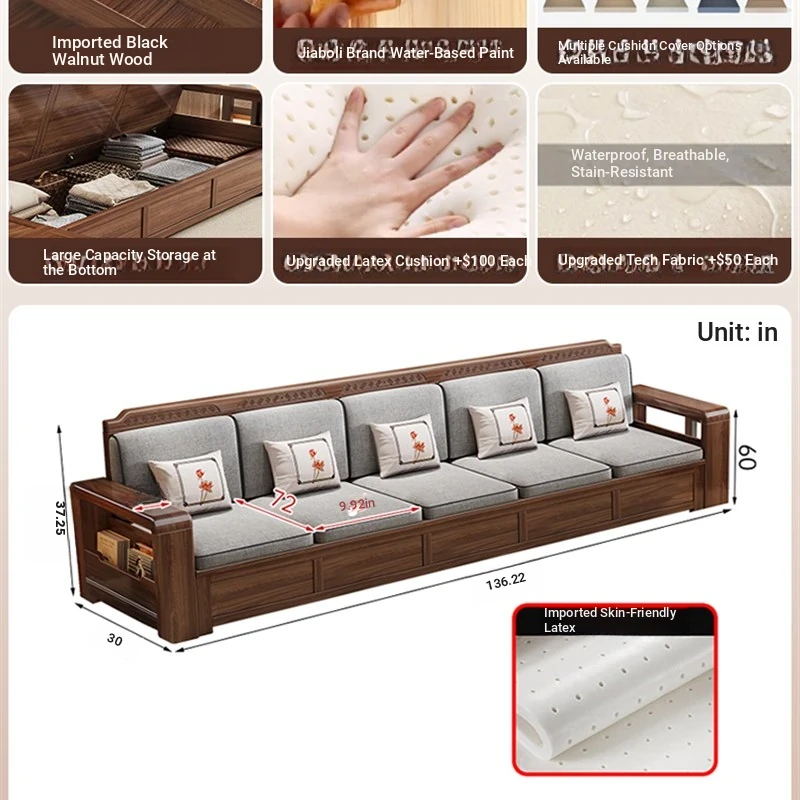 Trendy New Chinese Style Black Walnut Solid Wood Sofa - All-Season Multipurpose Storage Sofa for Living Room - Factory Direct Offer