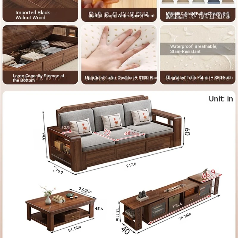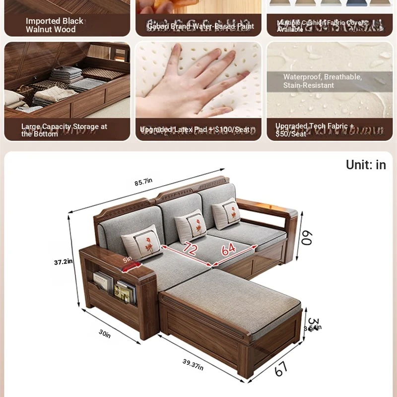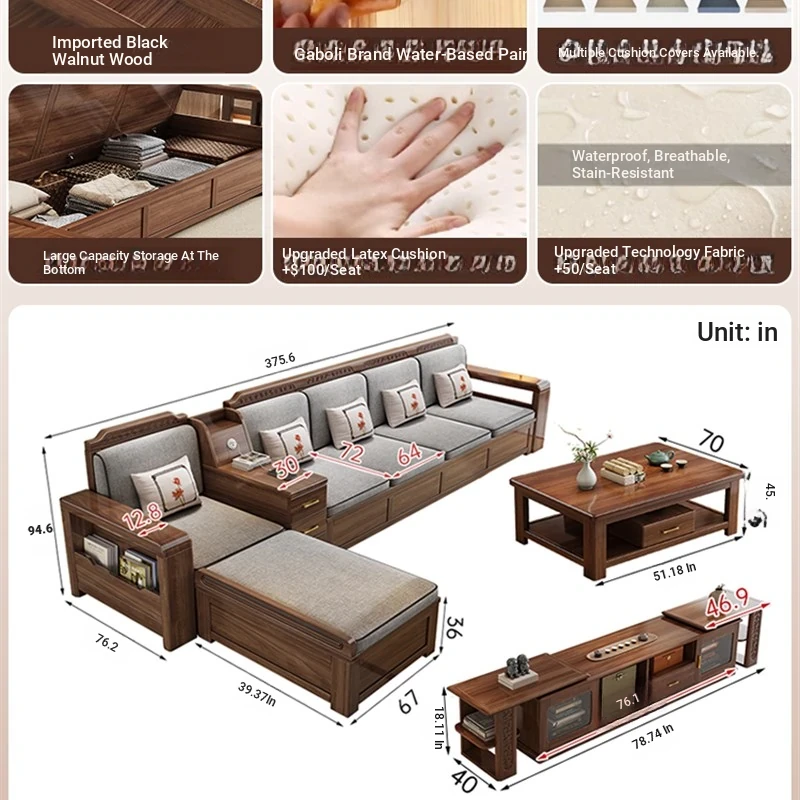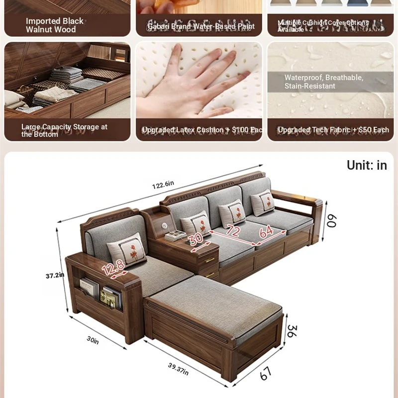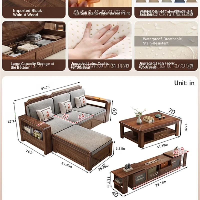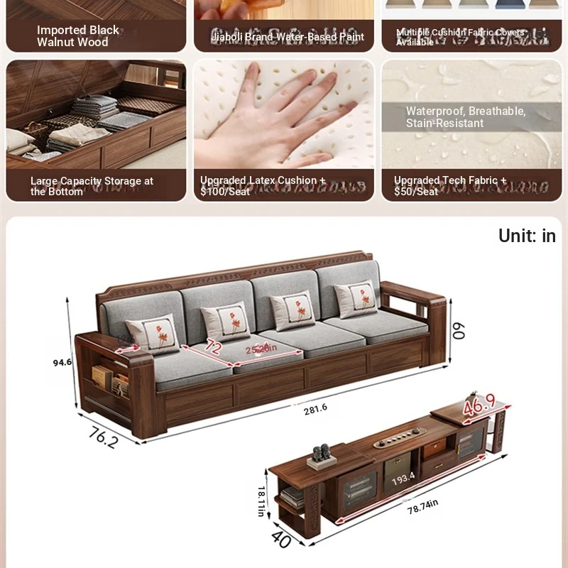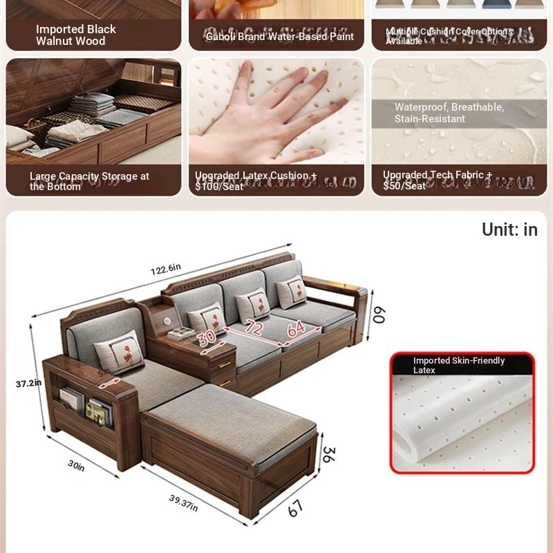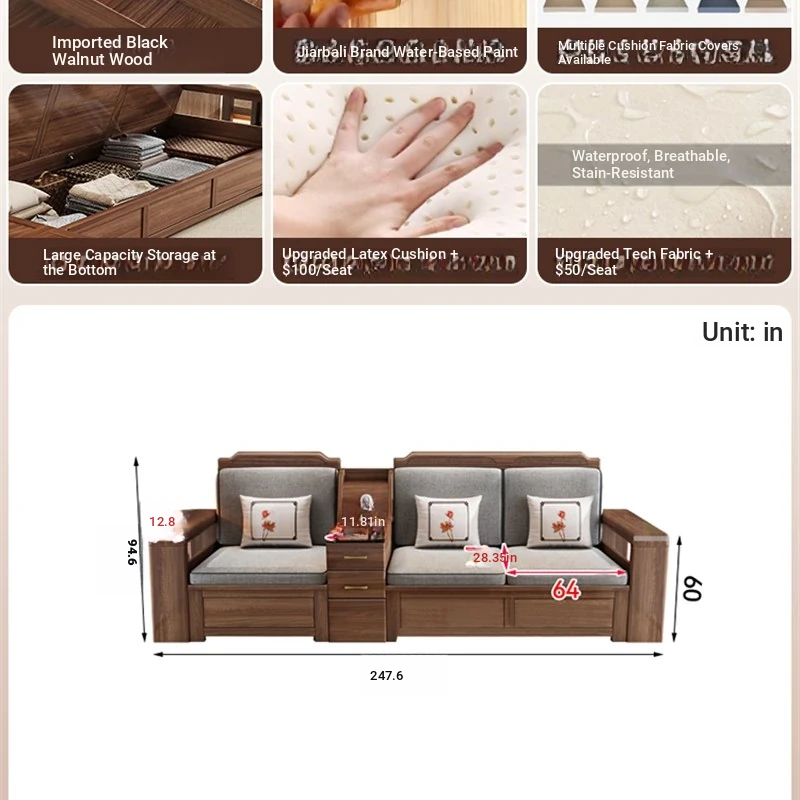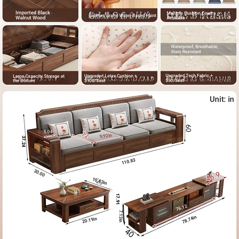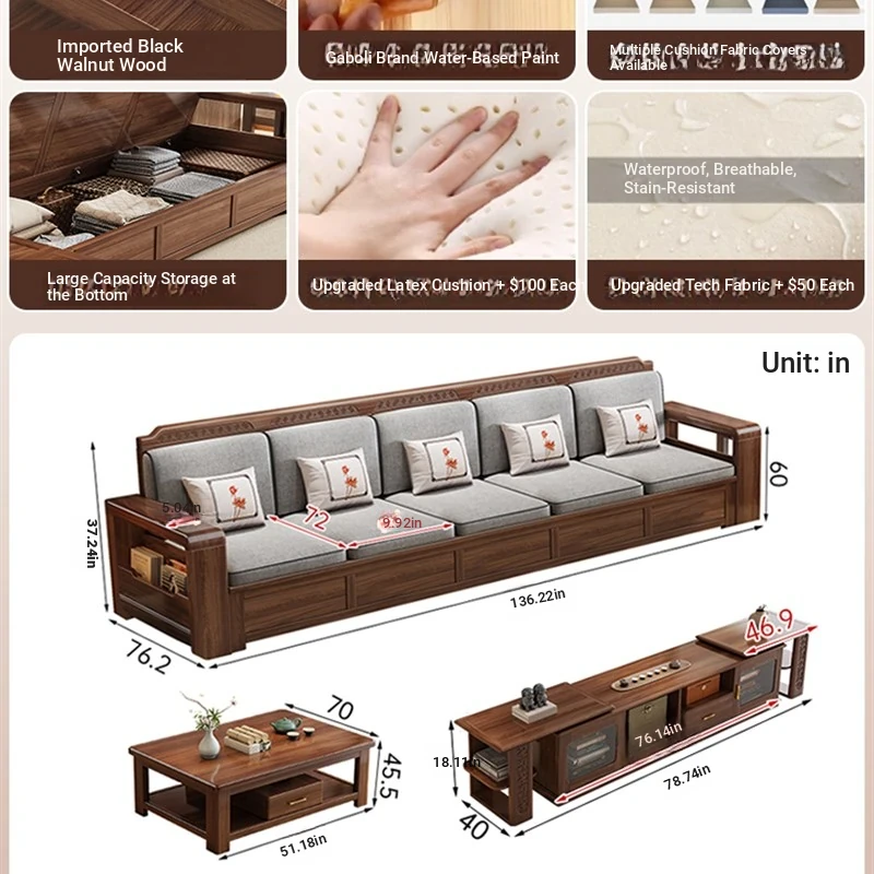 Trendy New Chinese Style Black Walnut Solid Wood Sofa - All-Season Multipurpose Storage Sofa for Living Room - Factory Direct Offer