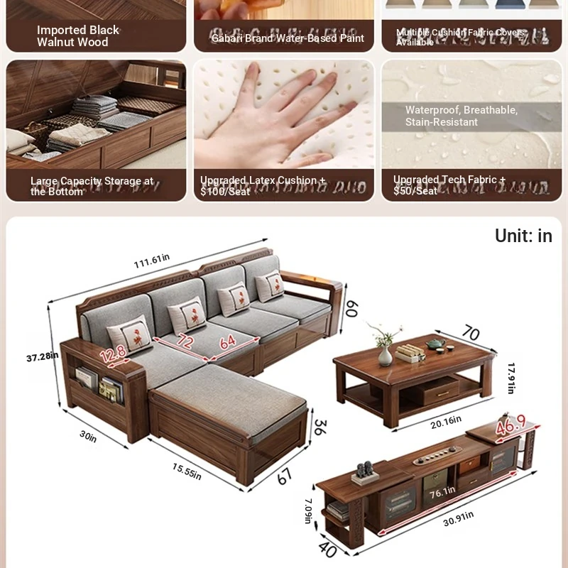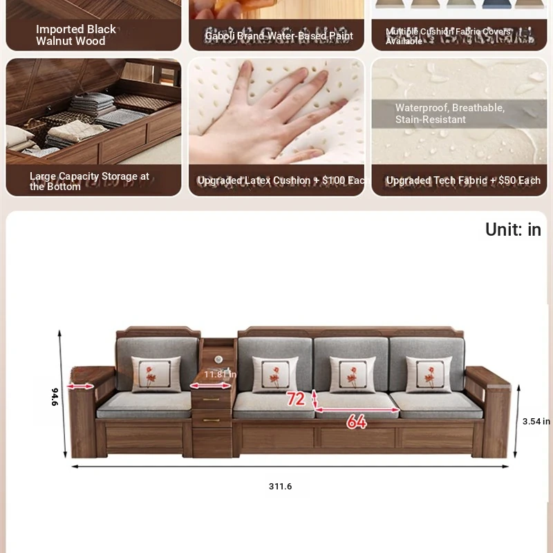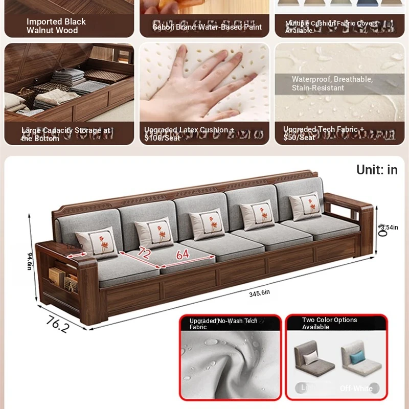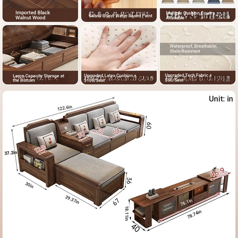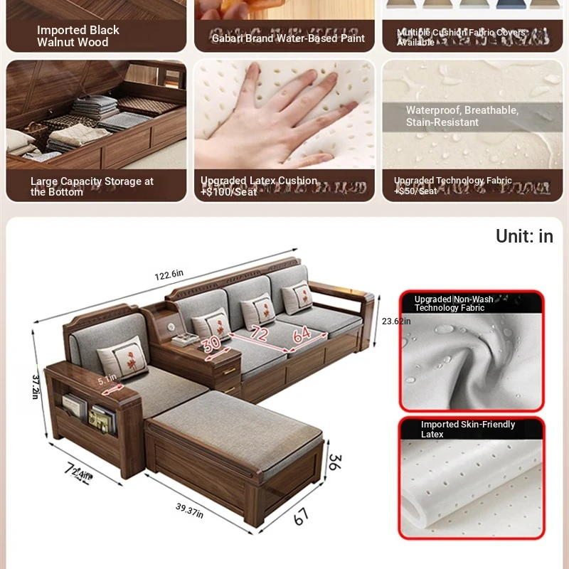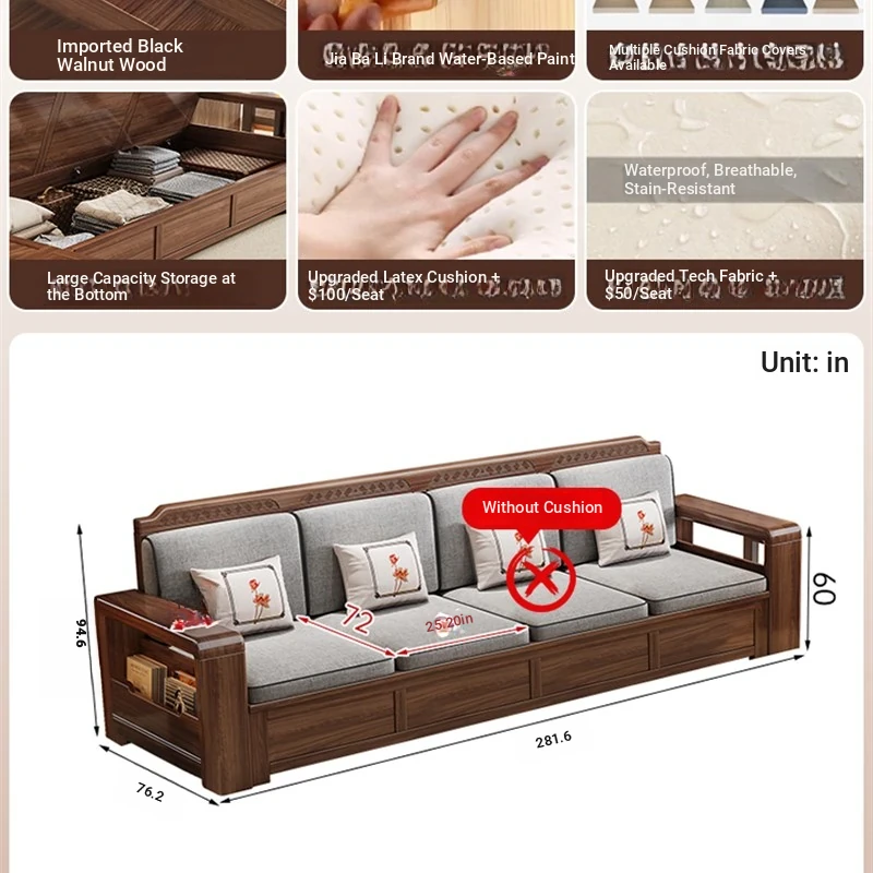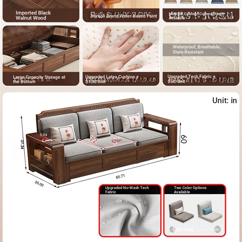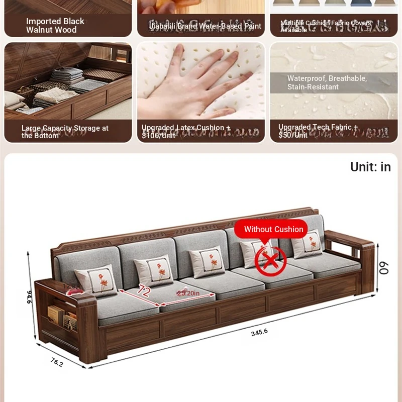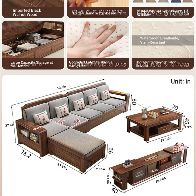 Trendy New Chinese Style Black Walnut Solid Wood Sofa - All-Season Multipurpose Storage Sofa for Living Room - Factory Direct Offer