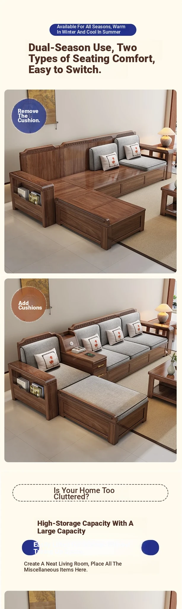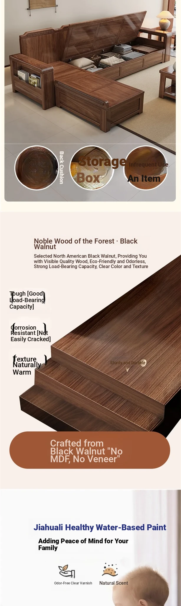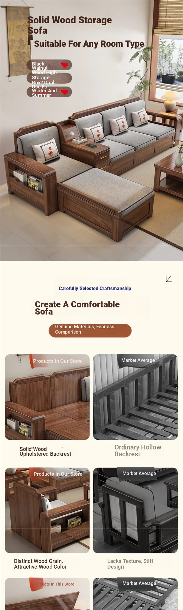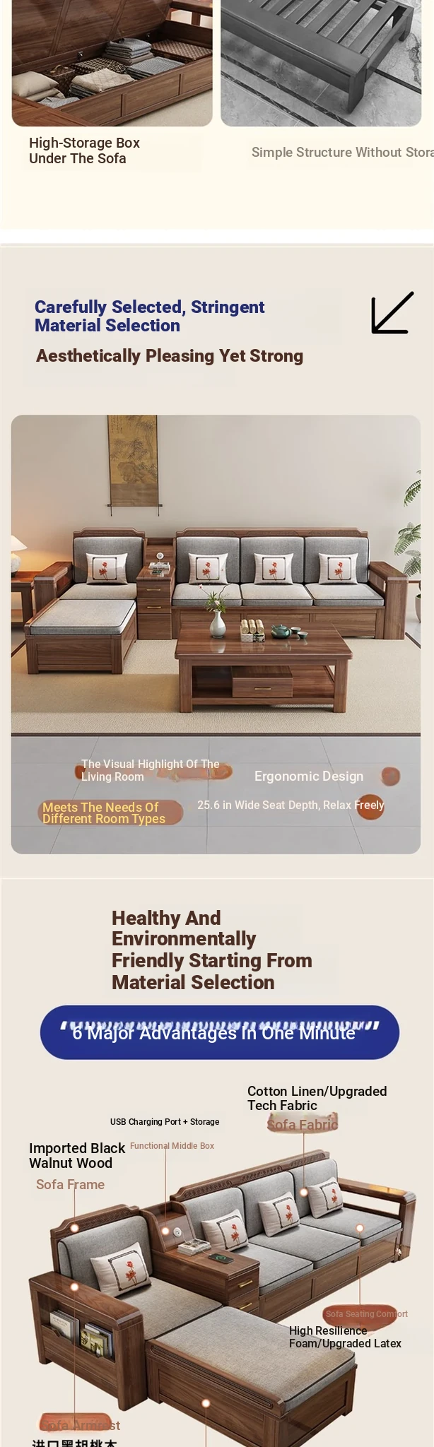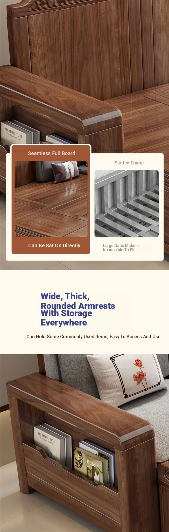 Trendy New Chinese Style Black Walnut Solid Wood Sofa - All-Season Multipurpose Storage Sofa for Living Room - Factory Direct Offer