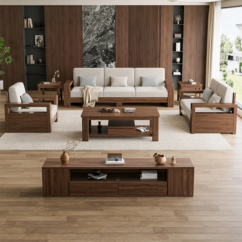 Walnut Wood Chinese Style Solid Wood Sofa Set - L-Shaped Corner Chaise Lounge, Versatile for Winter and Summer, Economical Storage Solution for Your Living Room