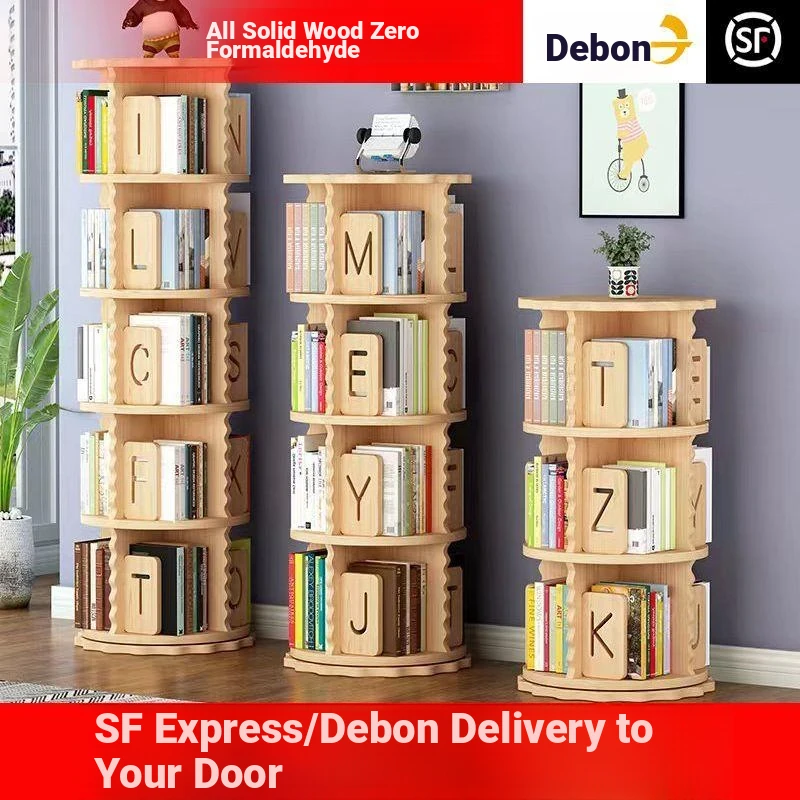 Solid Wood Rotating Bookshelf - Minimalist Floor Standing Design for Home Use, Perfect for Children's Picture Books and Storage, 360-Degree Small Bookcase for Student Bedrooms.