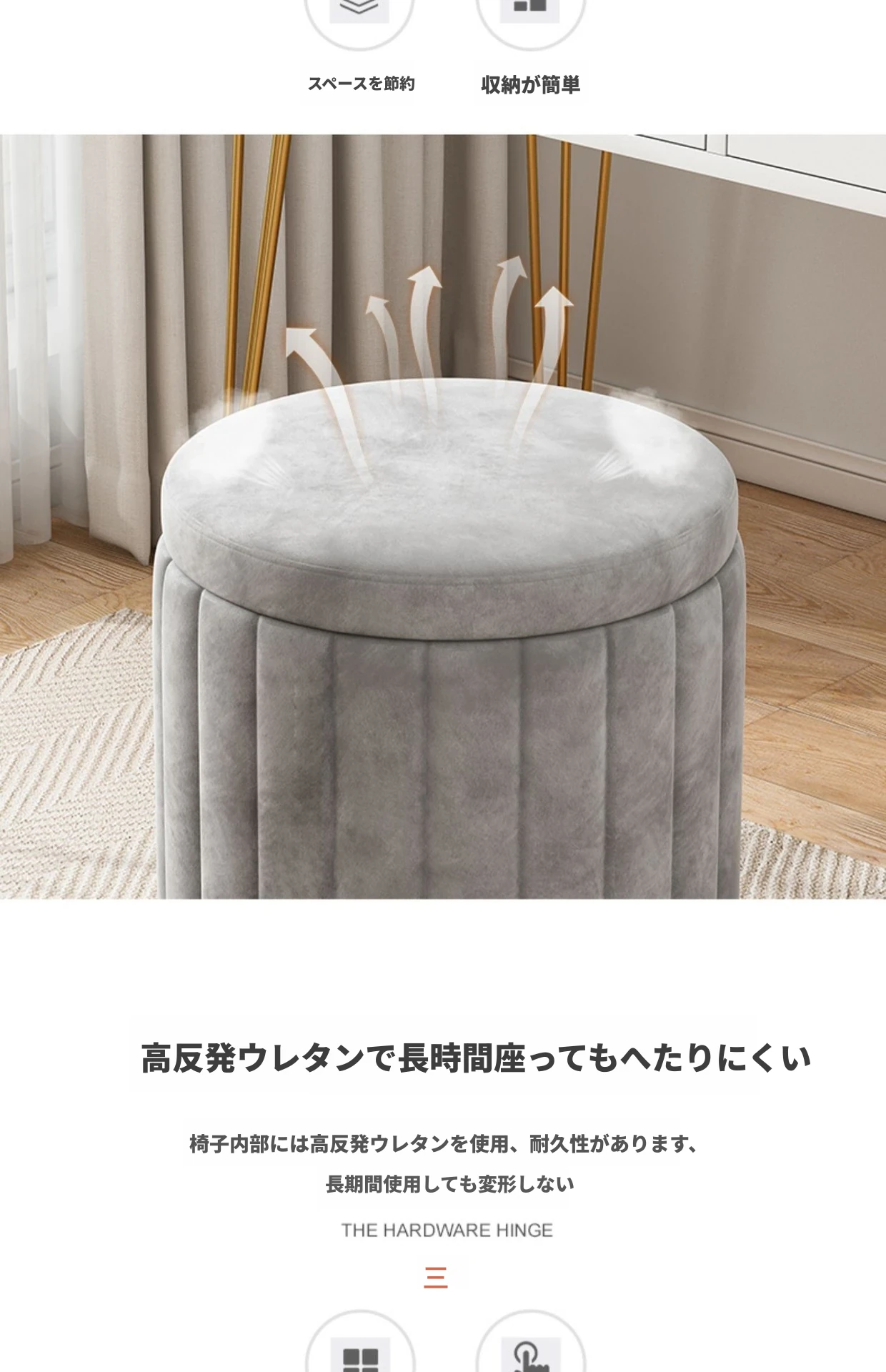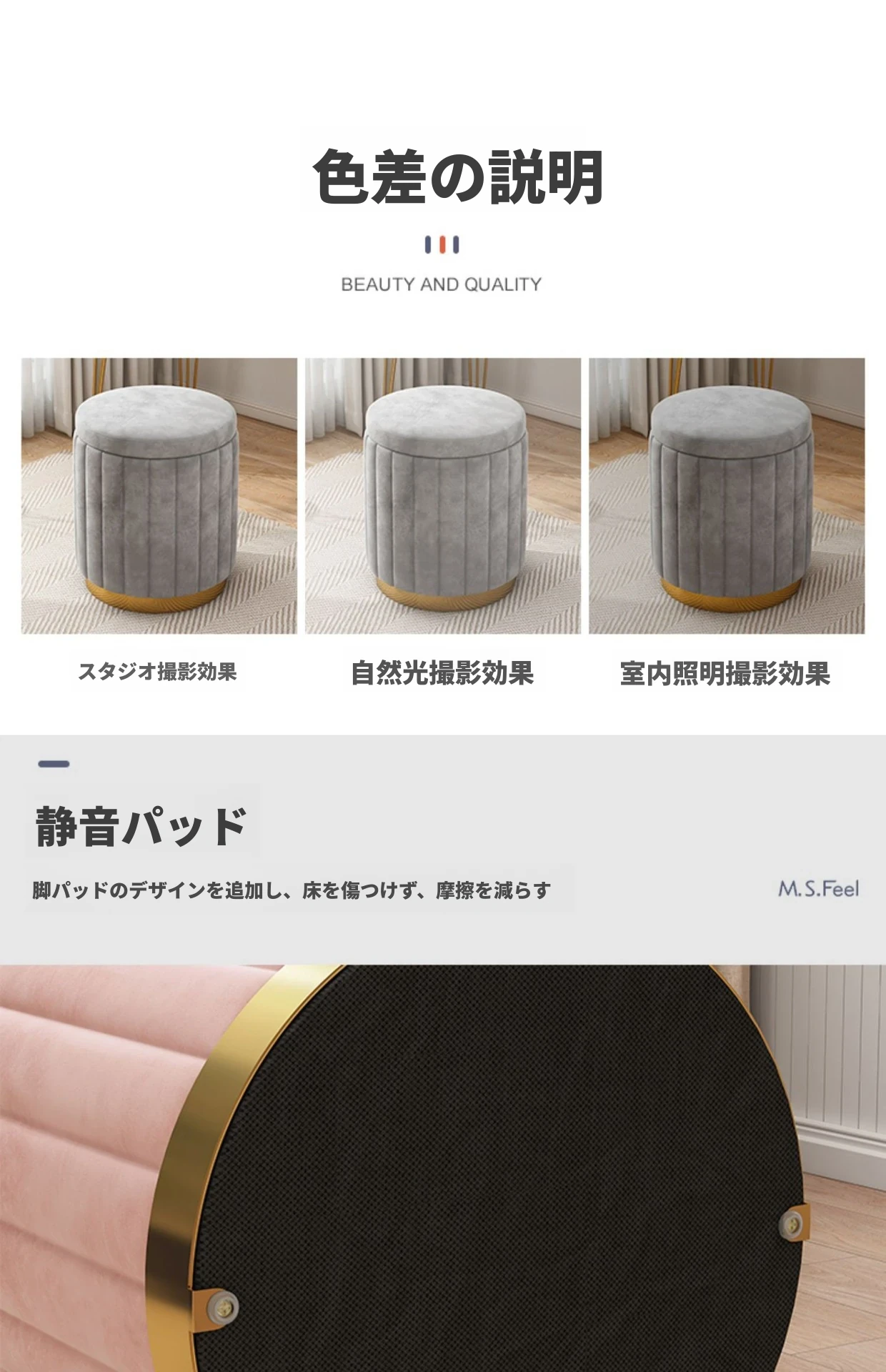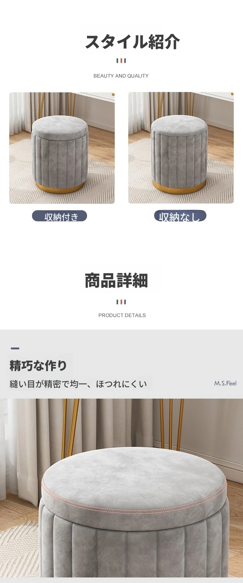 軽やかさと優雅さを兼ね備えたラウンドメイクアップスツール!おしゃれな収納機能付きで、寝室やリビングにもぴったり。コンパクトなデザインで、ドレッサーやソファの横に置いても邪魔になりません。魅力的なインテリアを演出しましょう!