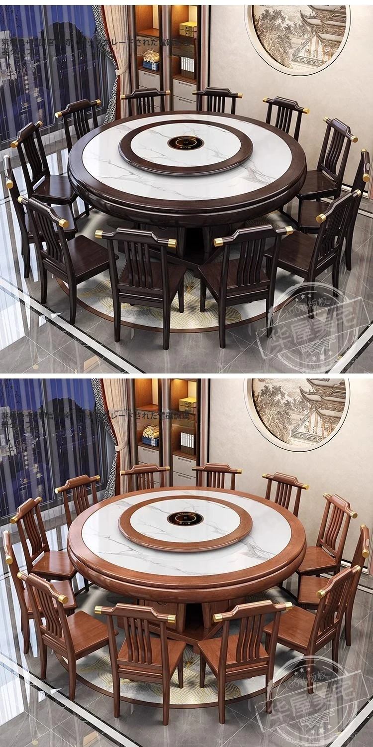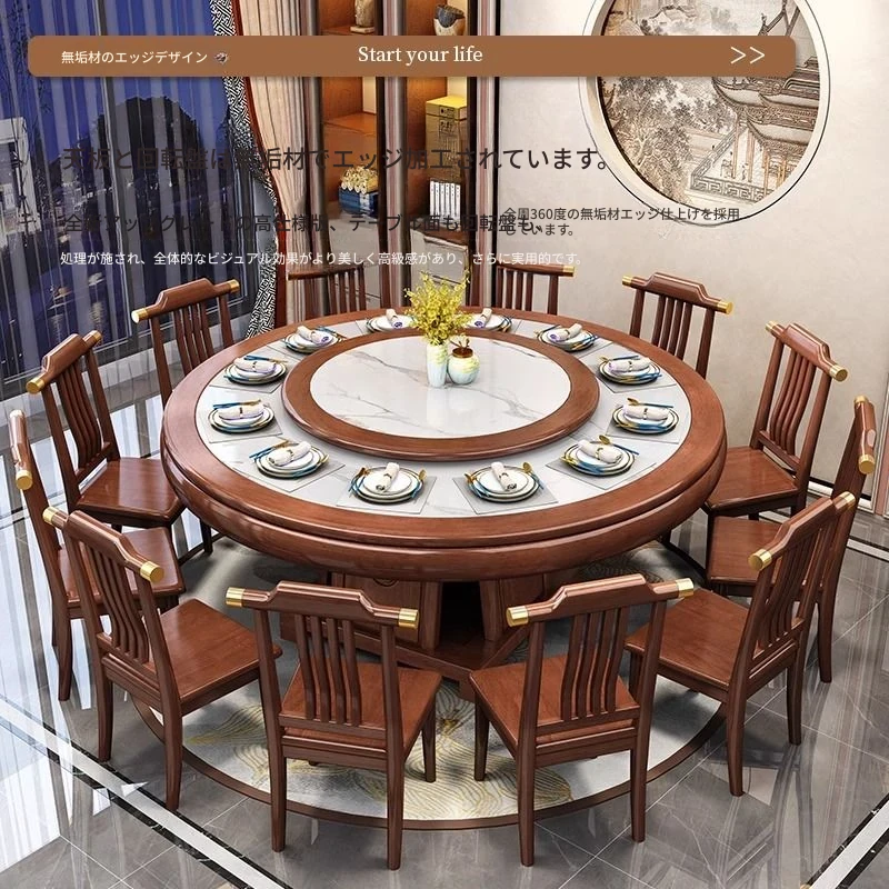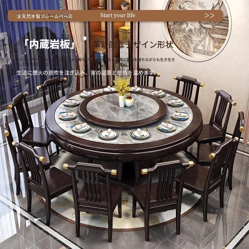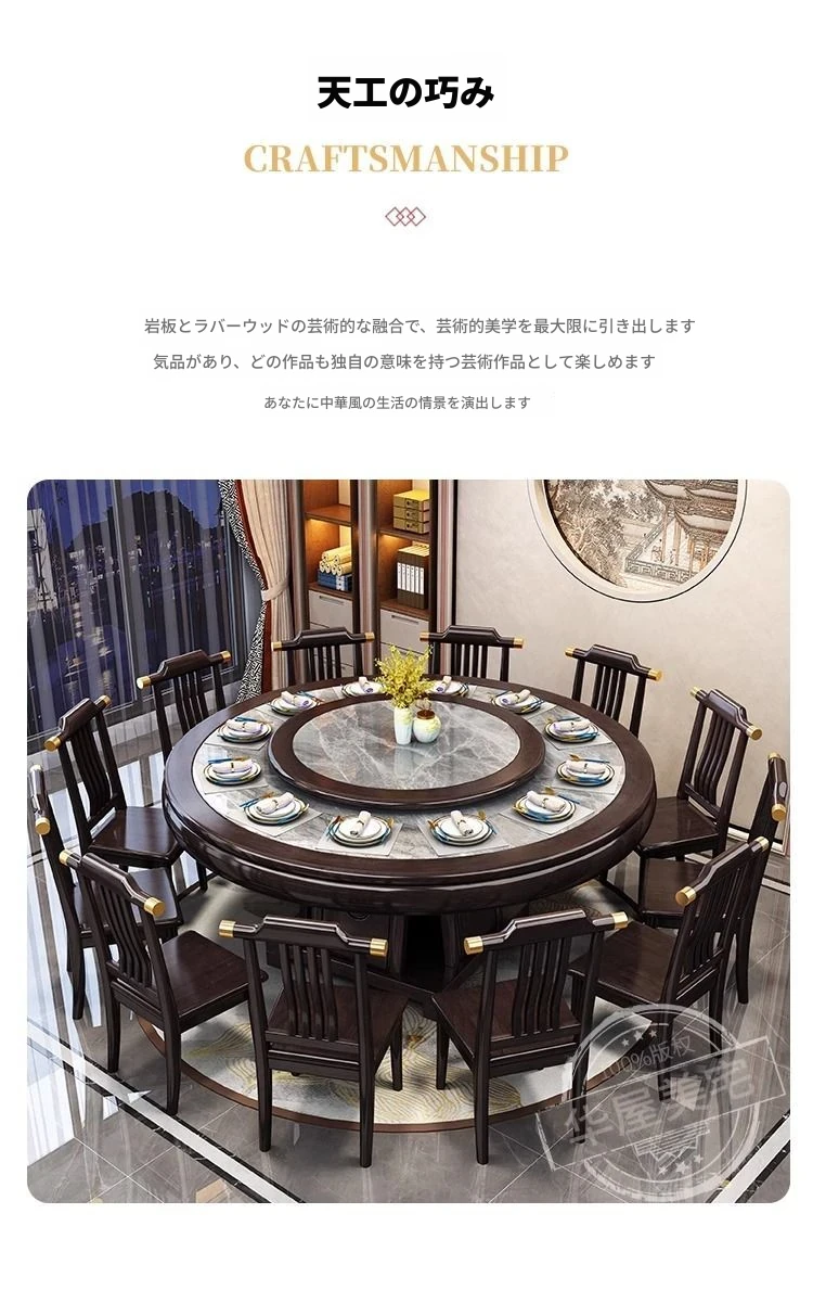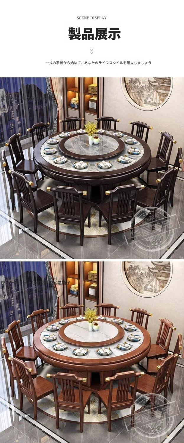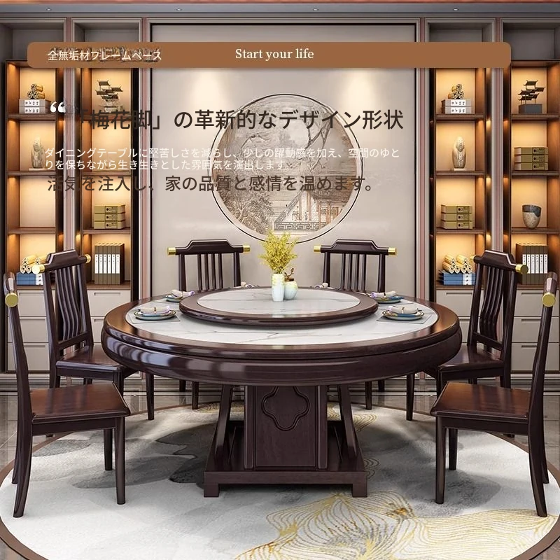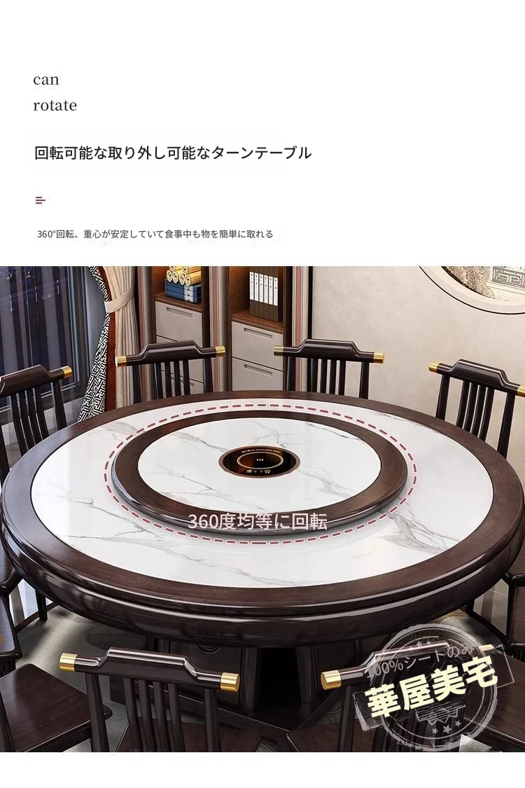 新中式デザインの高級実木製円形ダイニングテーブルセット!回転式プレート付きで、家庭やホテルに最適。電磁調理器対応、鍋料理も楽しめる理想の食卓!