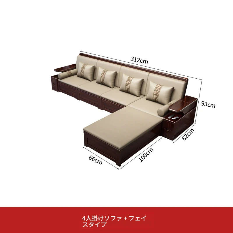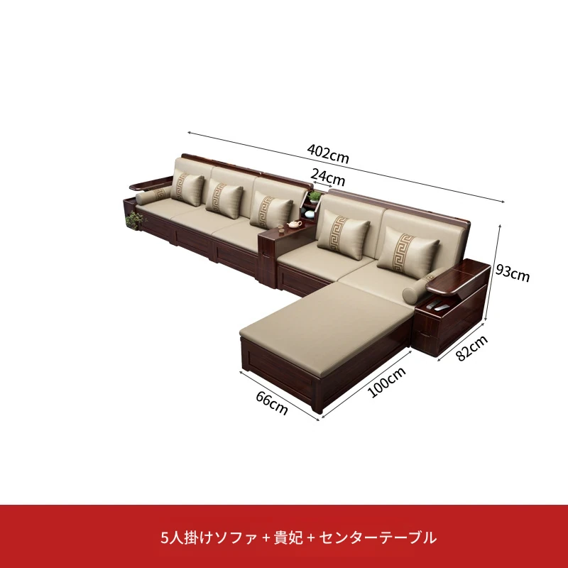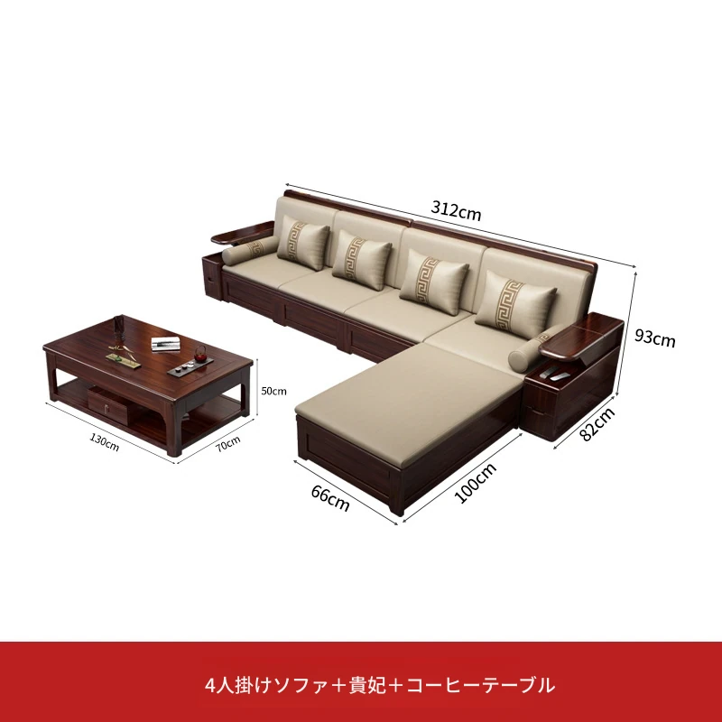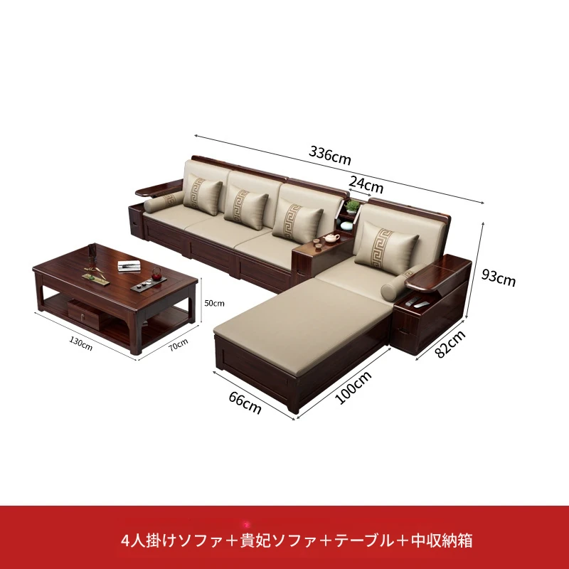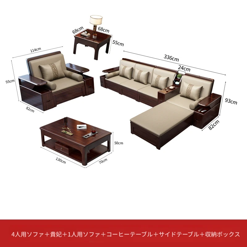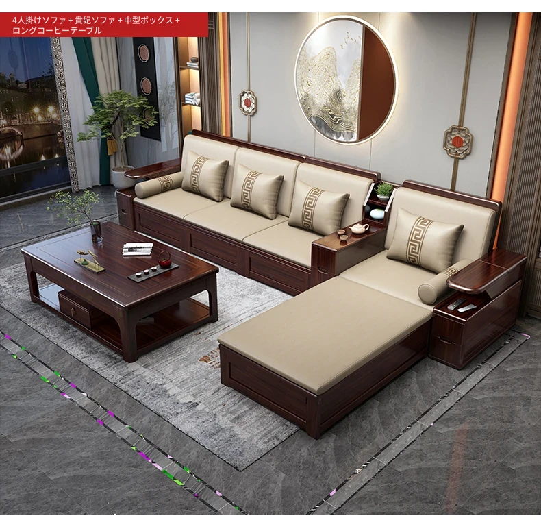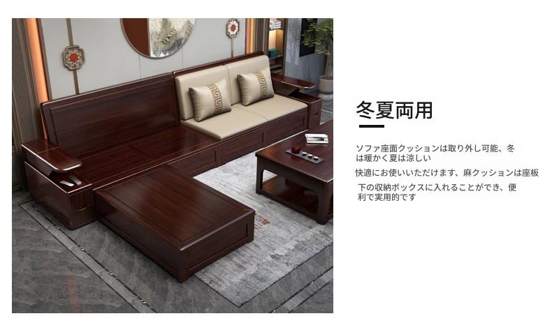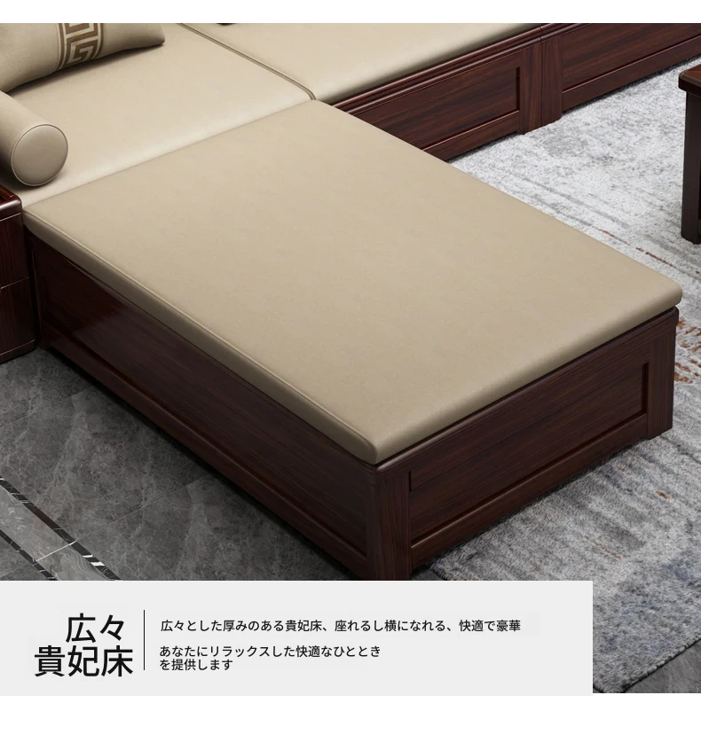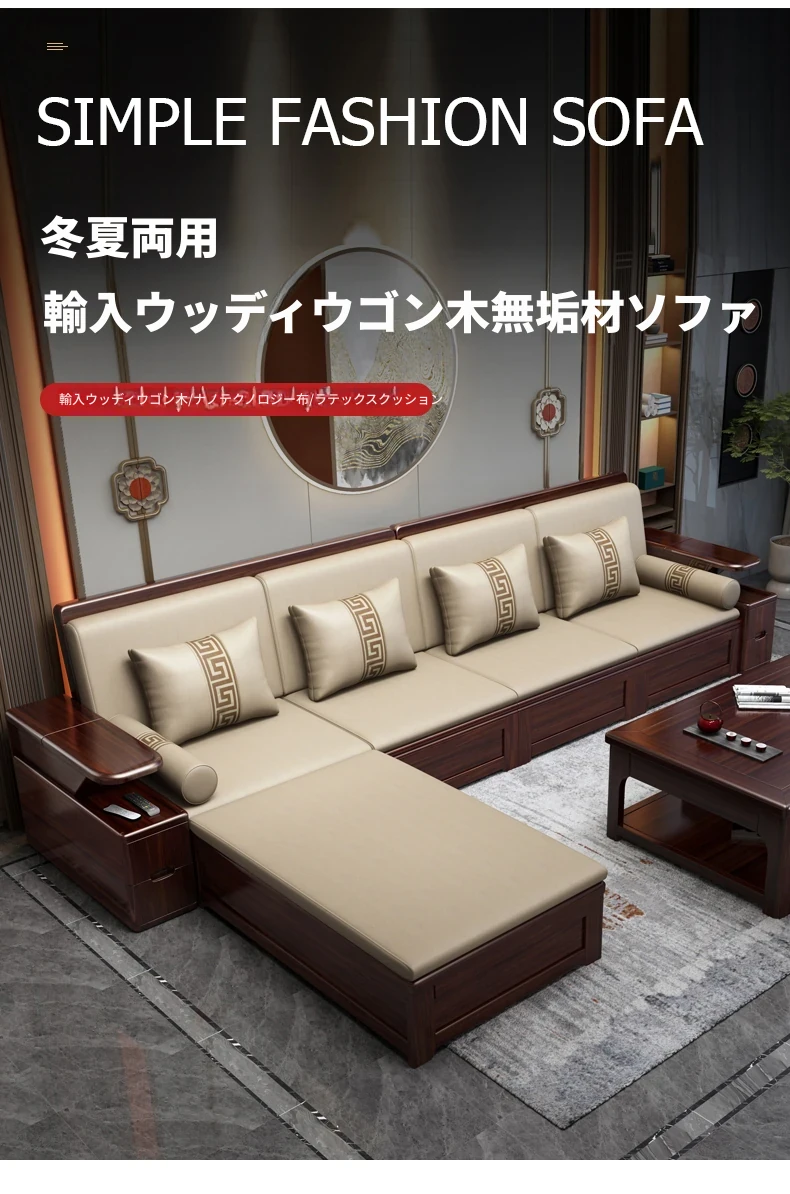 ウッディな新中式デザインのウール杉木製ソファセット|軽やかで贅沢な収納機能付き|冬夏両用|コンパクトなリビングに最適なL字型と貴妃スタイル!