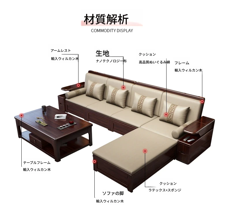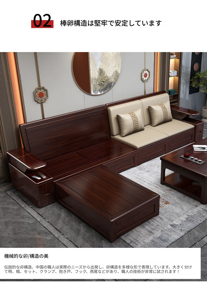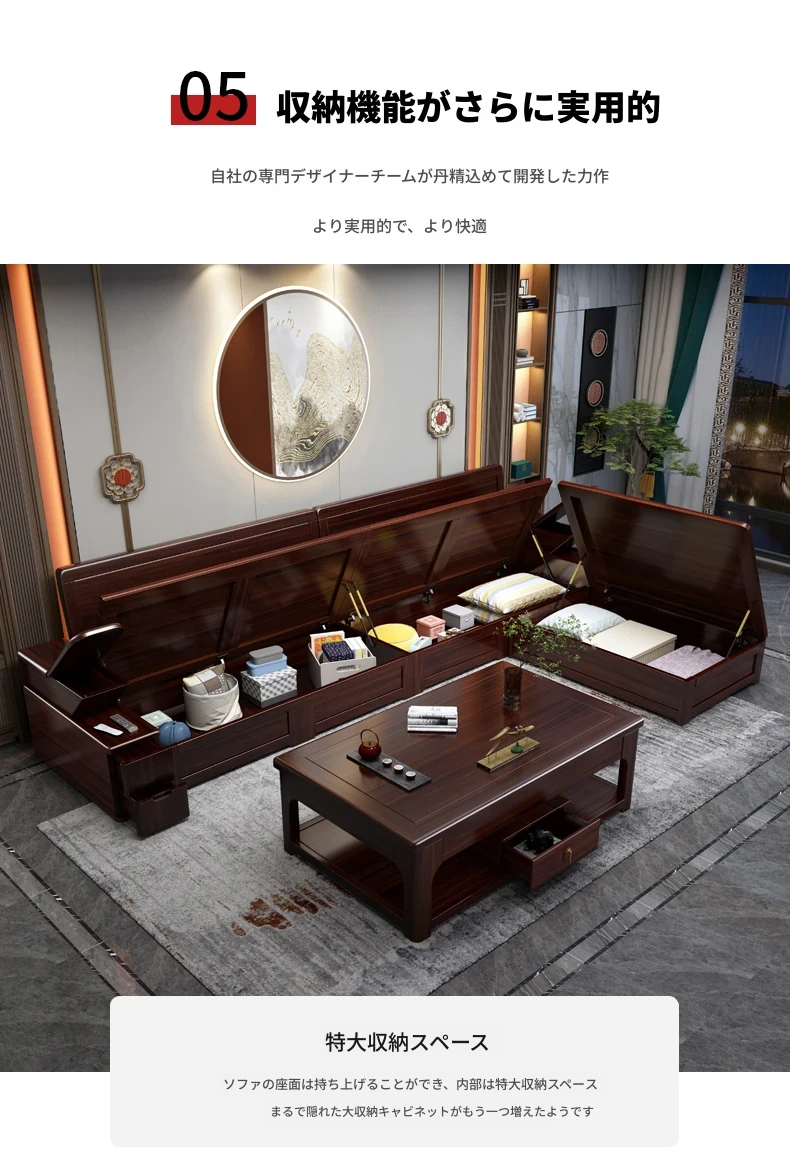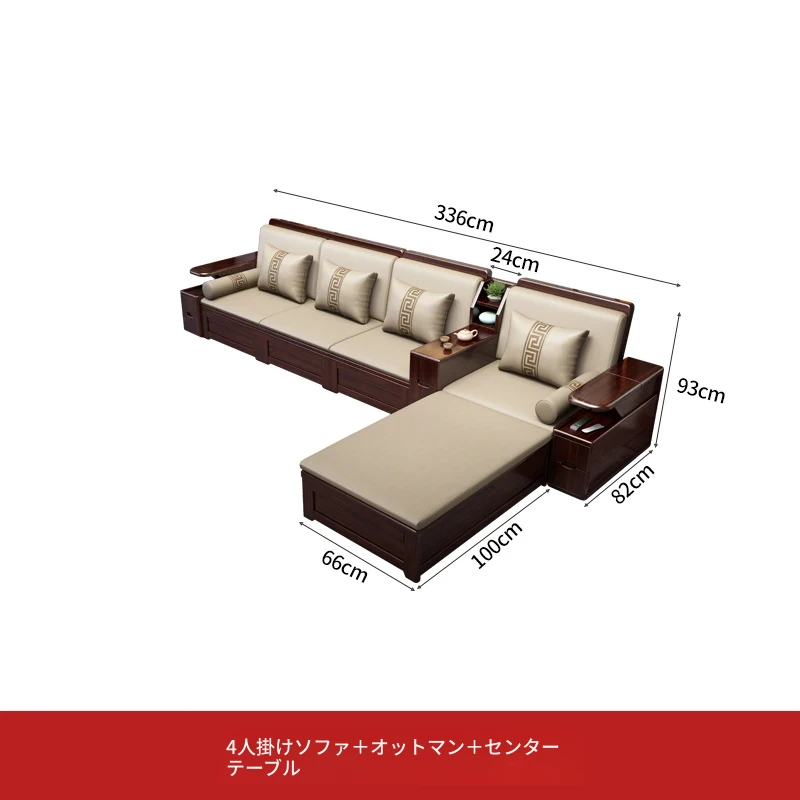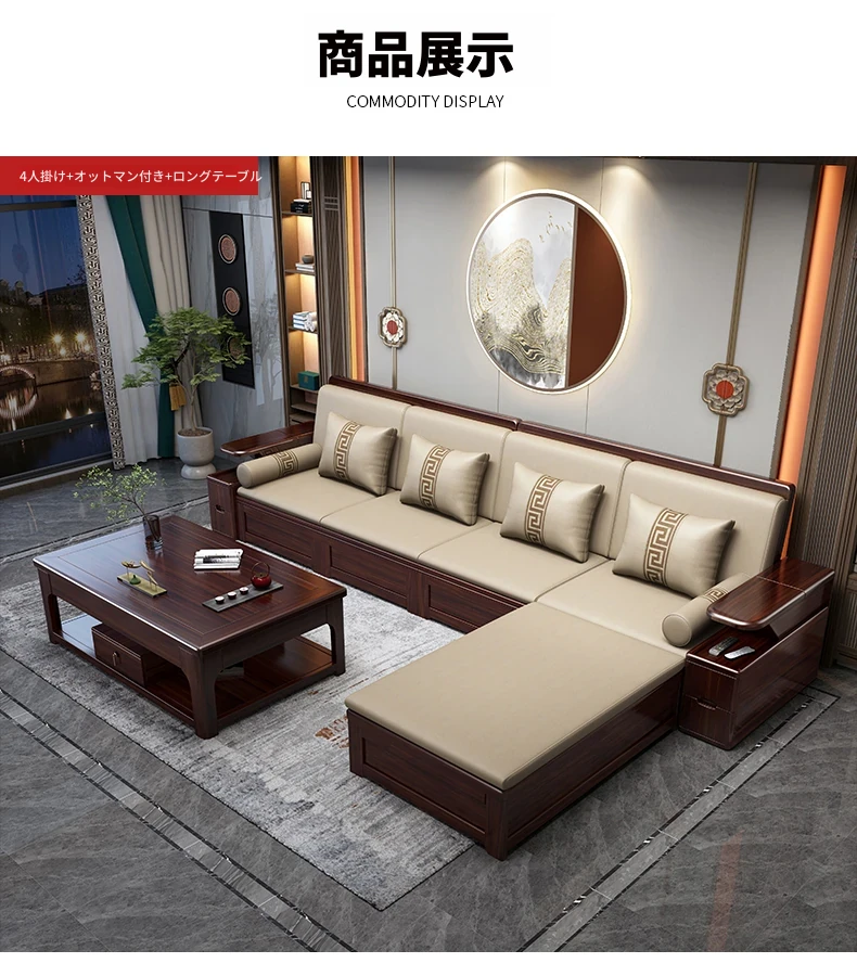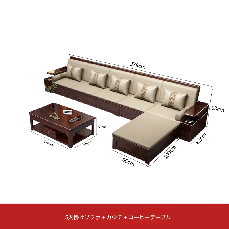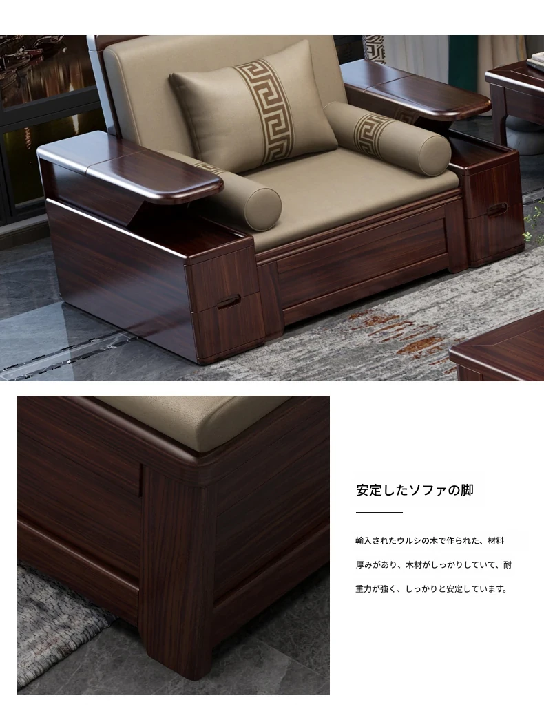 ウッディな新中式デザインのウール杉木製ソファセット|軽やかで贅沢な収納機能付き|冬夏両用|コンパクトなリビングに最適なL字型と貴妃スタイル!