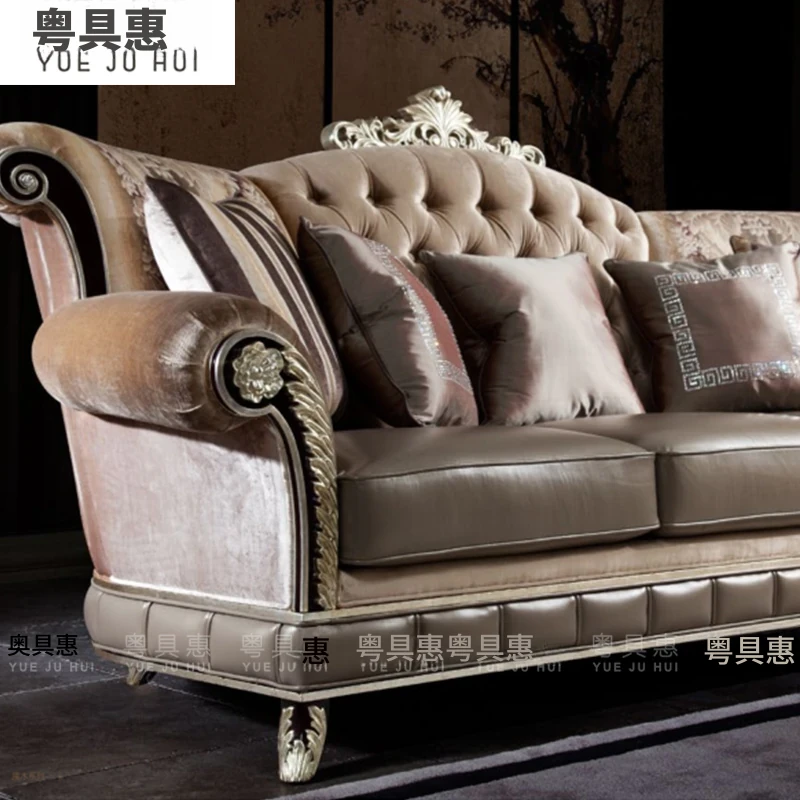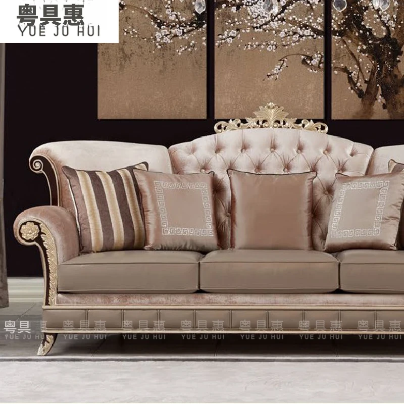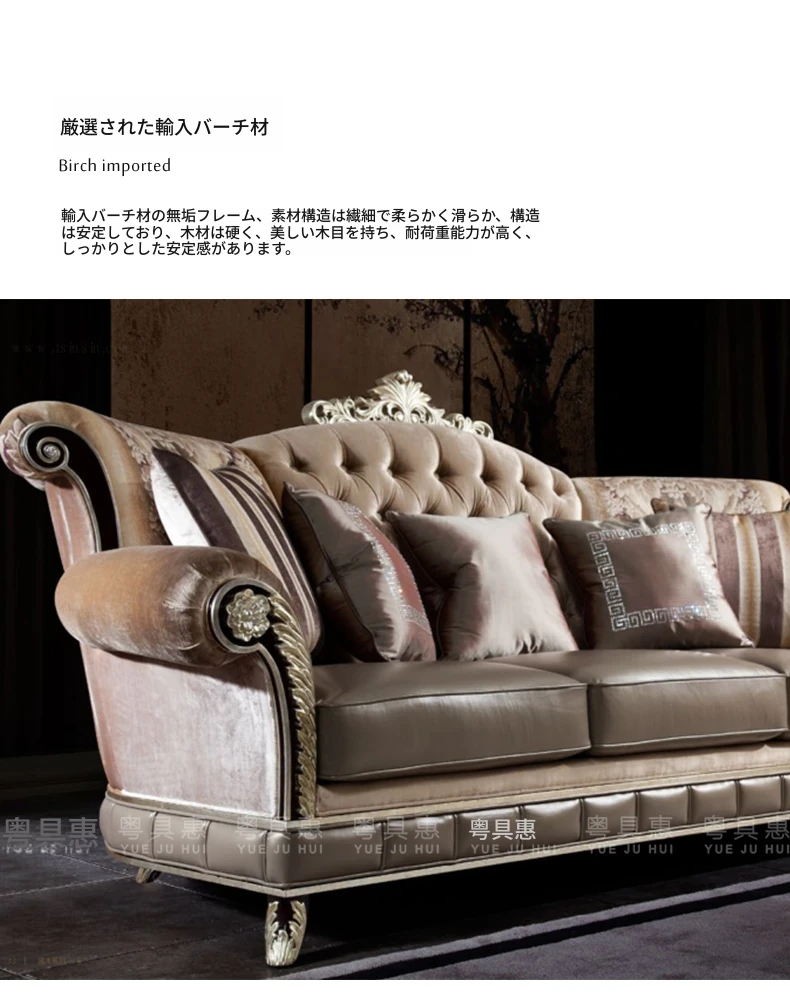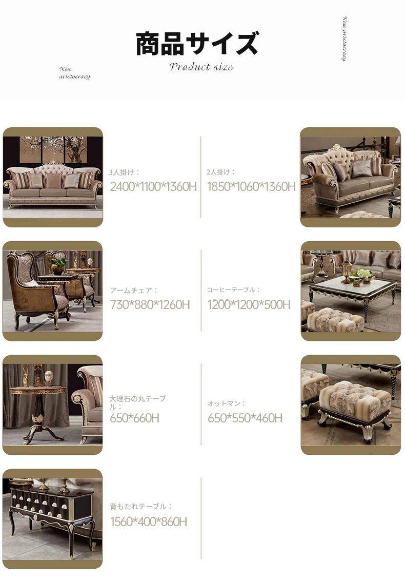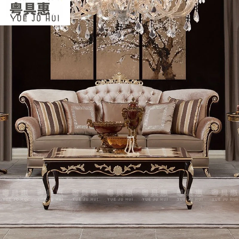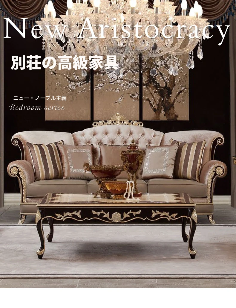 フランス風の新古典スタイル!欧式の実木彫刻とファブリックを組み合わせたソファセット。大空間にぴったりなティーテーブルとコーナーテーブル付き、上品なリビング家具で優雅な空間を演出します。