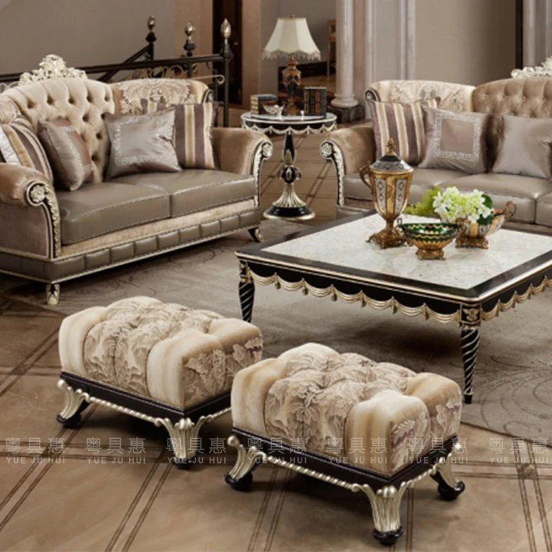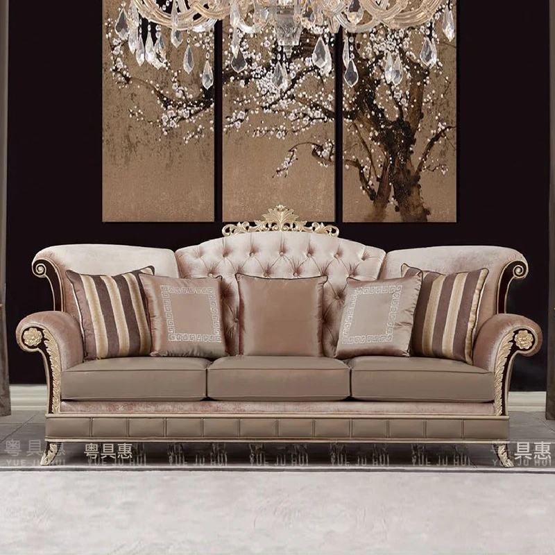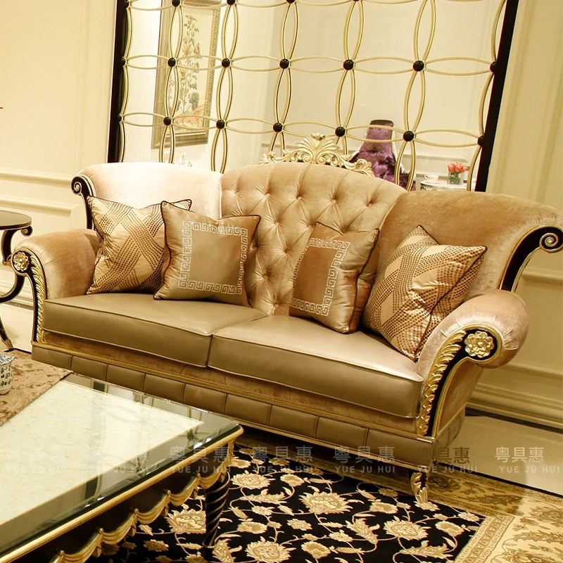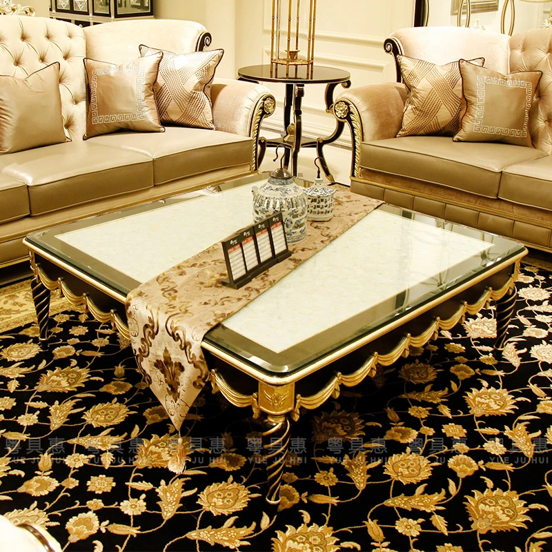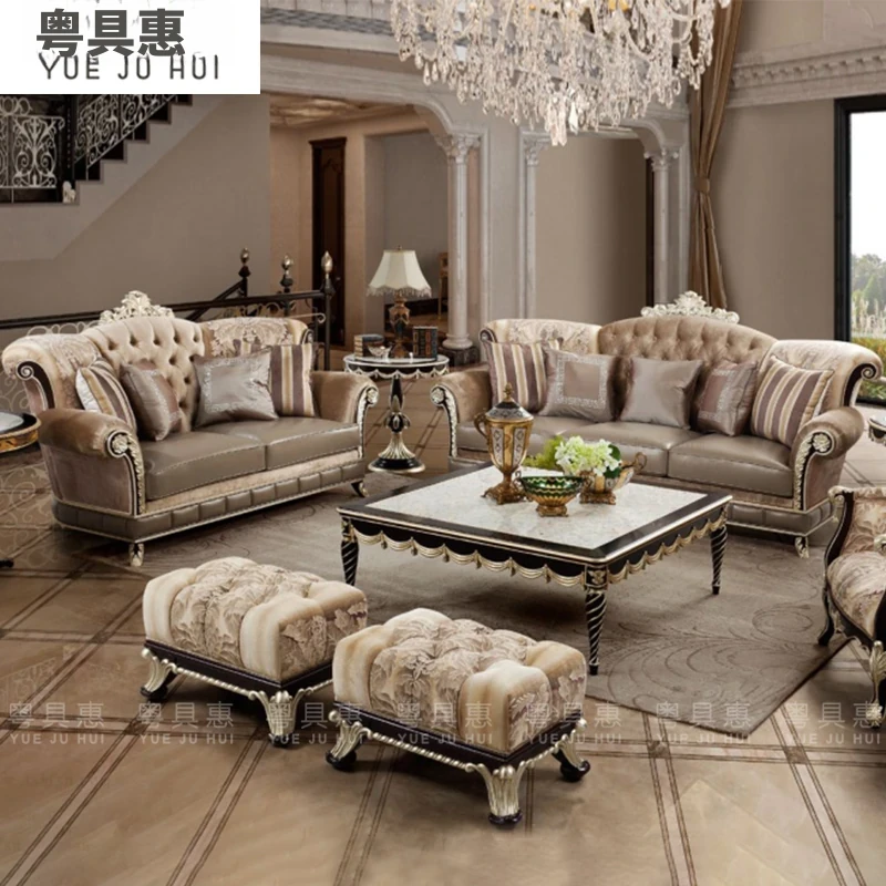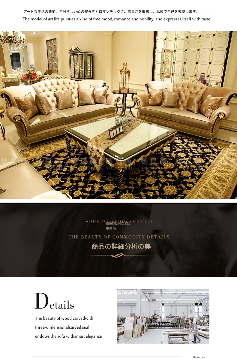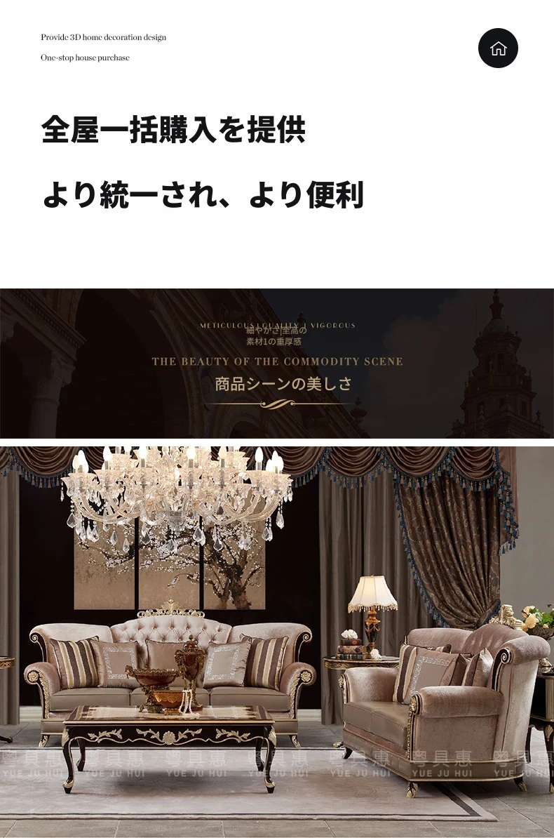 フランス風の新古典スタイル!欧式の実木彫刻とファブリックを組み合わせたソファセット。大空間にぴったりなティーテーブルとコーナーテーブル付き、上品なリビング家具で優雅な空間を演出します。
