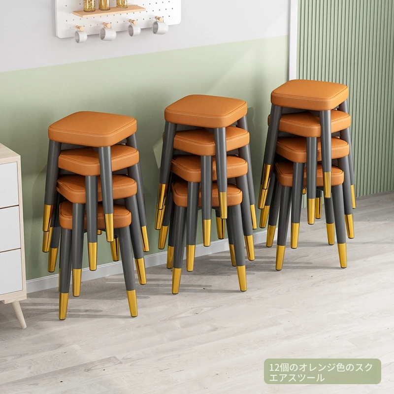 12角スツール-オレンジ色テクノロジー布スツール面-黒金脚