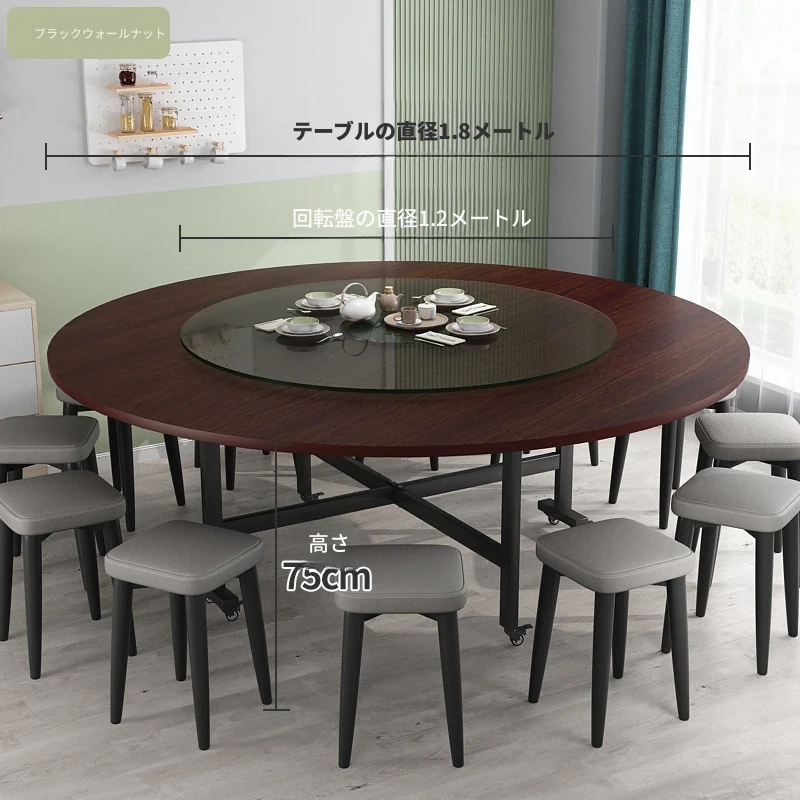 1.8メートルブラックウォルナット+1.2メートル強化ガラス回転盤+12角スツール
