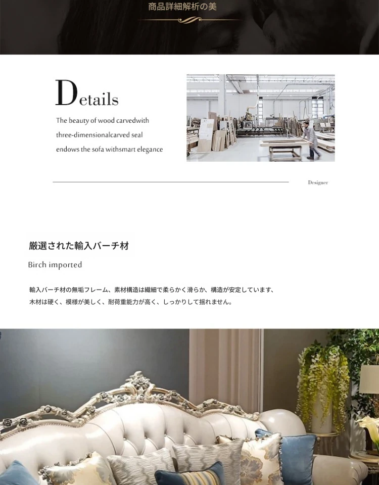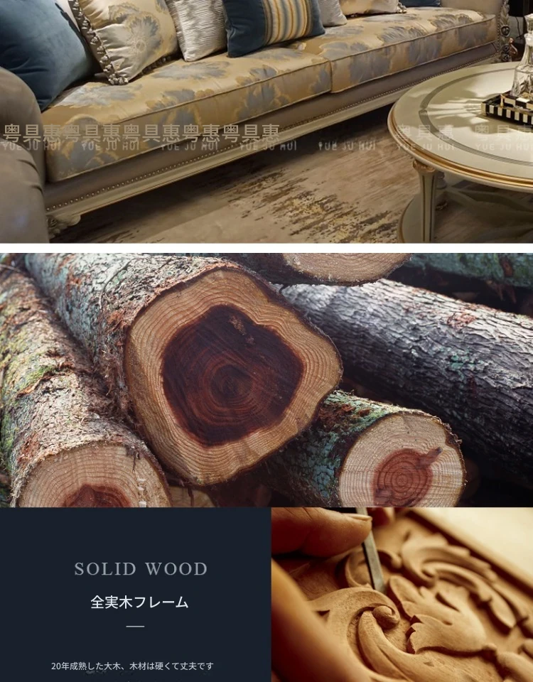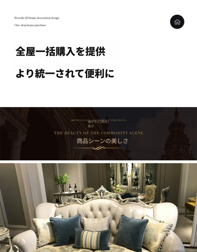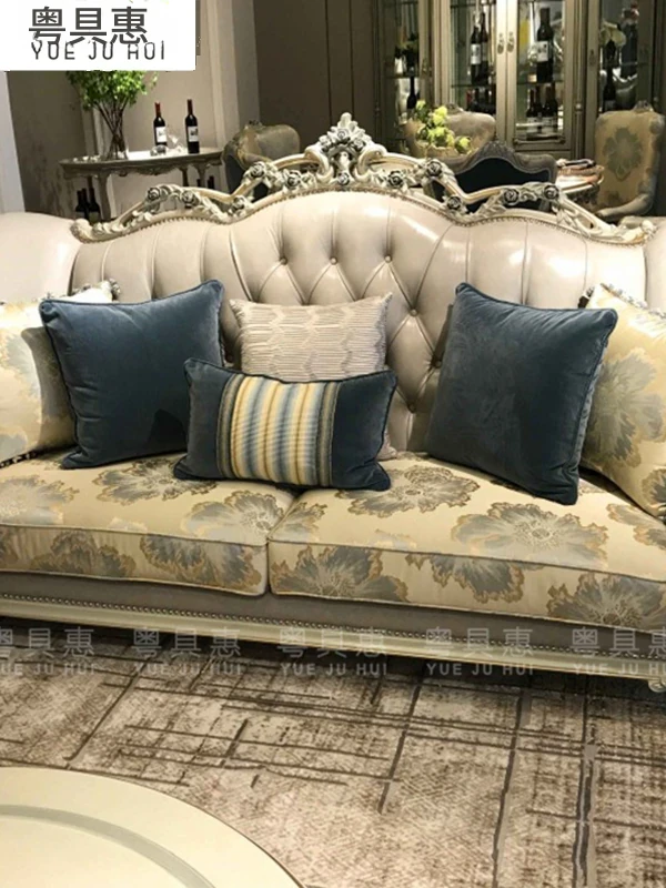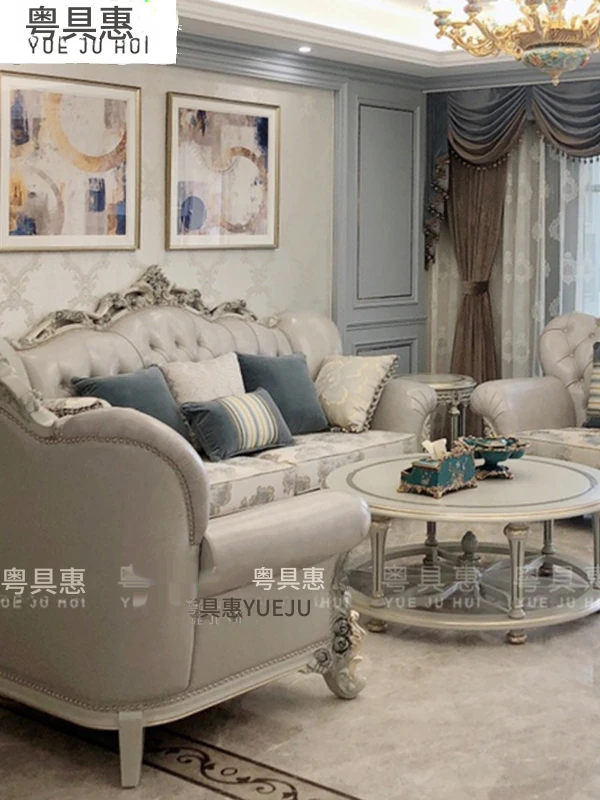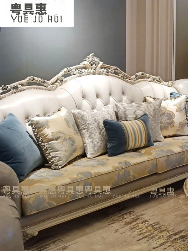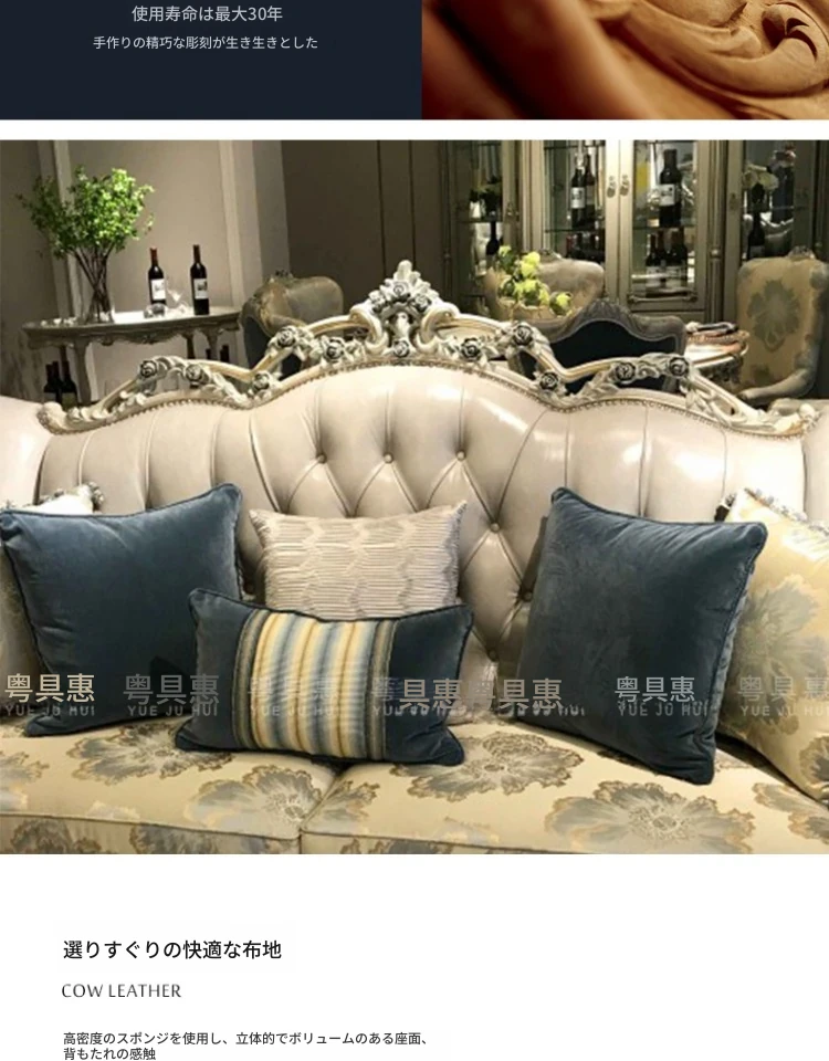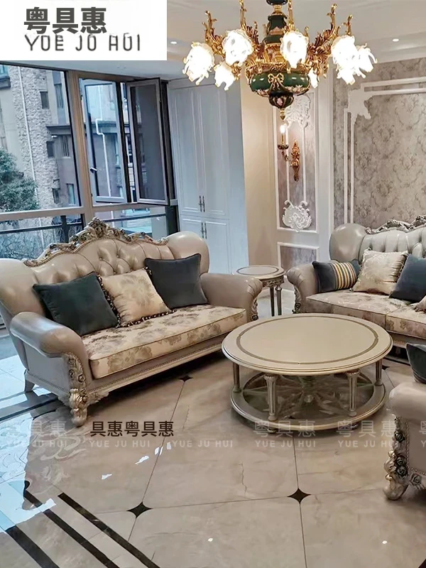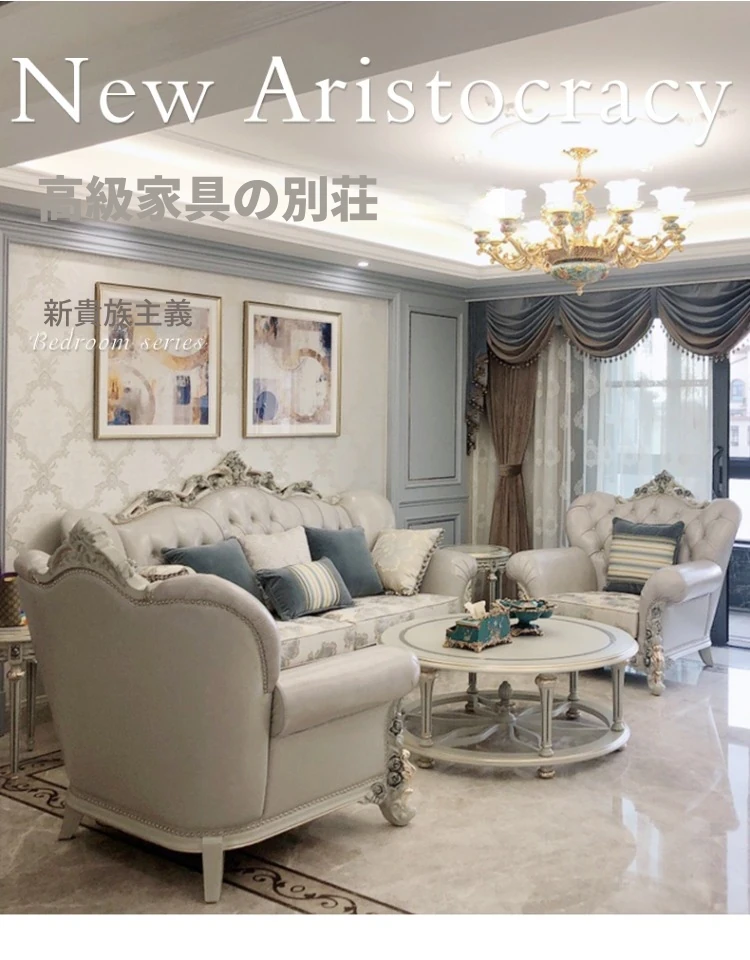 フランス風ラグジュアリーリビング 大型レザーソファセット 一級牛革使用 新古典スタイルの無垢材彫刻 一人掛け・二人掛け・三人掛けソファの組み合わせで、優雅な空間を演出します!