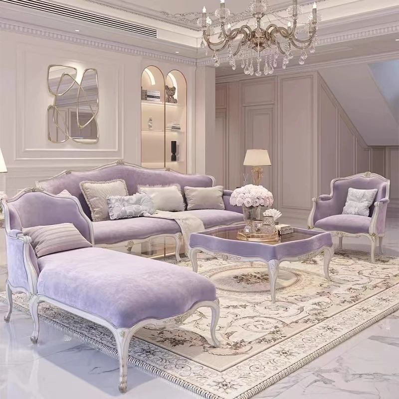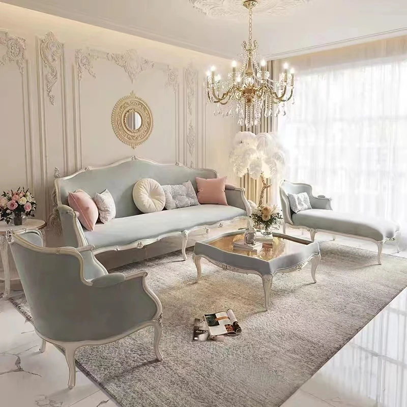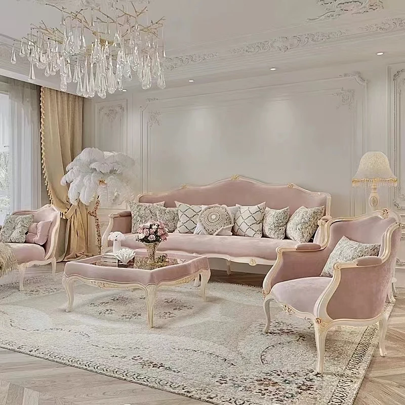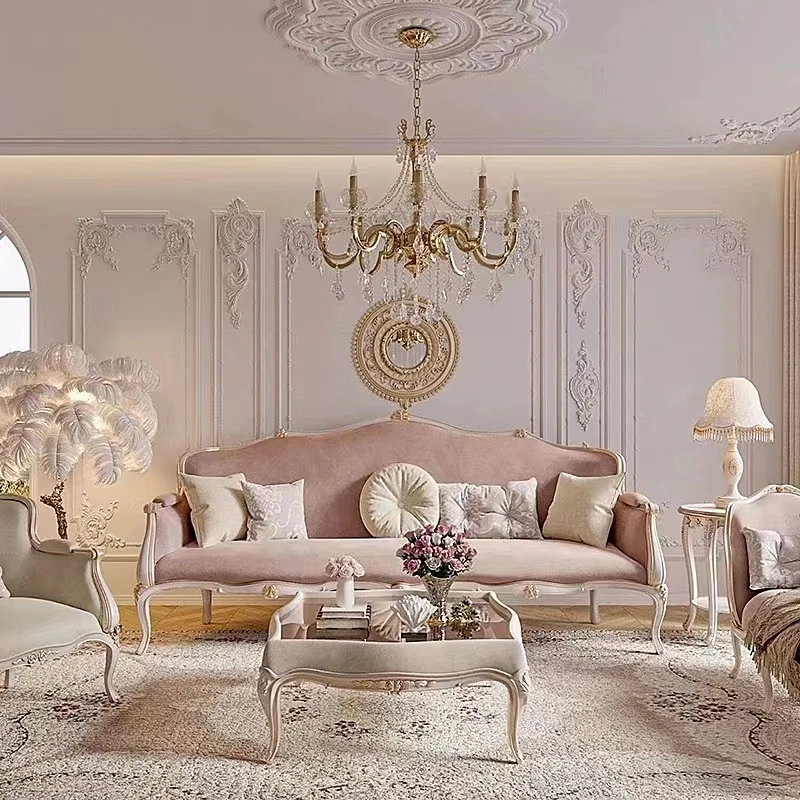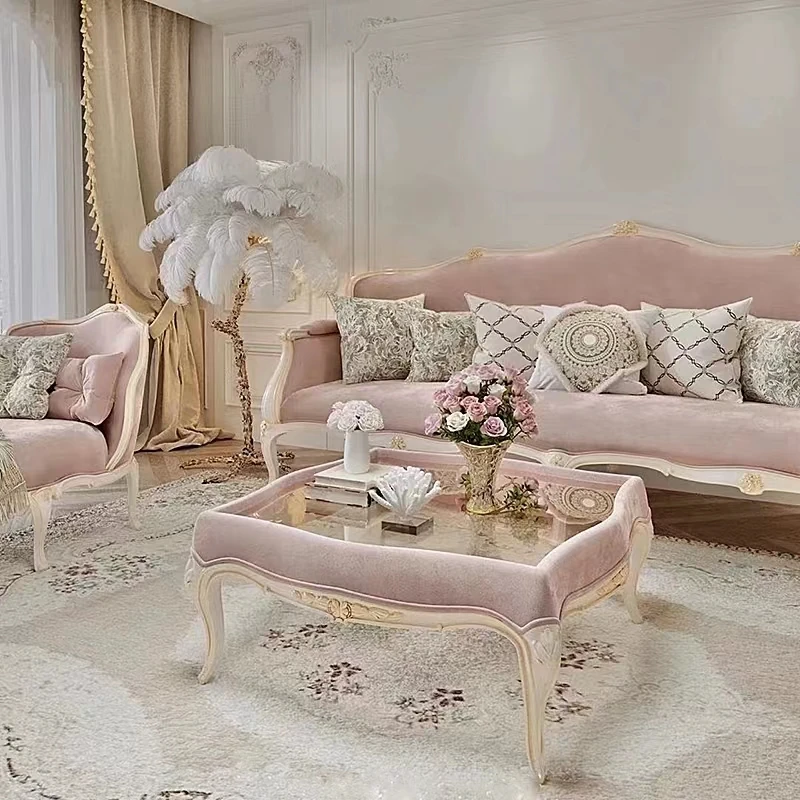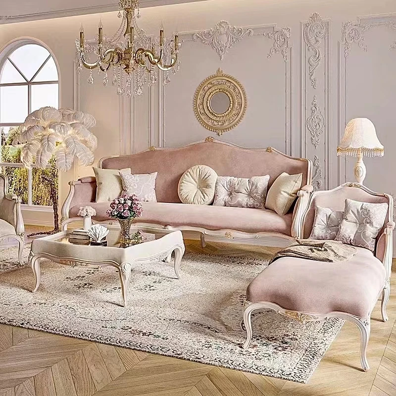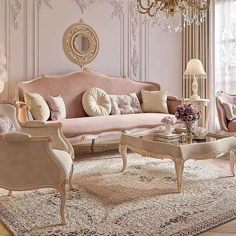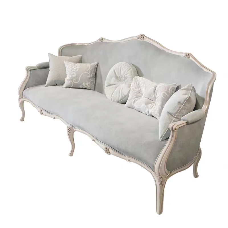 フレンチスタイルの無垢材ソファ、エレガントな彫刻デザイン、クリーム色の小型3人掛けソファとカウチセット、コンパクトなリビングにぴったり!高級感あふれる宮廷風家具で、洗練された空間を実現。