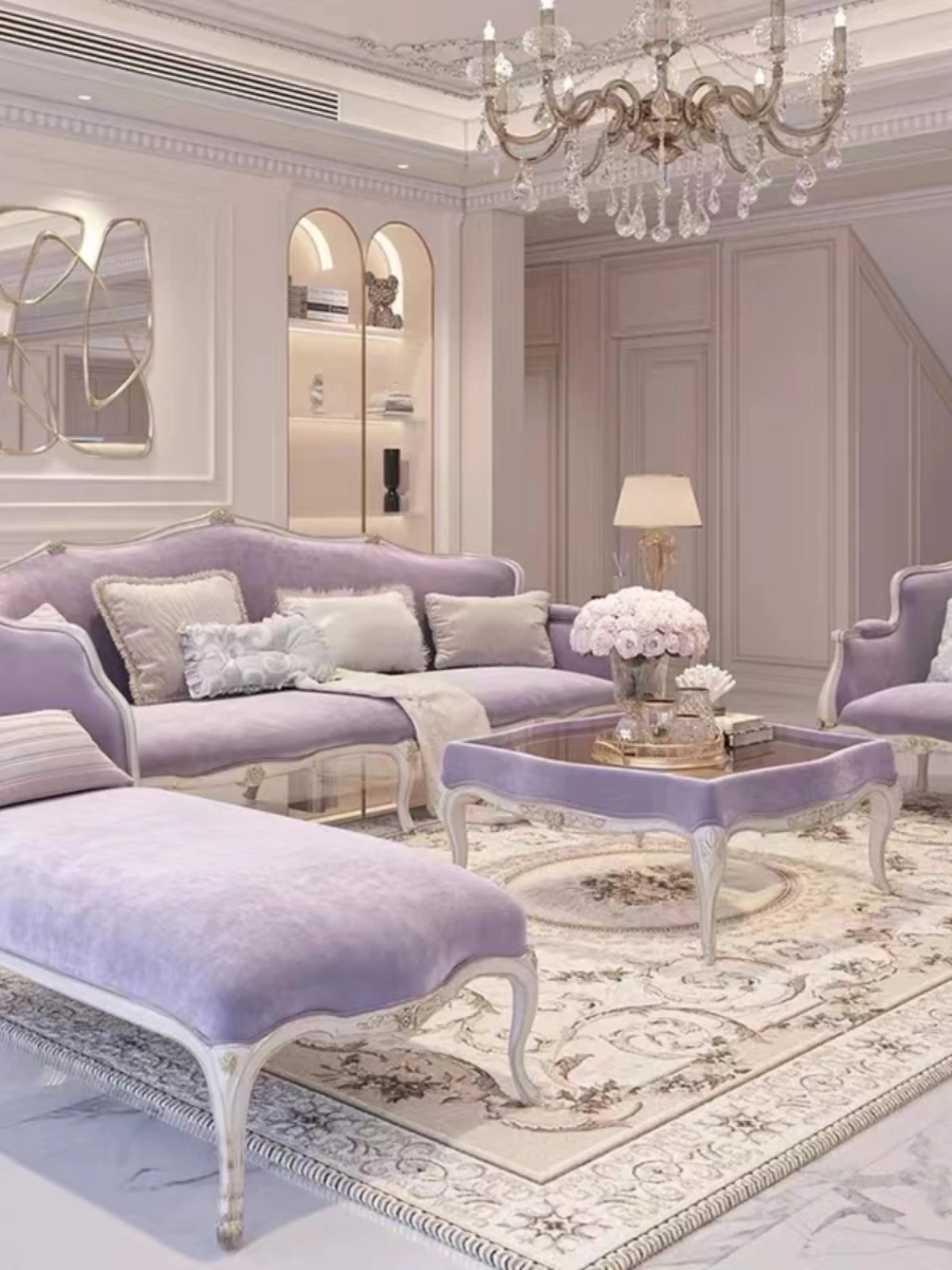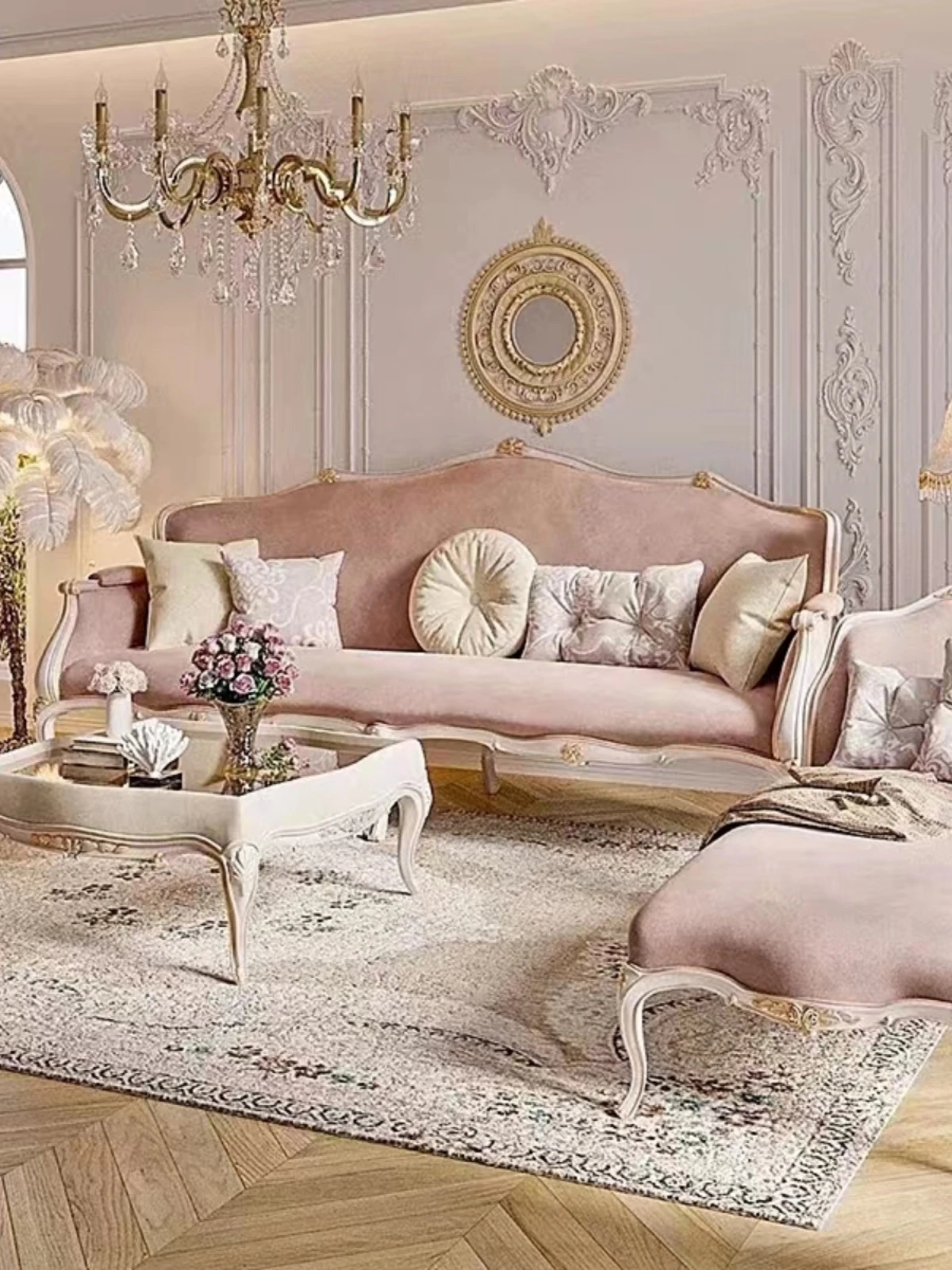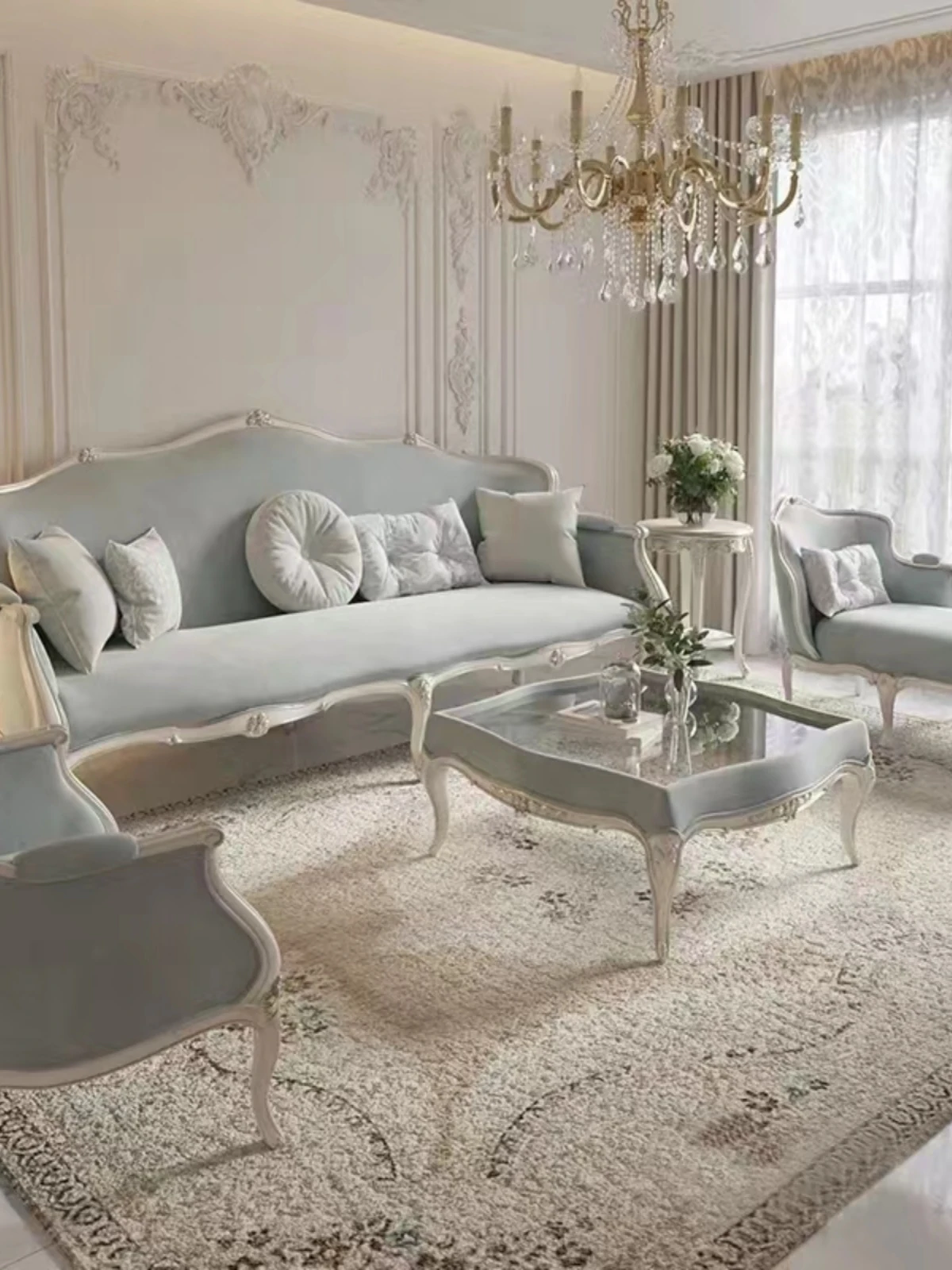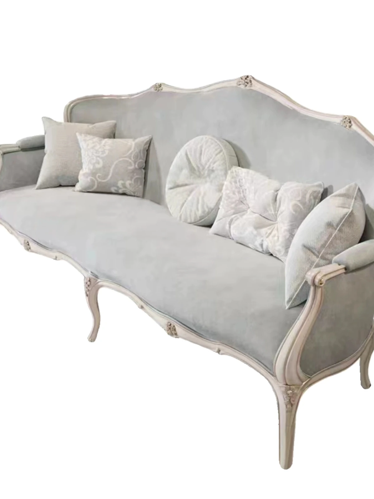 フレンチスタイルの無垢材ソファ、エレガントな彫刻デザイン、クリーム色の小型3人掛けソファとカウチセット、コンパクトなリビングにぴったり!高級感あふれる宮廷風家具で、洗練された空間を実現。