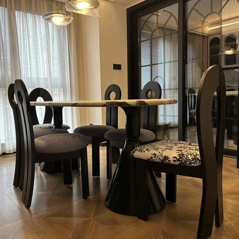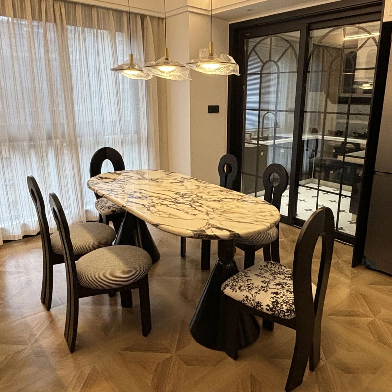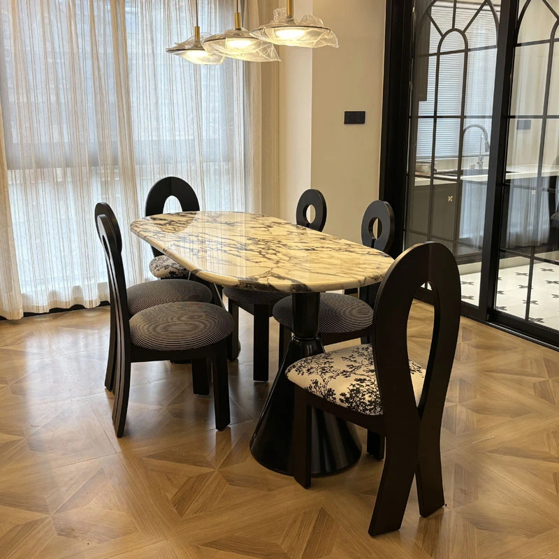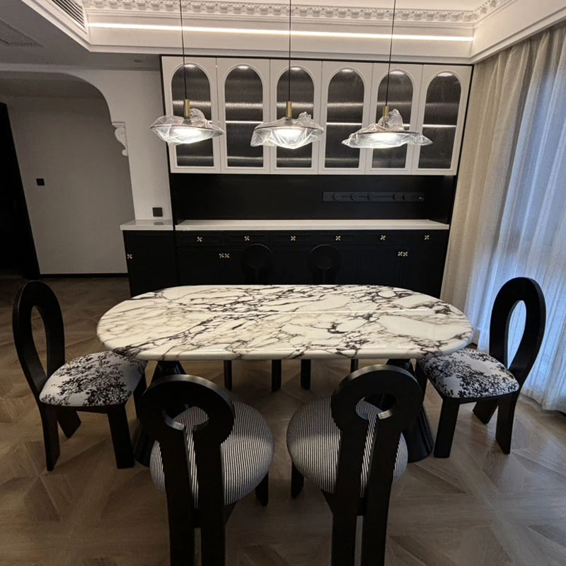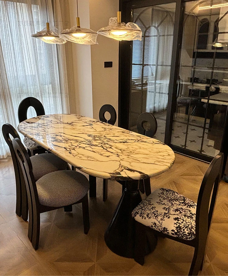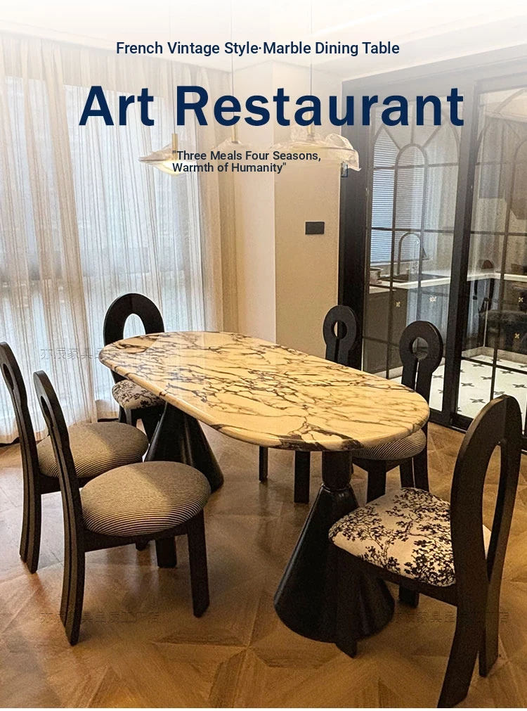 French Vintage Bulgari Marble Dining Table Set - Oval Chalice Design for Small Spaces, Perfect for Home Use, Includes Stylish Chairs, Embrace Timeless Elegance in Your Dining Room!