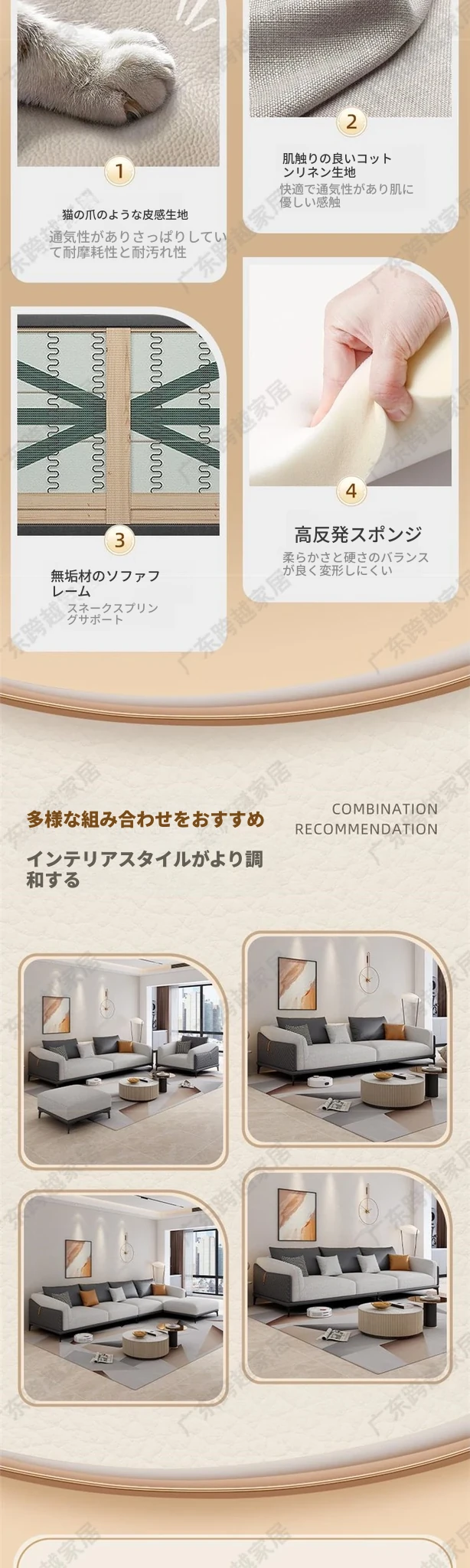 直排【大四人位】3.4メートル+フットレスト(高密度スポンジ)エレガントベージュ