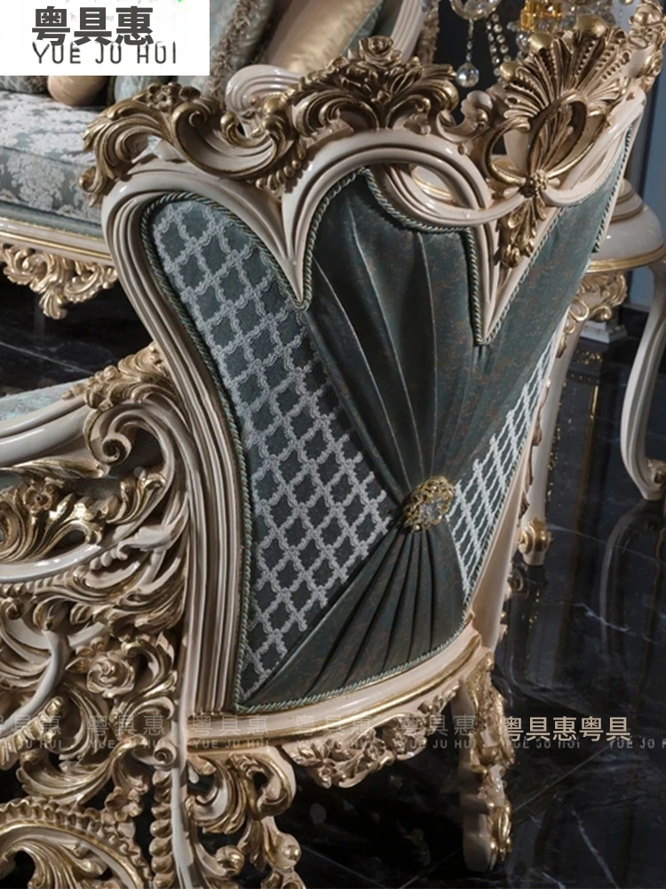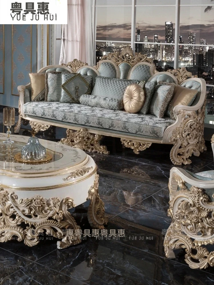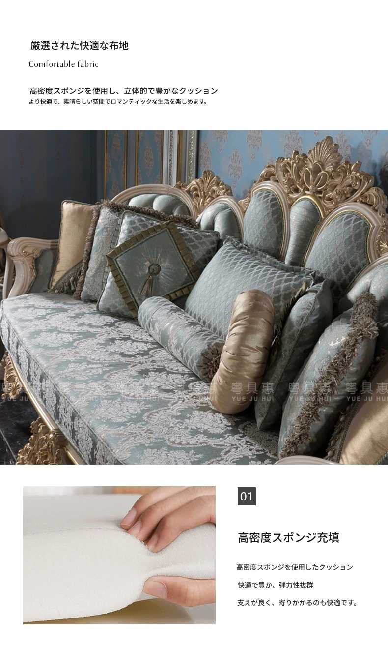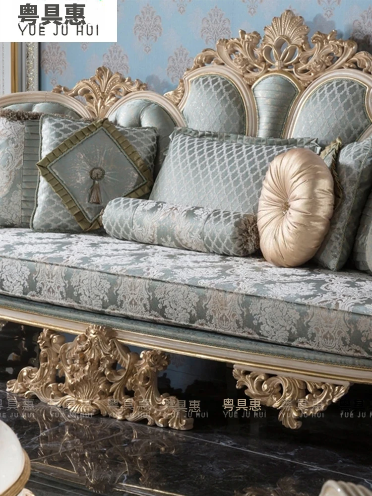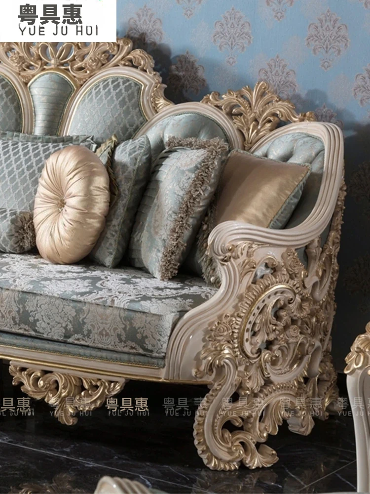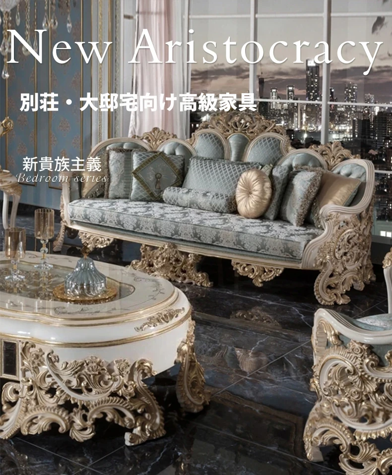 豪華なフレンチスタイルの布製ソファー|エレガントな宮廷デザイン|広々とした大邸宅に最適な実木彫刻の123コンビネーションソファ|最高の快適さとスタイルをあなたのリビングに!