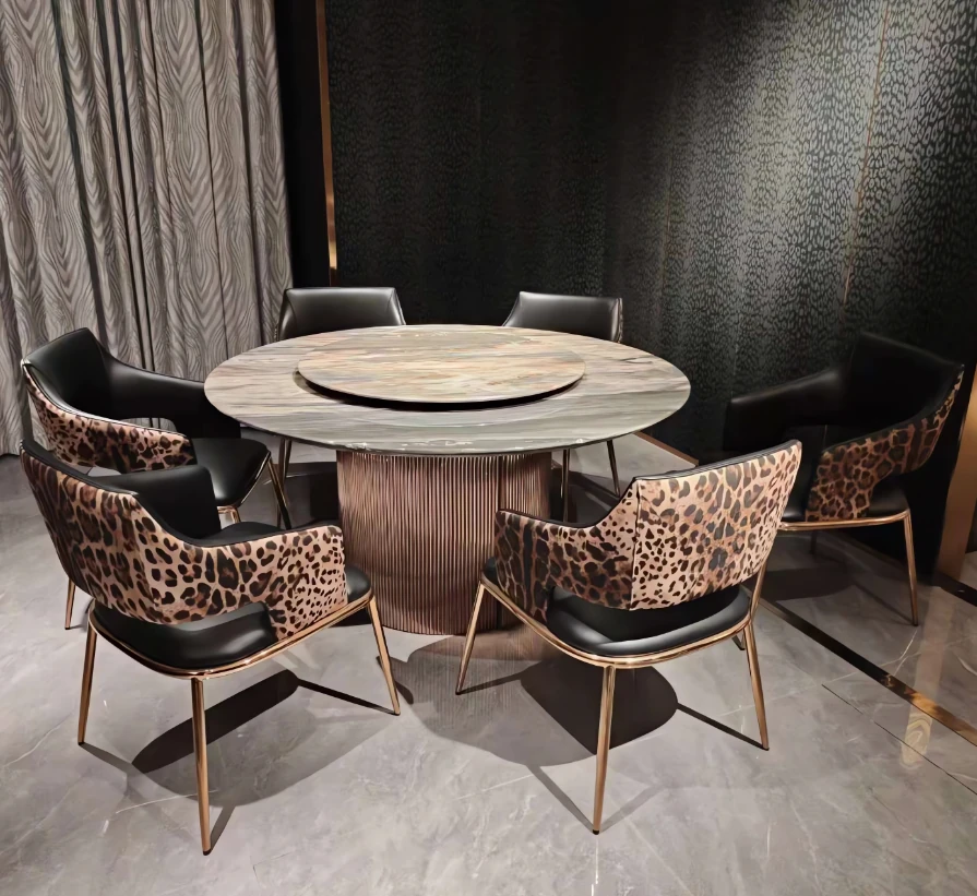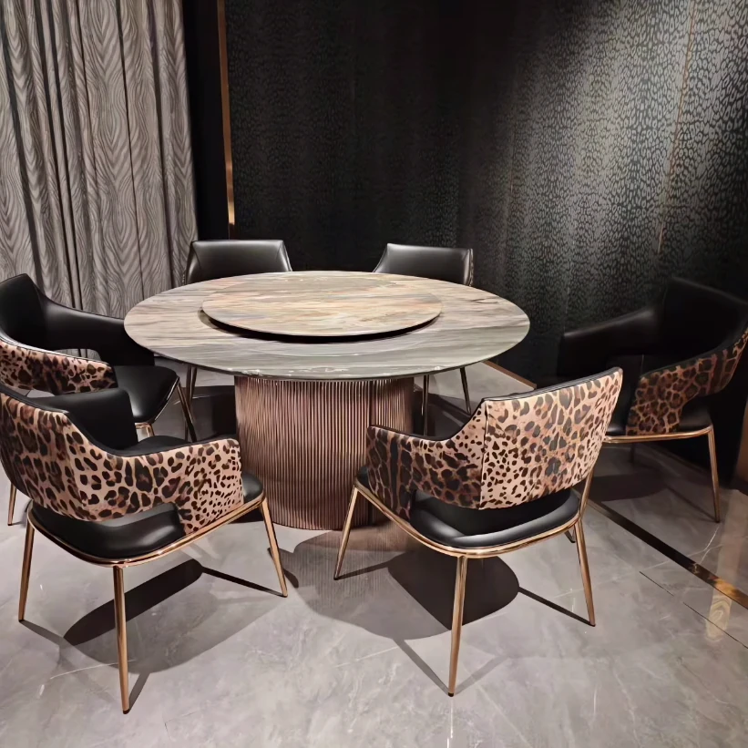 高級感溢れる本革製ソフトパックダイニングチェア、アームレスト付きで快適な背もたれ。モダンでシンプルなデザイン、豪華な別荘やレストランにぴったりなテーブル椅子セット。
