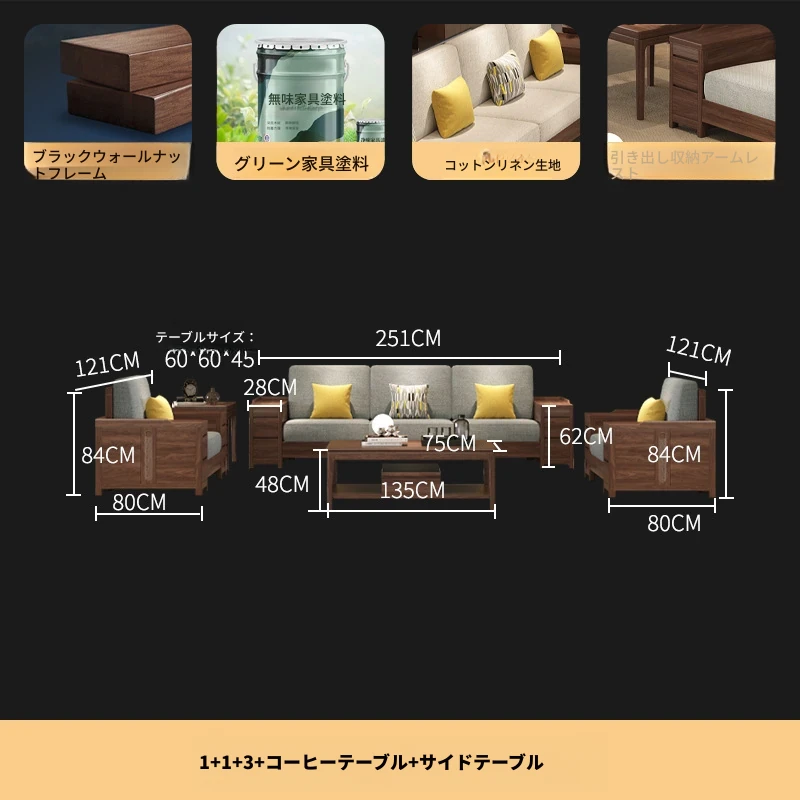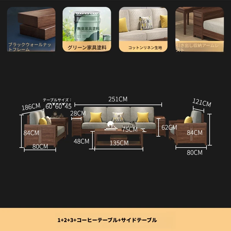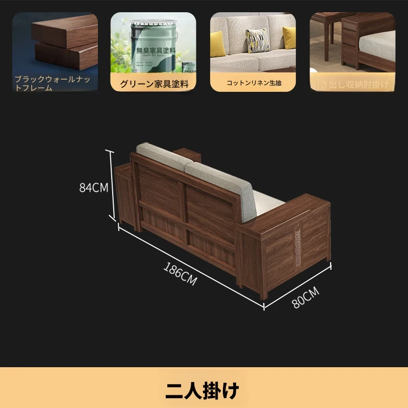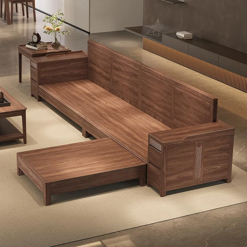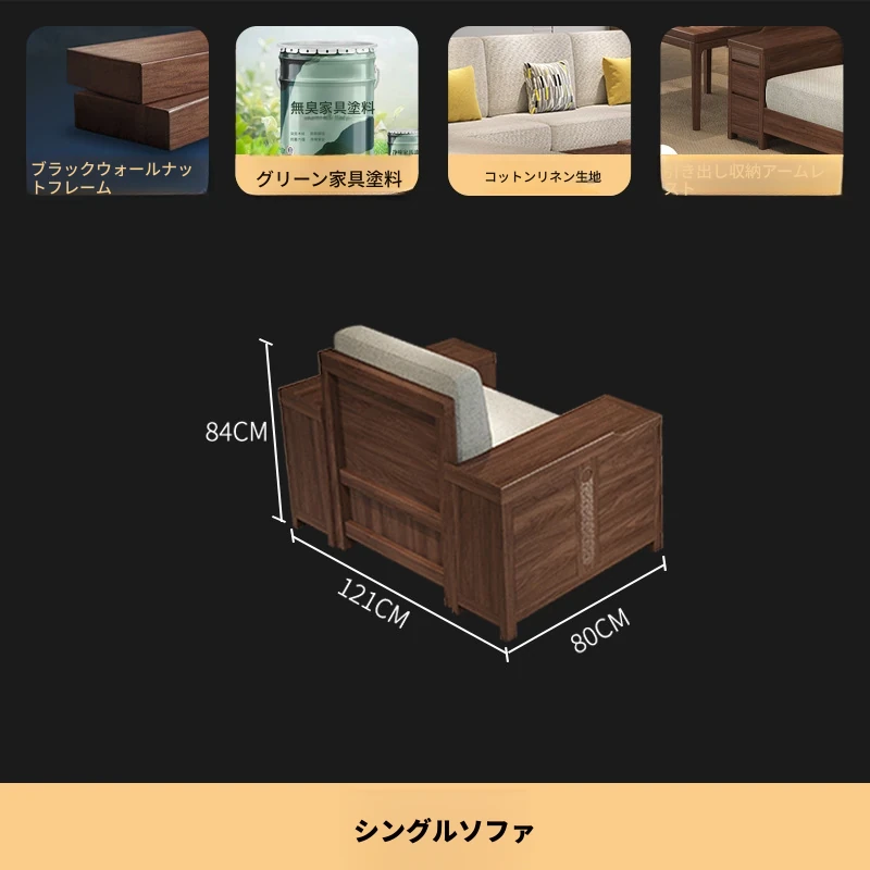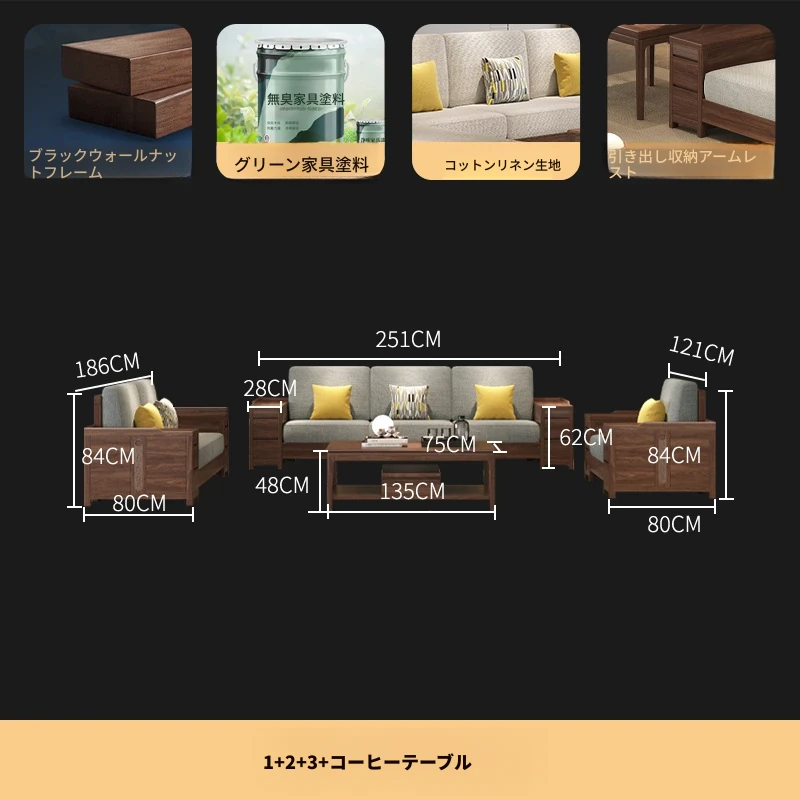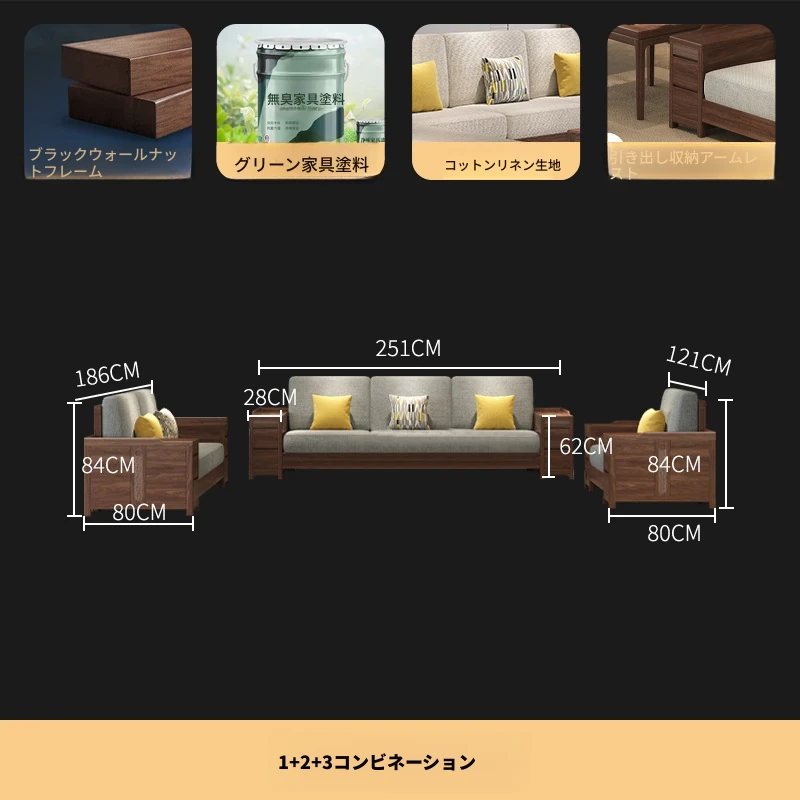 ブラックウォールナット製ソファセット|ラグジュアリーなデザインで小型スペースにもぴったり!高品質な木材とファブリックを使用した角型ソファ。ヴィラやリビングルームに最適なスタイリッシュな家具。