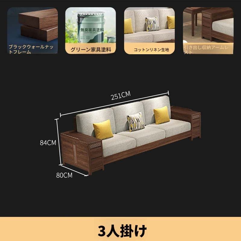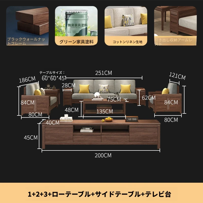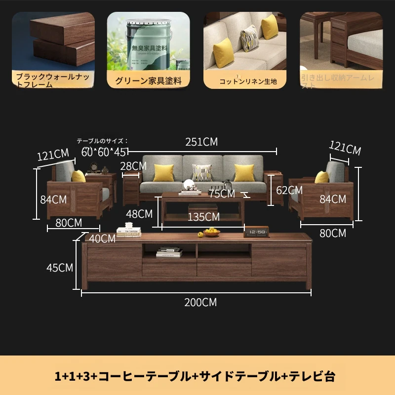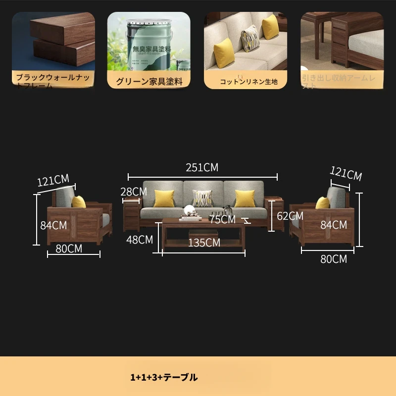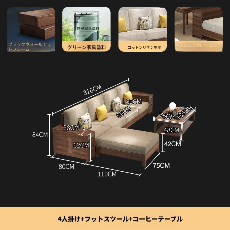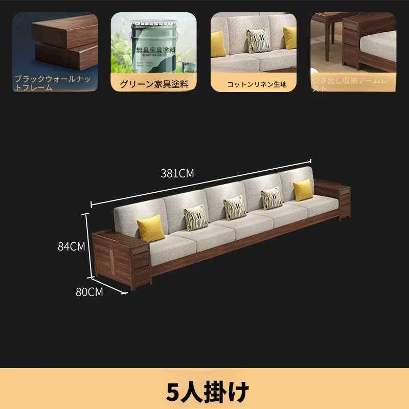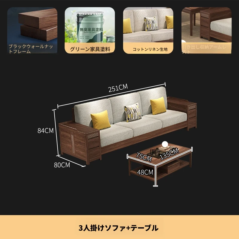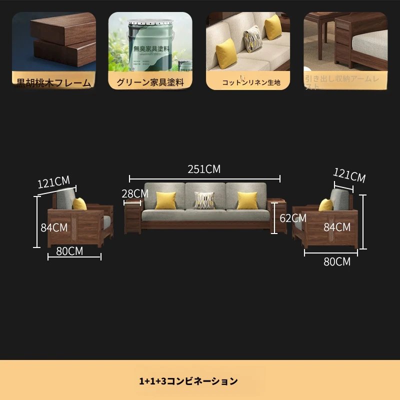 ブラックウォールナット製ソファセット|ラグジュアリーなデザインで小型スペースにもぴったり!高品質な木材とファブリックを使用した角型ソファ。ヴィラやリビングルームに最適なスタイリッシュな家具。