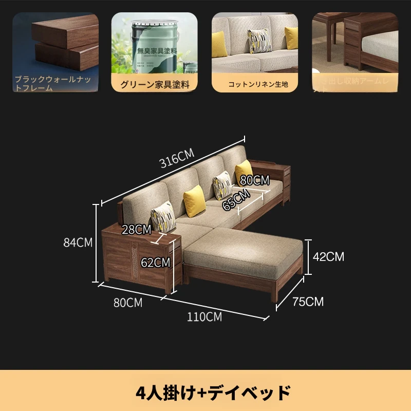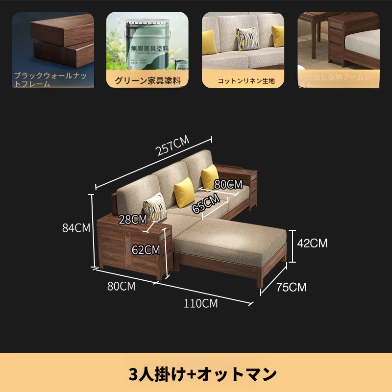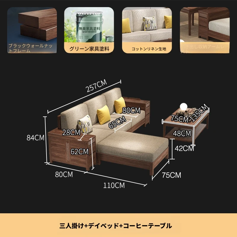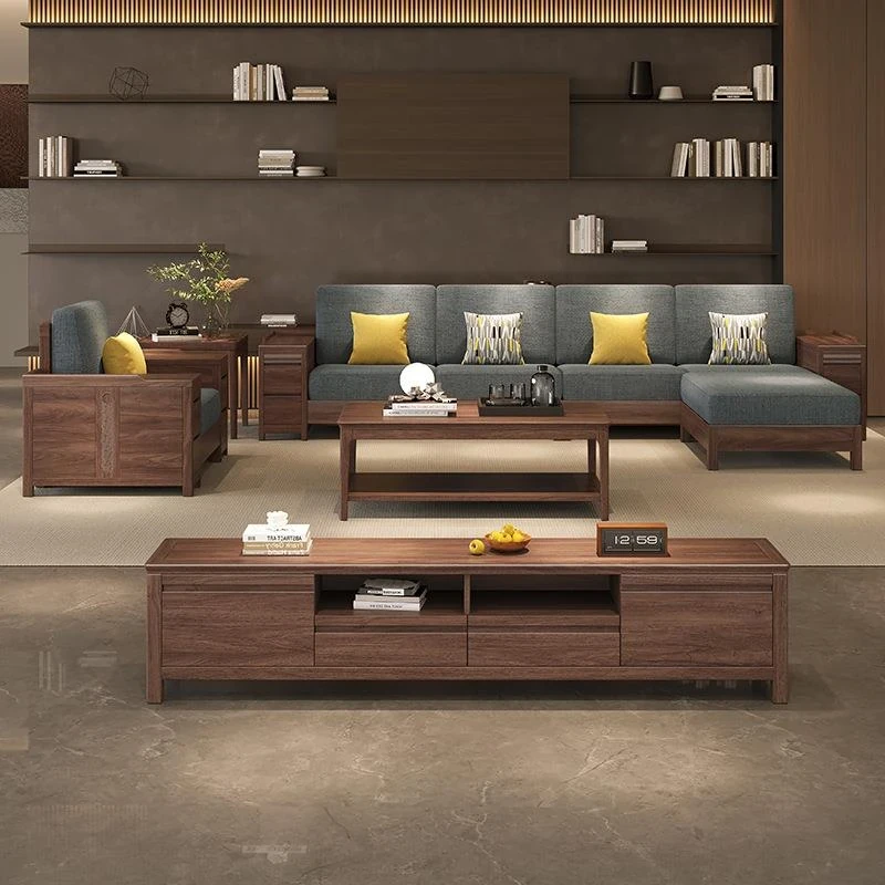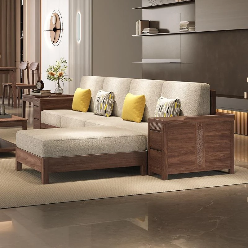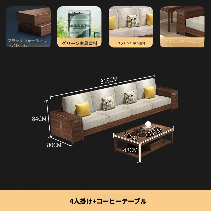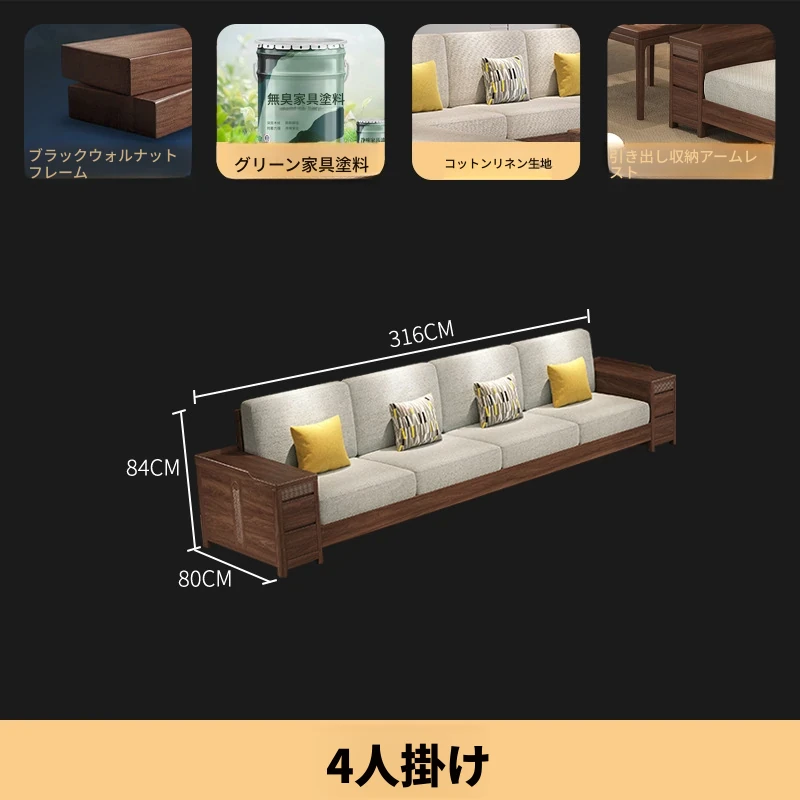 ブラックウォールナット製ソファセット|ラグジュアリーなデザインで小型スペースにもぴったり!高品質な木材とファブリックを使用した角型ソファ。ヴィラやリビングルームに最適なスタイリッシュな家具。