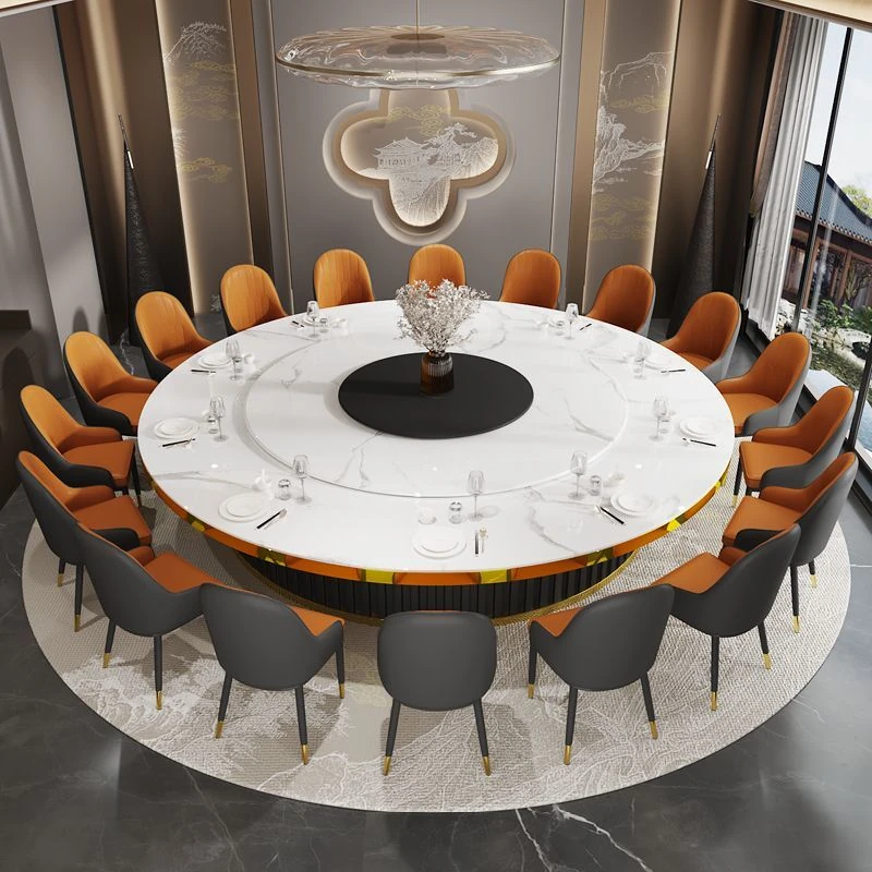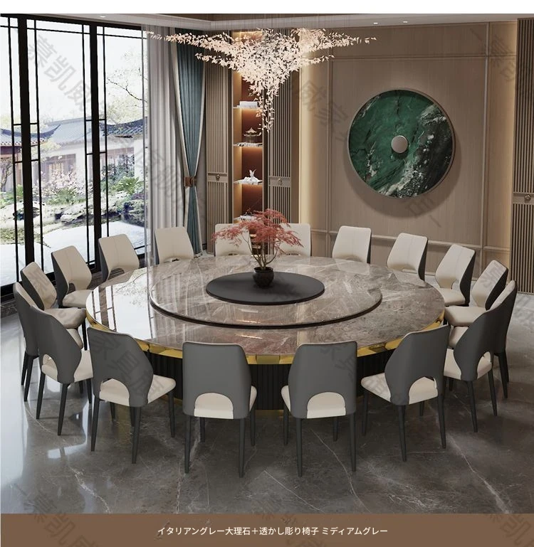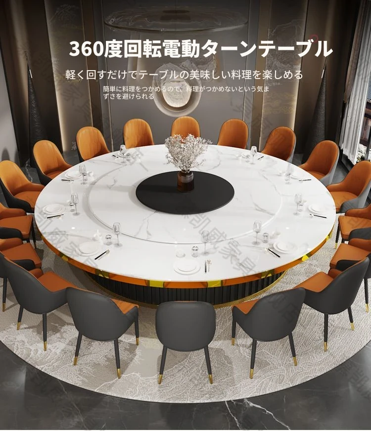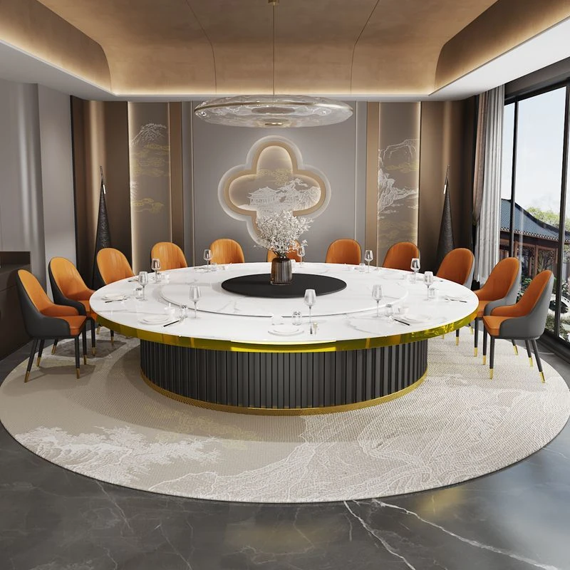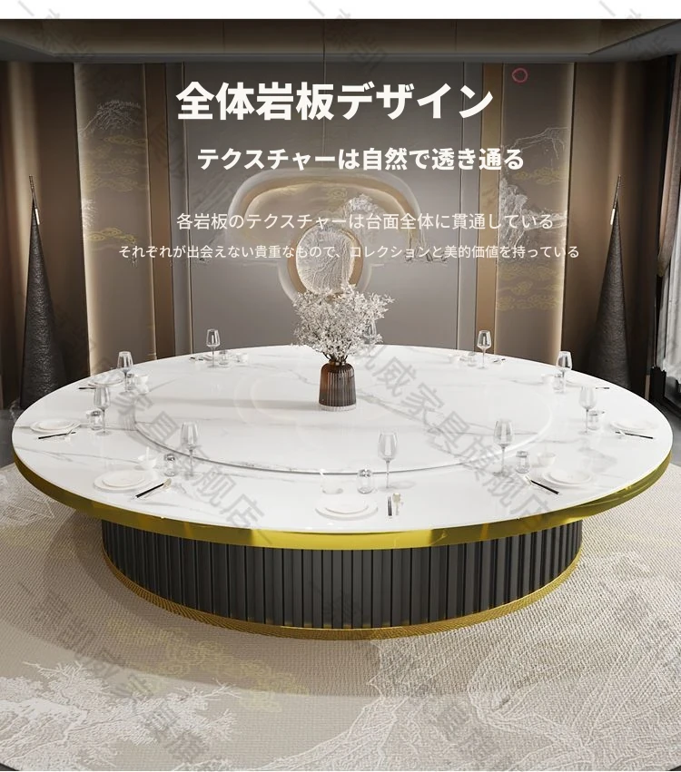 ホテルのラグジュアリーな岩板ダイニングテーブル、電動式・電磁調理器付き、マーブルデザインの個室用ラウンドテーブル。ビジネスディナーや飲食店に最適、洗練された空間を演出します。