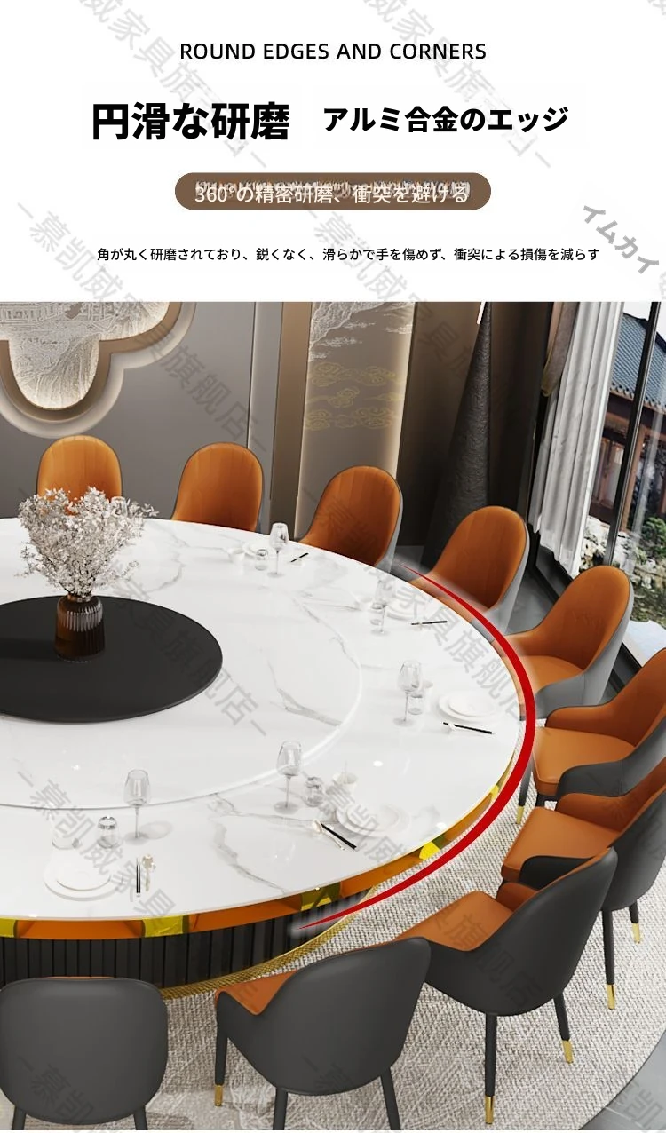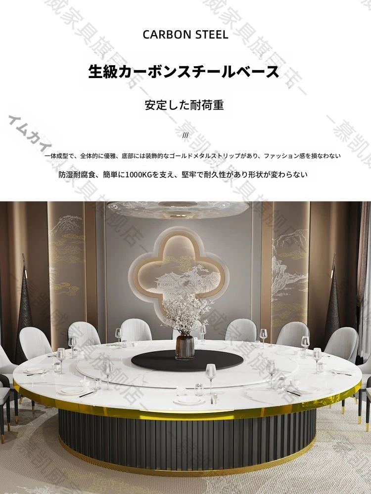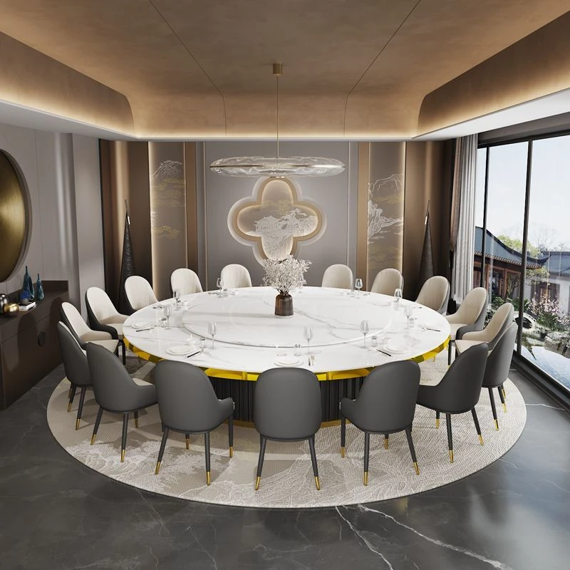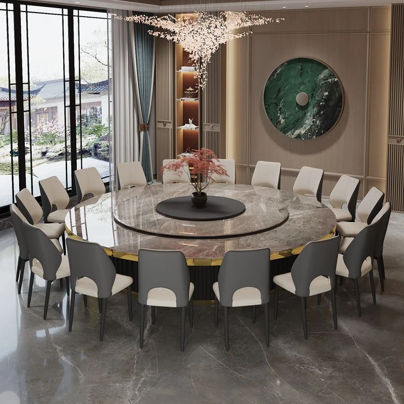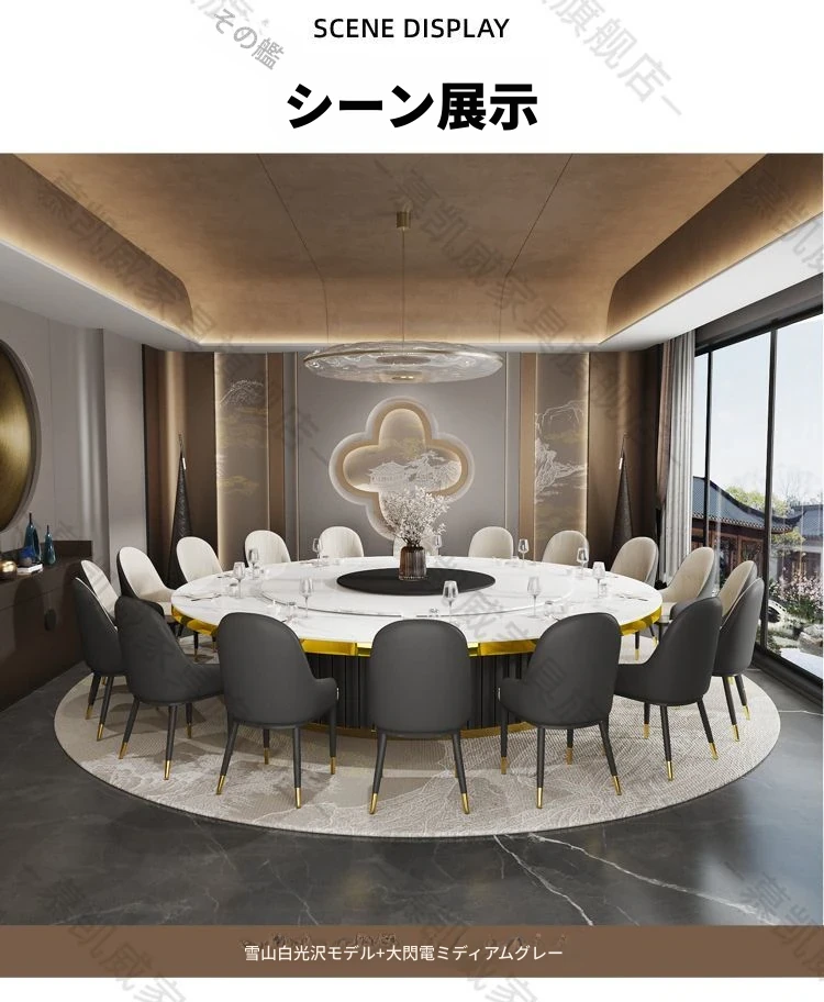 ホテルのラグジュアリーな岩板ダイニングテーブル、電動式・電磁調理器付き、マーブルデザインの個室用ラウンドテーブル。ビジネスディナーや飲食店に最適、洗練された空間を演出します。