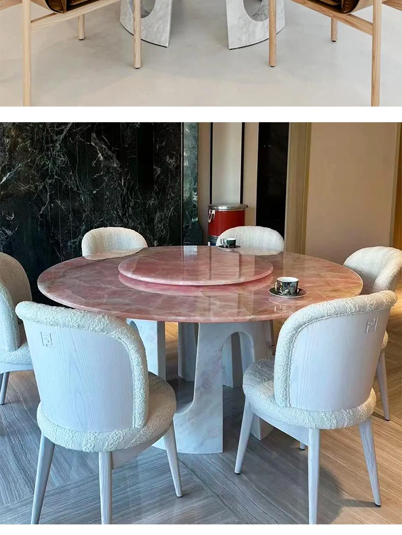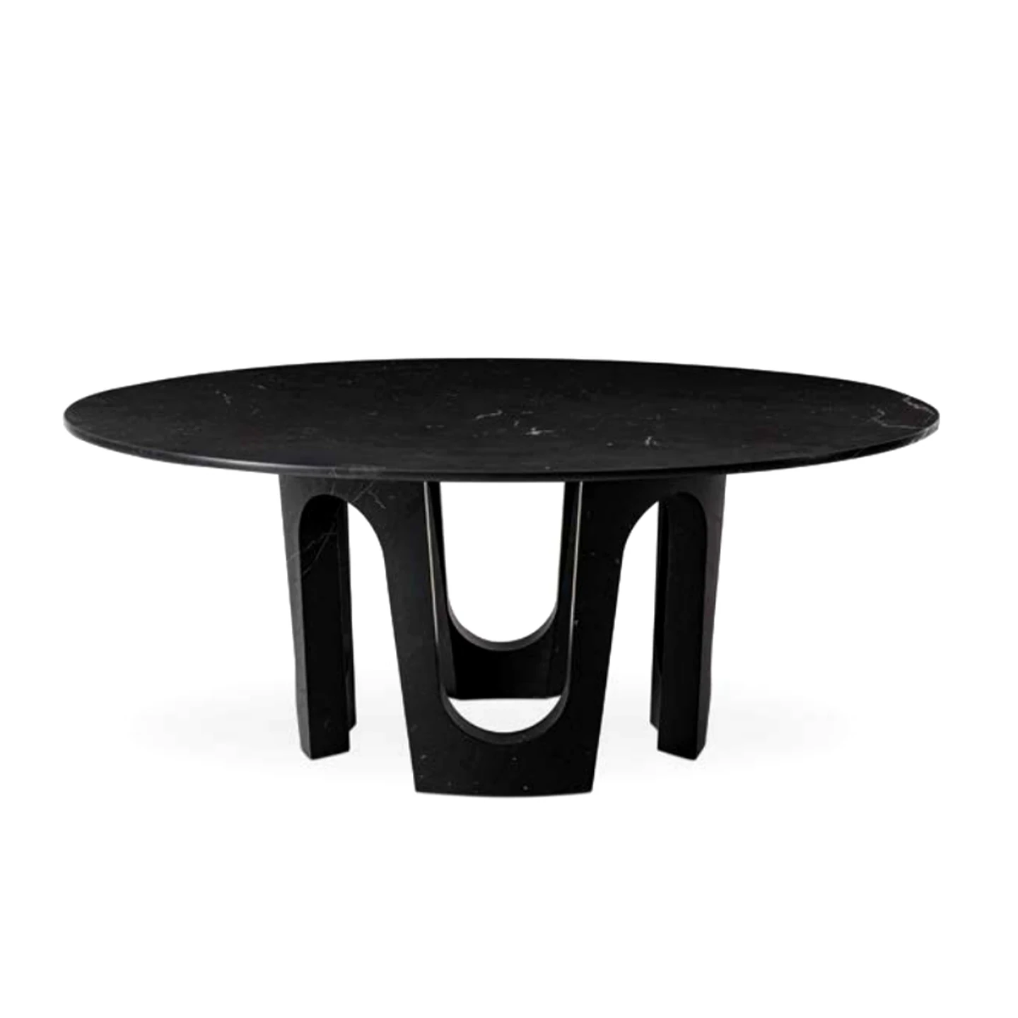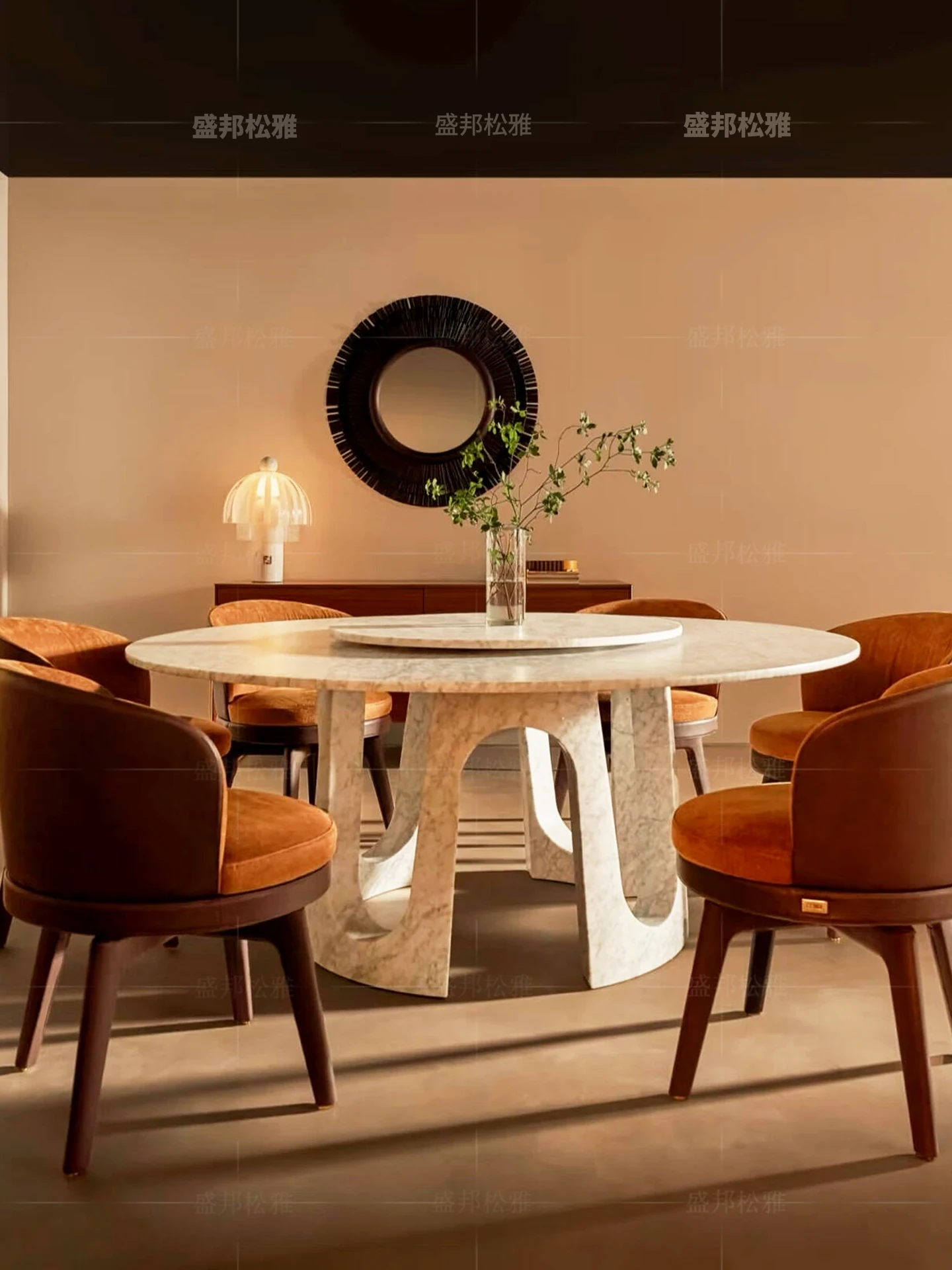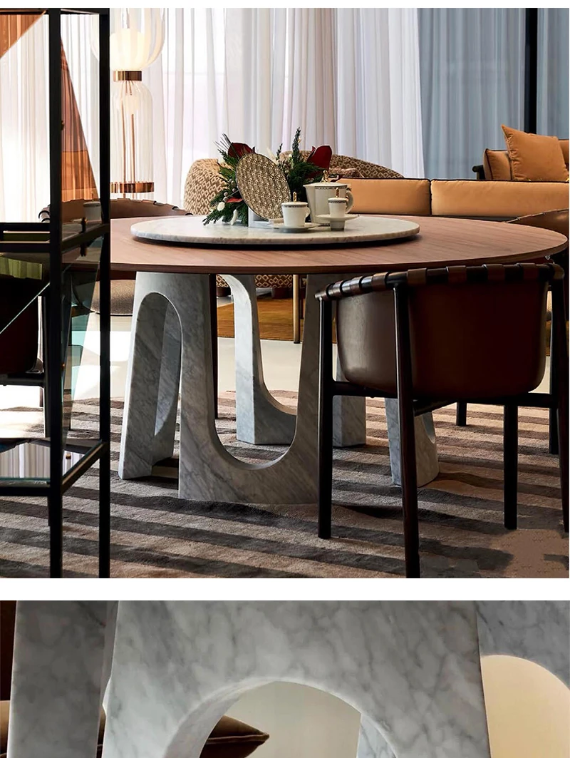 イタリアンラグジュアリー大理石円形ダイニングテーブル - モダンデザインのアーチ型、高級感溢れる広々としたレストラン向け、魅力的なクリエイティブスタイルのヴィラ用高級食卓。