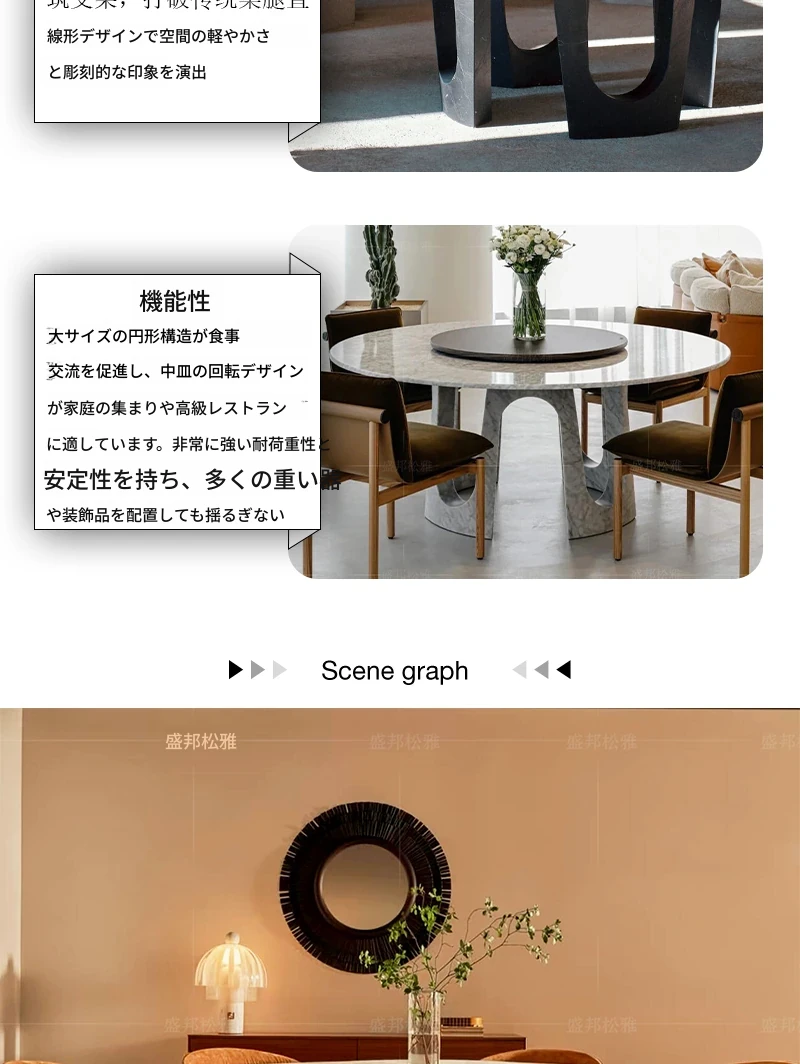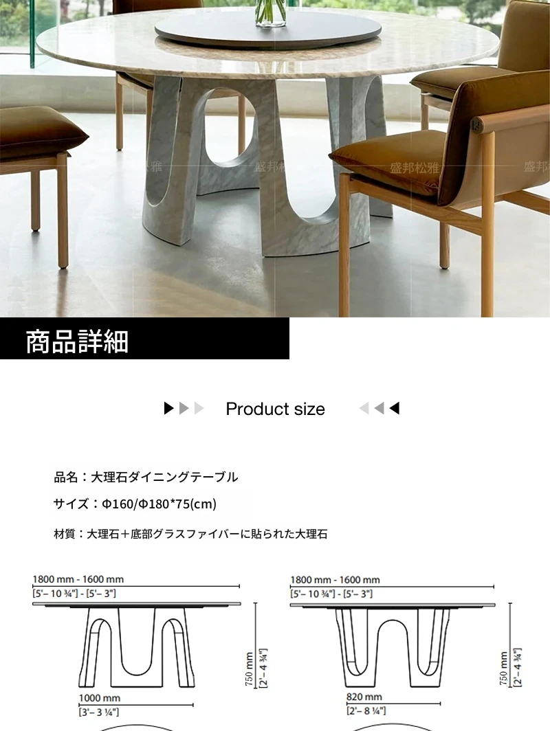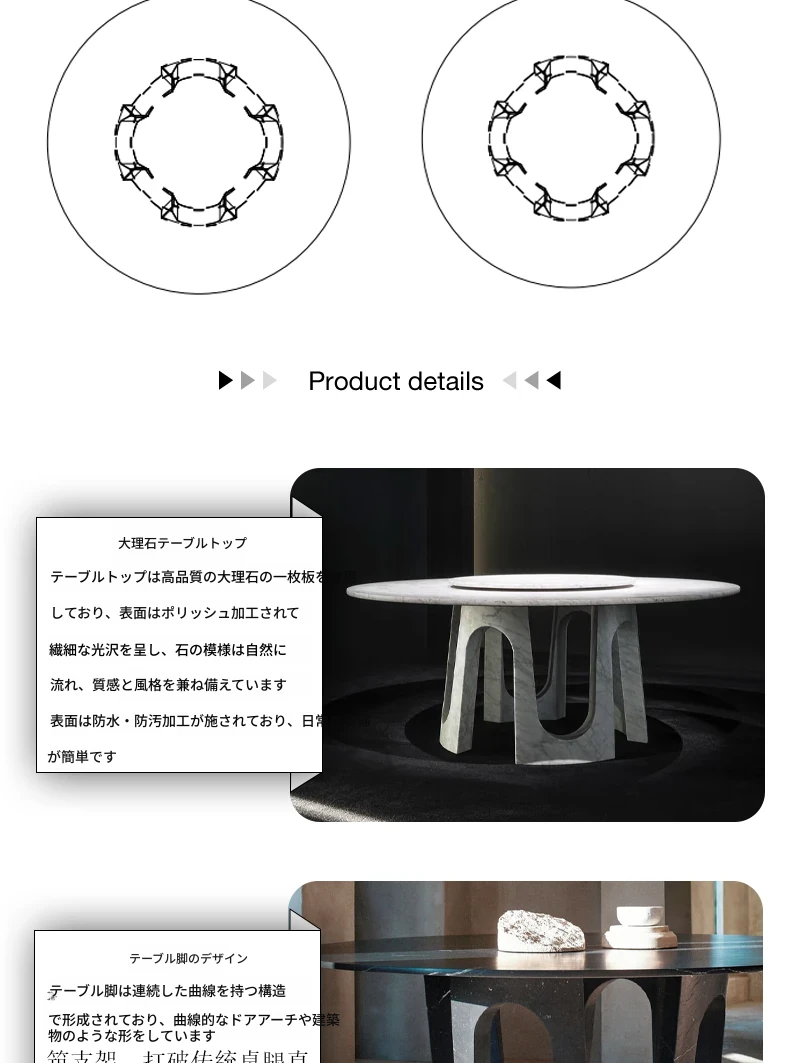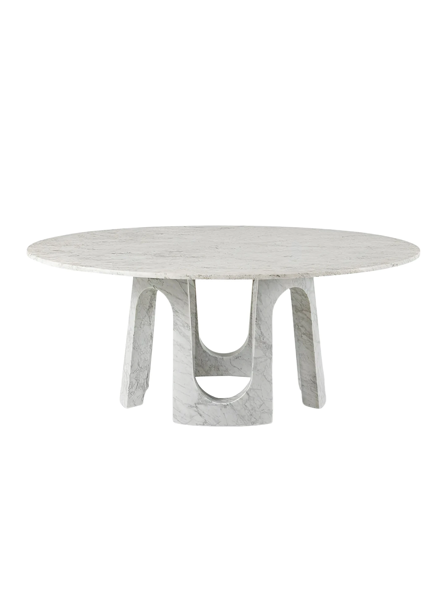イタリアンラグジュアリー大理石円形ダイニングテーブル - モダンデザインのアーチ型、高級感溢れる広々としたレストラン向け、魅力的なクリエイティブスタイルのヴィラ用高級食卓。