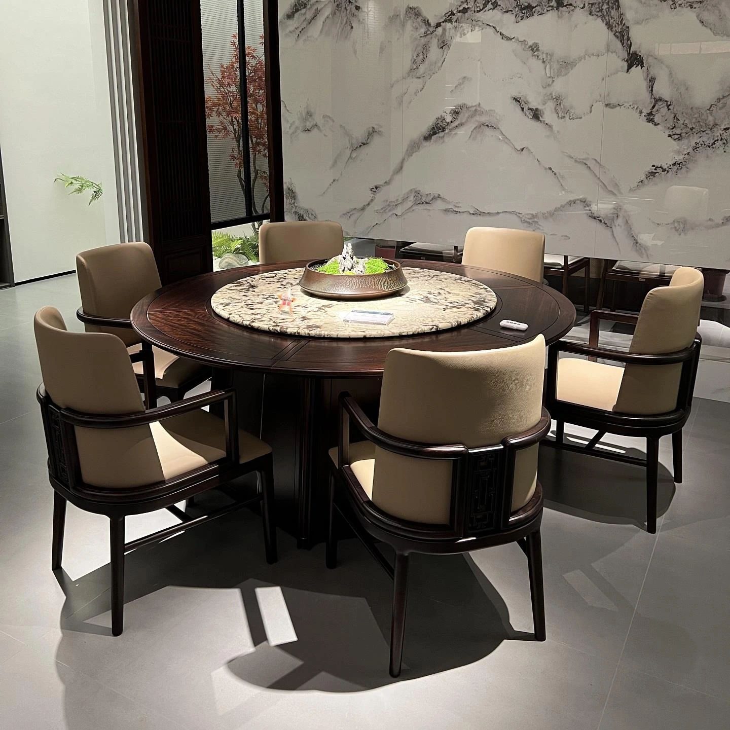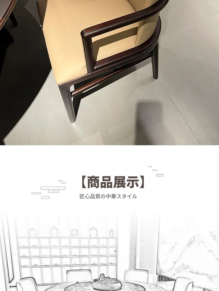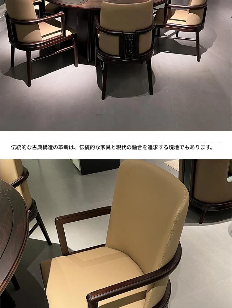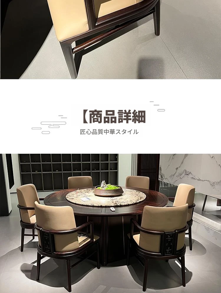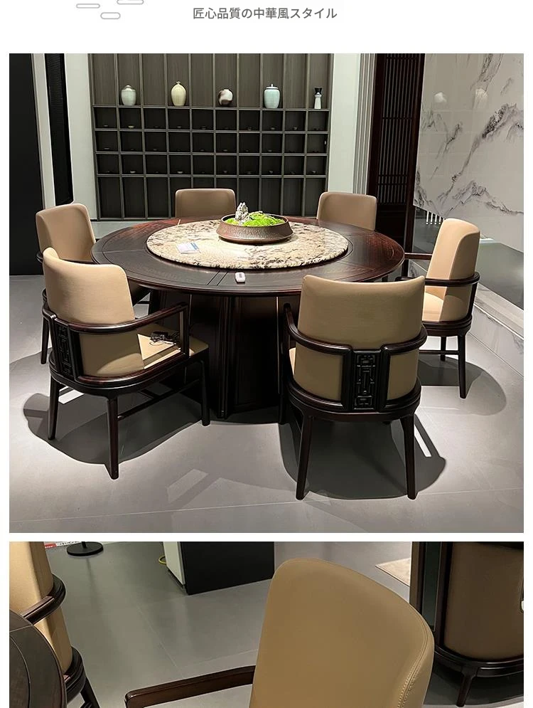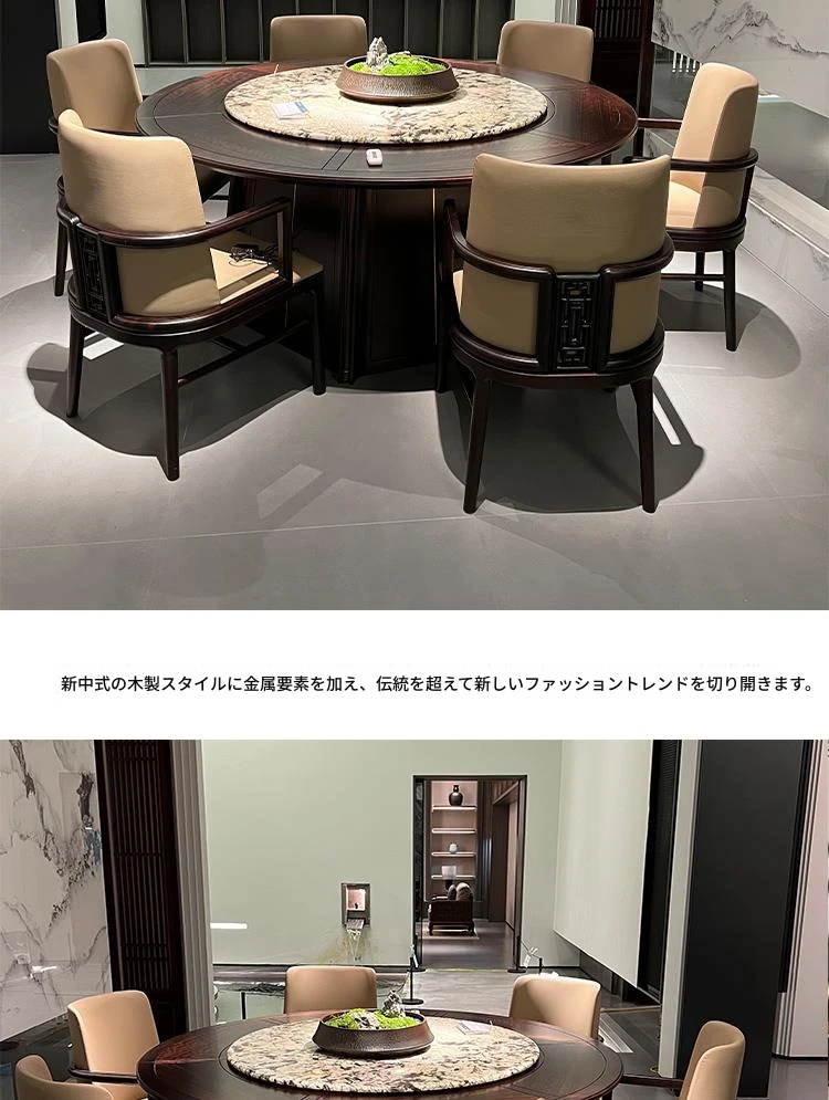 新中式スタイルの天然木製ダイニングテーブル&チェアセット - ウッディな魅力、全実木のラウンドテーブルは大小様々な家に最適!回転式デザインで便利さも追求。