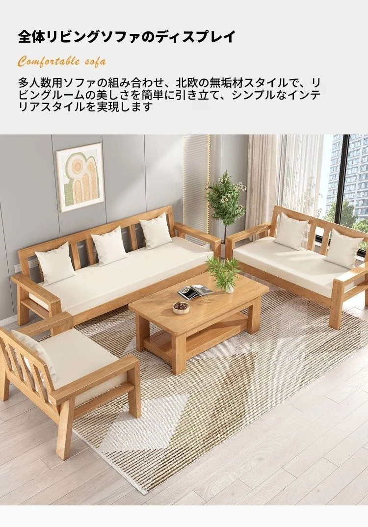 ナチュラルカラーの3人掛けとダブルとシングルとローテーブル