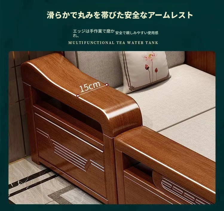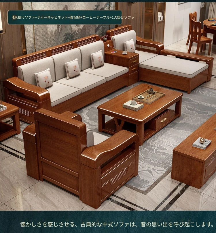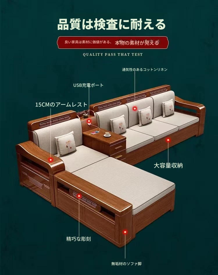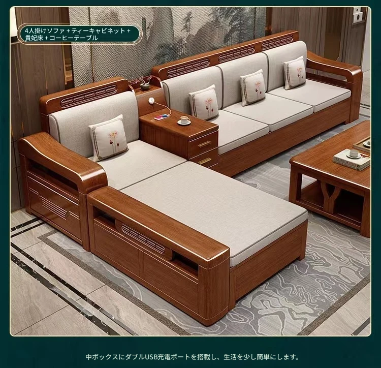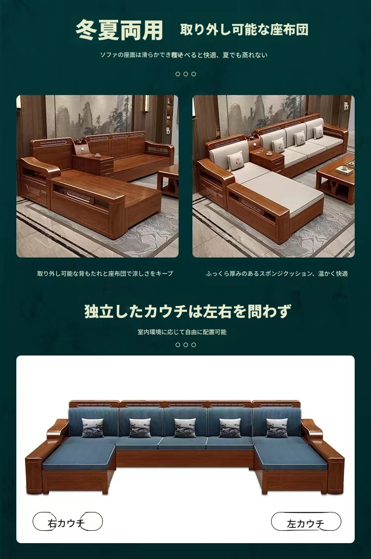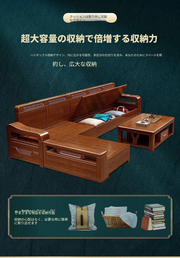 ウォールナット無垢材の高箱収納ソファセット - モダン中式コーナーソファ、スタイリッシュで機能的なリビングルーム家具!あなたの空間に上質な温もりをプラス!