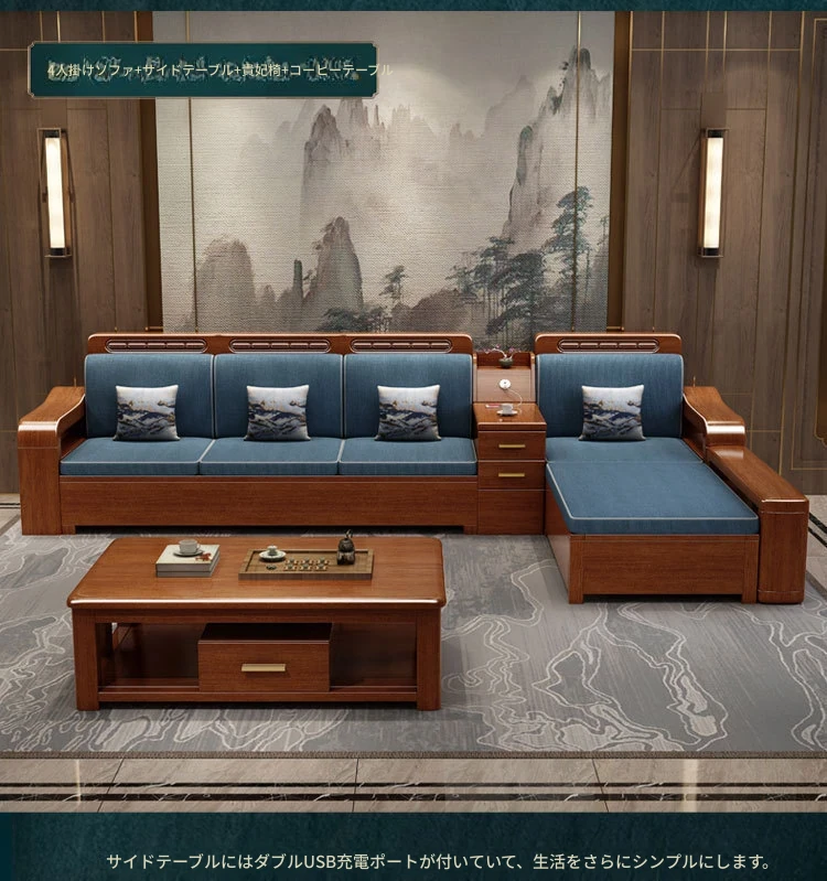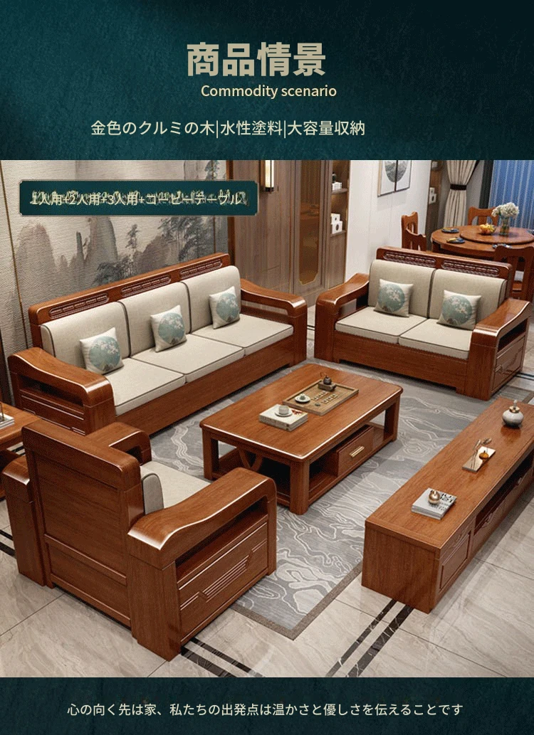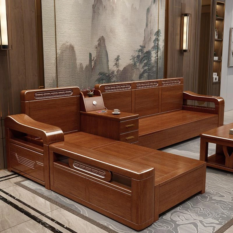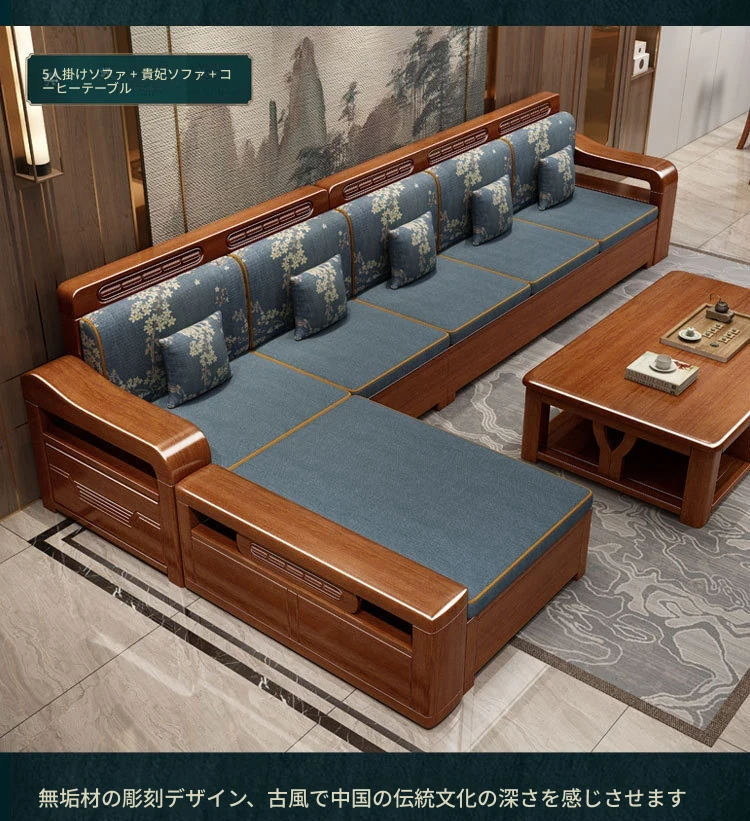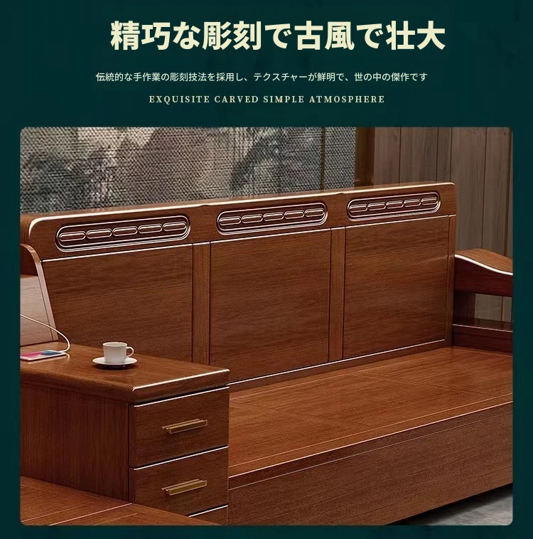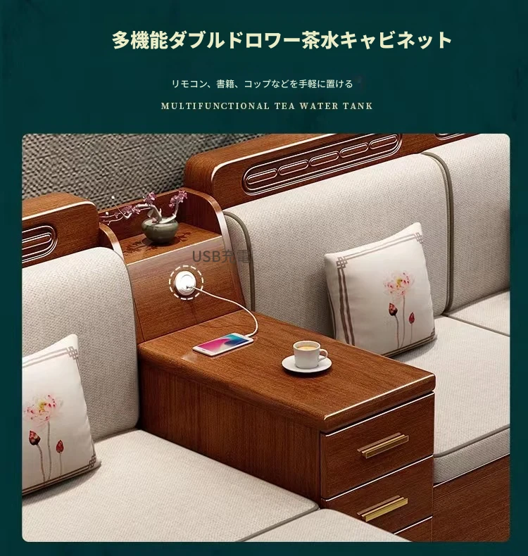 ウォールナット無垢材の高箱収納ソファセット - モダン中式コーナーソファ、スタイリッシュで機能的なリビングルーム家具!あなたの空間に上質な温もりをプラス!