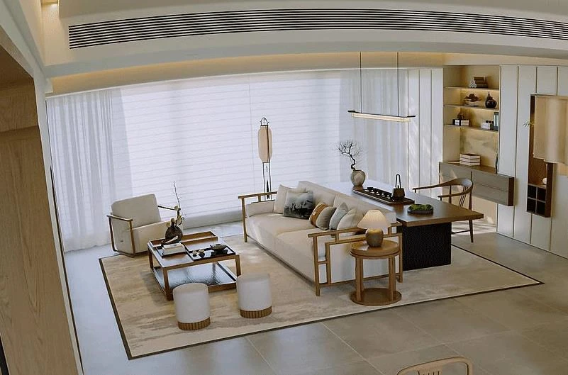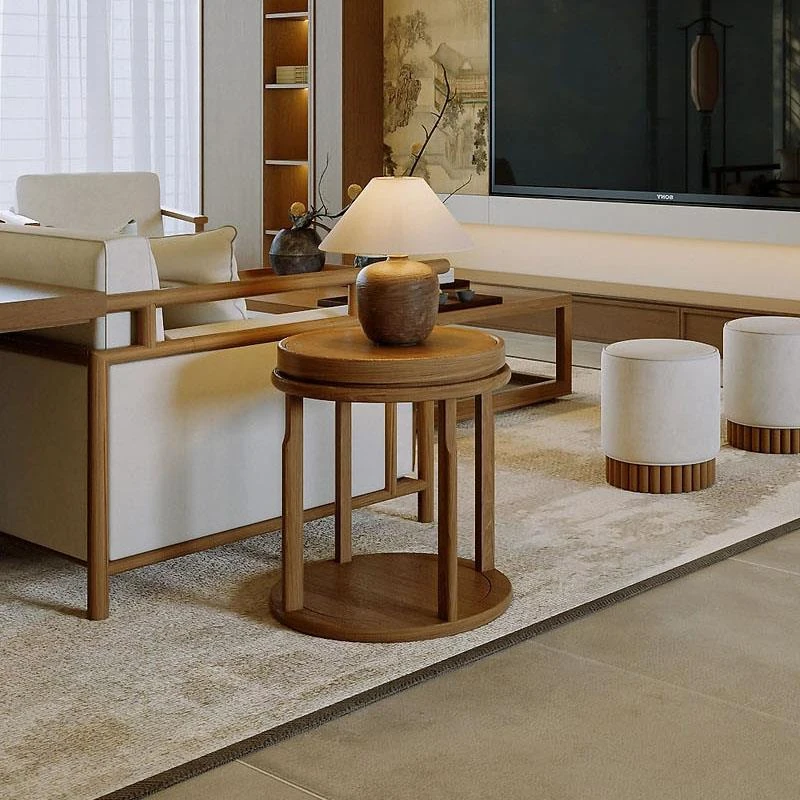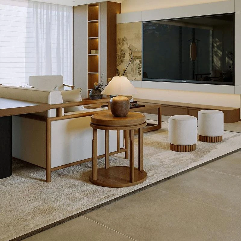 モダンでシンプルな新しい禅スタイルの家具サンプルルーム!小型住宅にぴったりな木製中華ソファセット。中式別荘の魅力を引き立てる、心安らぐリビング空間を実現します。