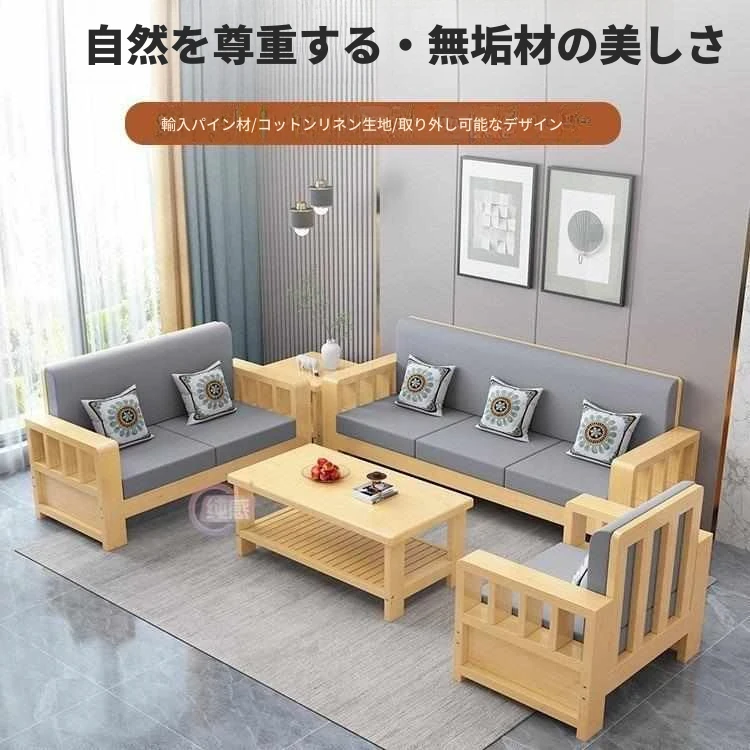 一人用+二人用+三人用+テーブル+サイドテーブル【#13】、クリア塗装のソファにクッション+背もたれ+抱き枕