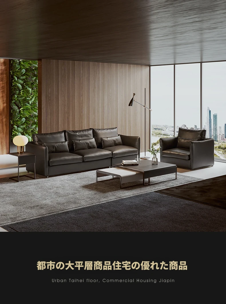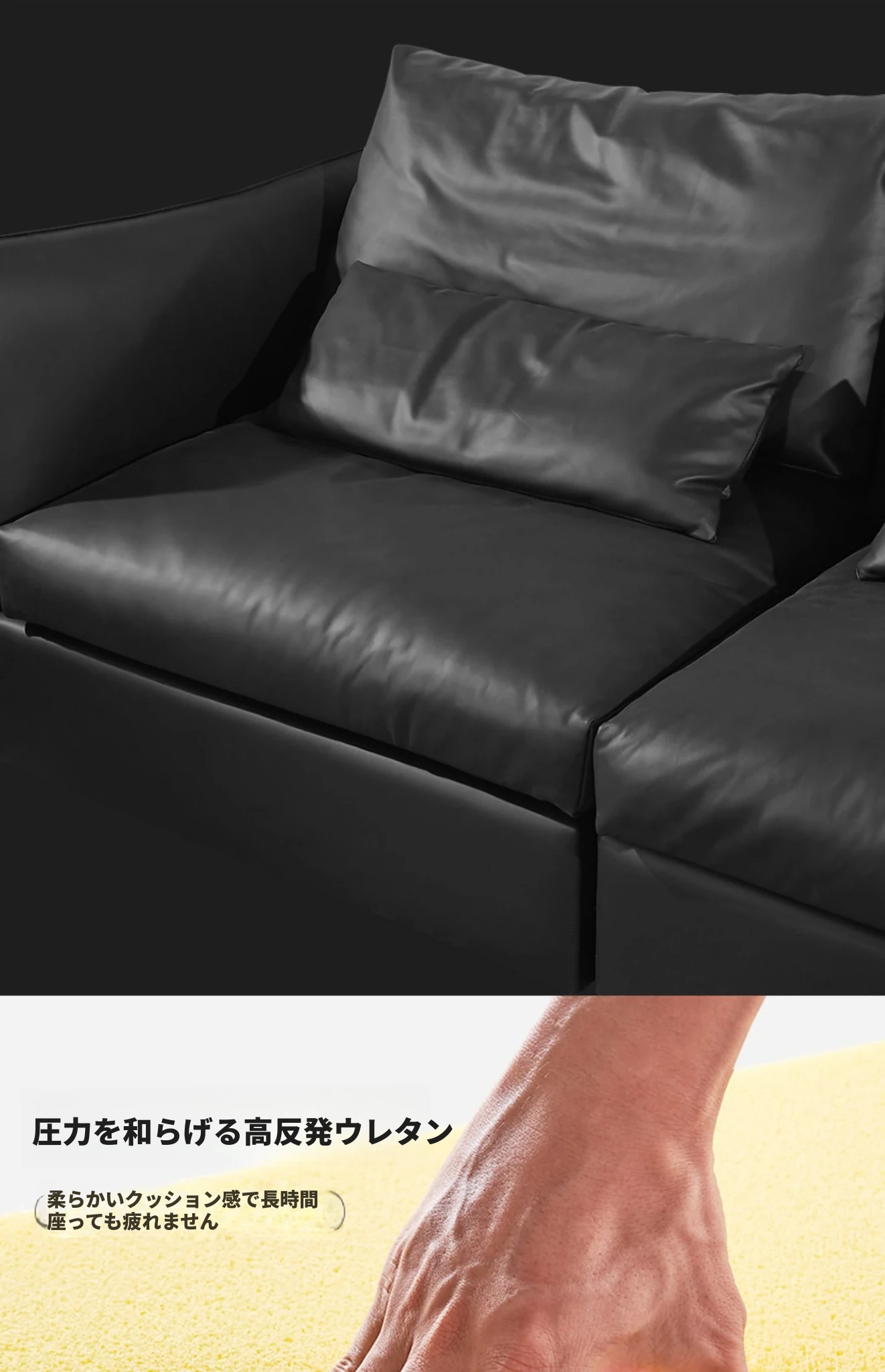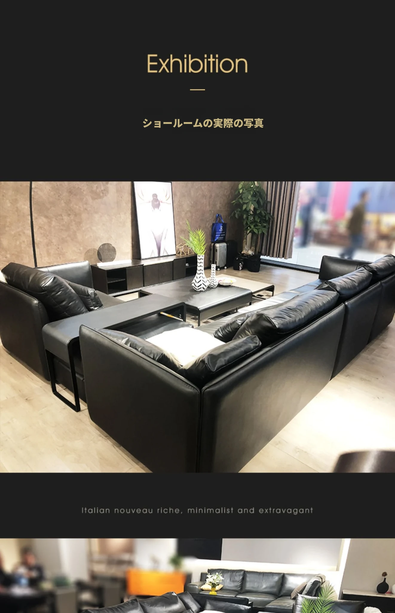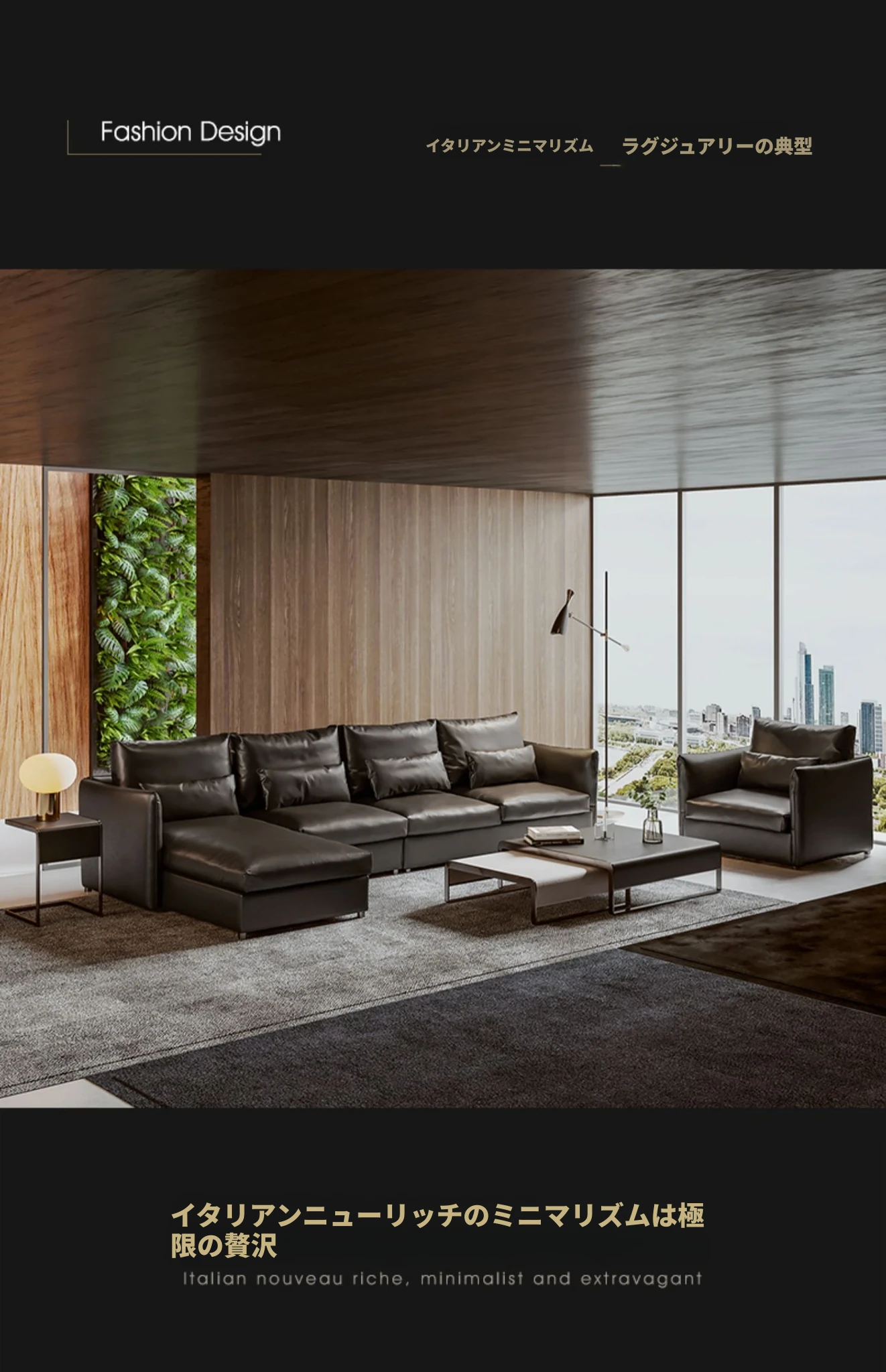 高級本革ソファー|一級牛皮使用のリビングルーム用ブラック直排ソファー|イタリアンミニマリズムの魅力|広東省仏山製|贅沢な空間を演出する最適アイテム!