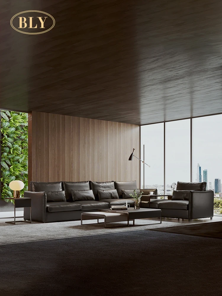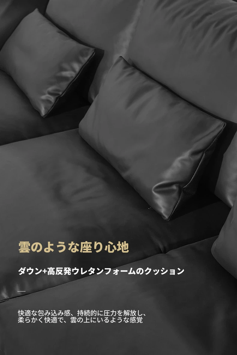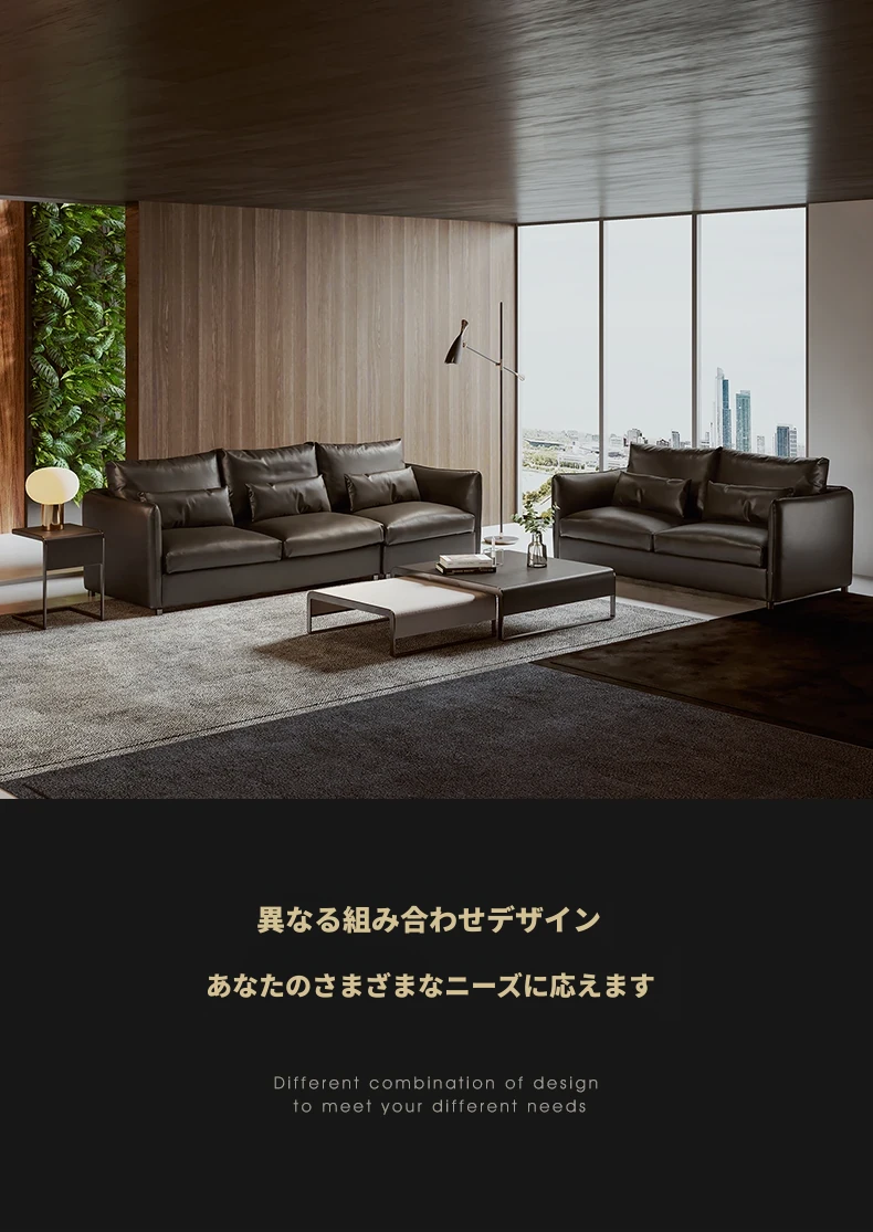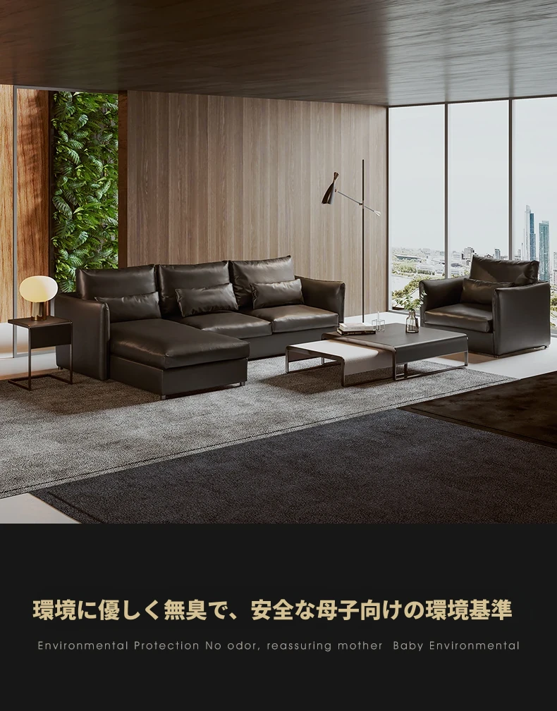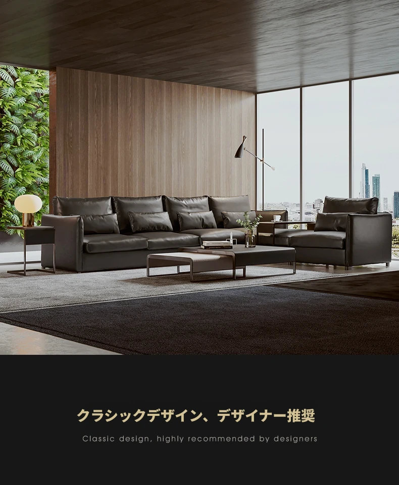 高級本革ソファー|一級牛皮使用のリビングルーム用ブラック直排ソファー|イタリアンミニマリズムの魅力|広東省仏山製|贅沢な空間を演出する最適アイテム!