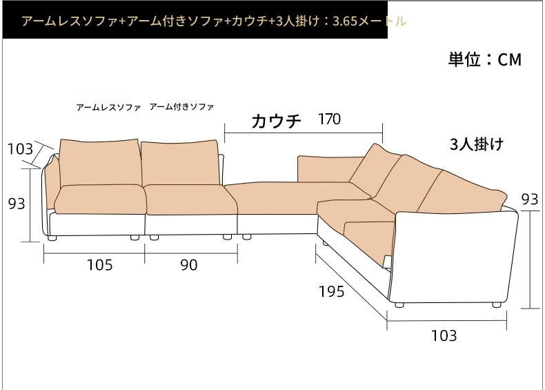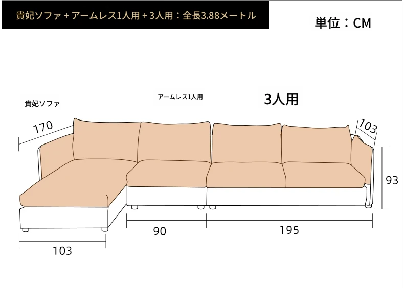 豪華版【接触面真皮】シングルアーム一人用+アームなし一人用+貴妃用+三人用365CM